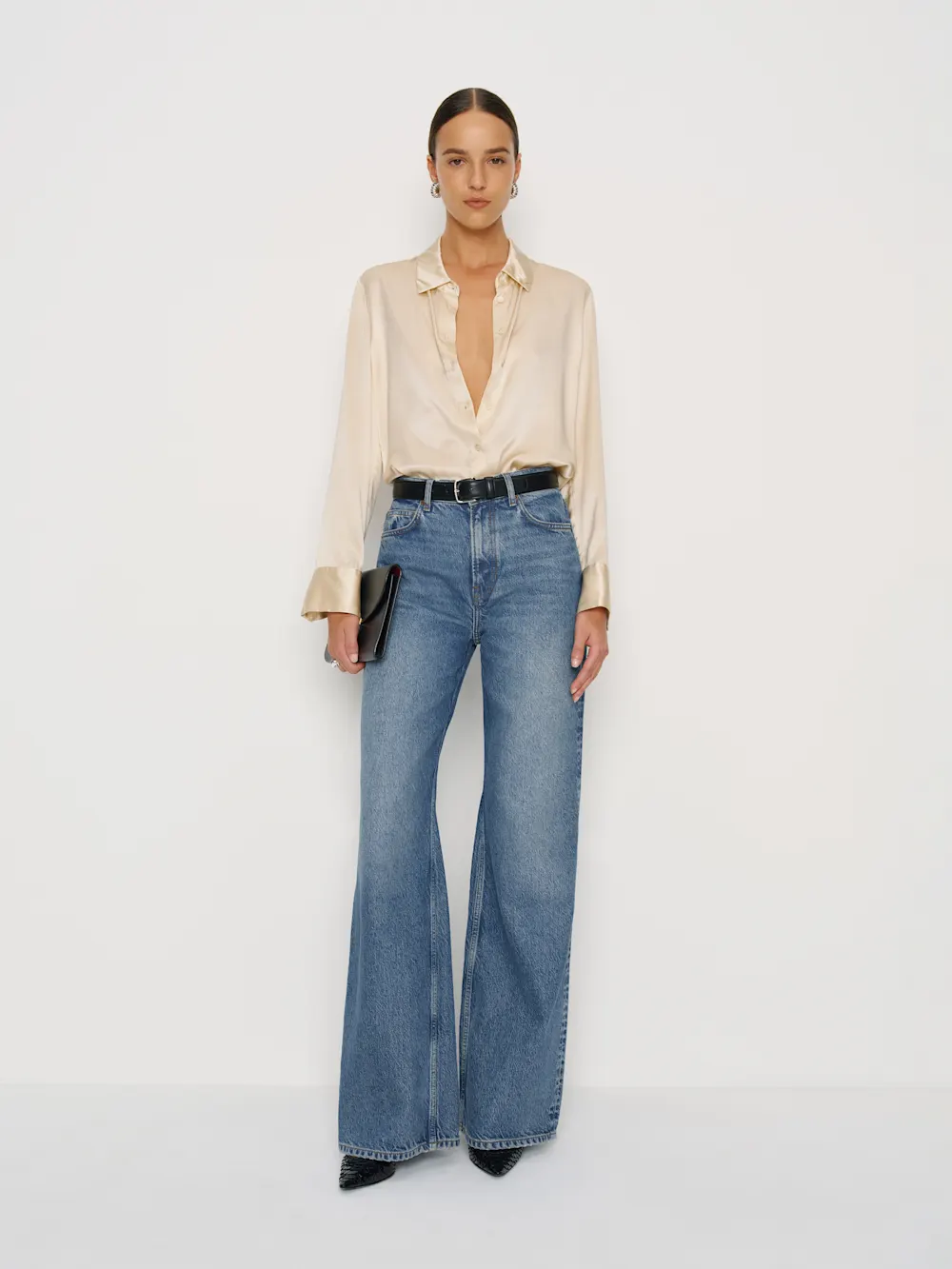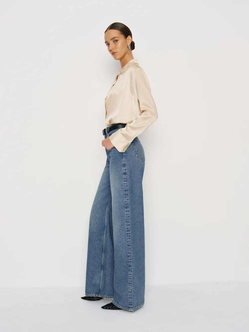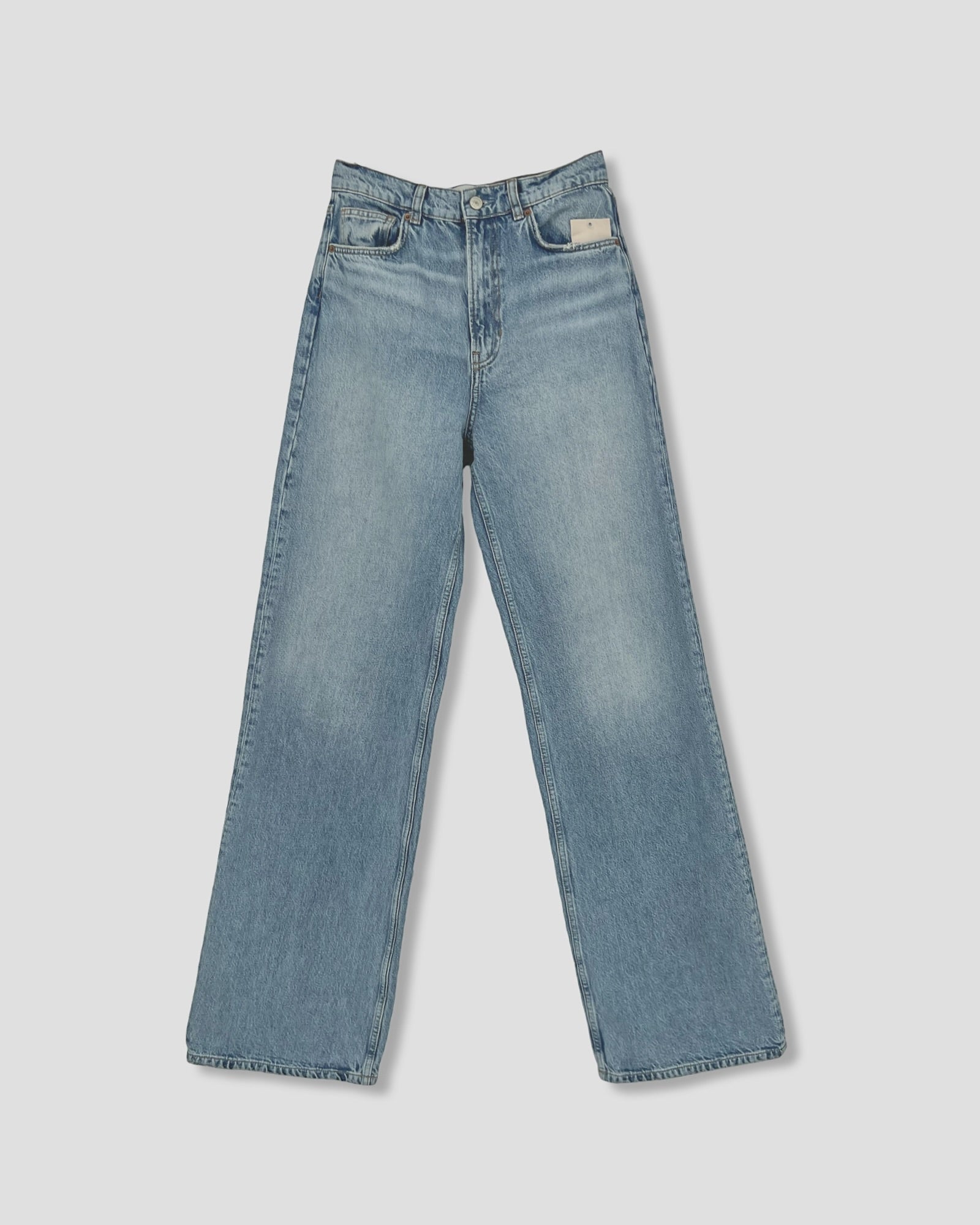 Details: This is a wide-leg, loose-fitting jean that sits at the natural waist and is cut to make your legs look super long. Made with rigid denim.