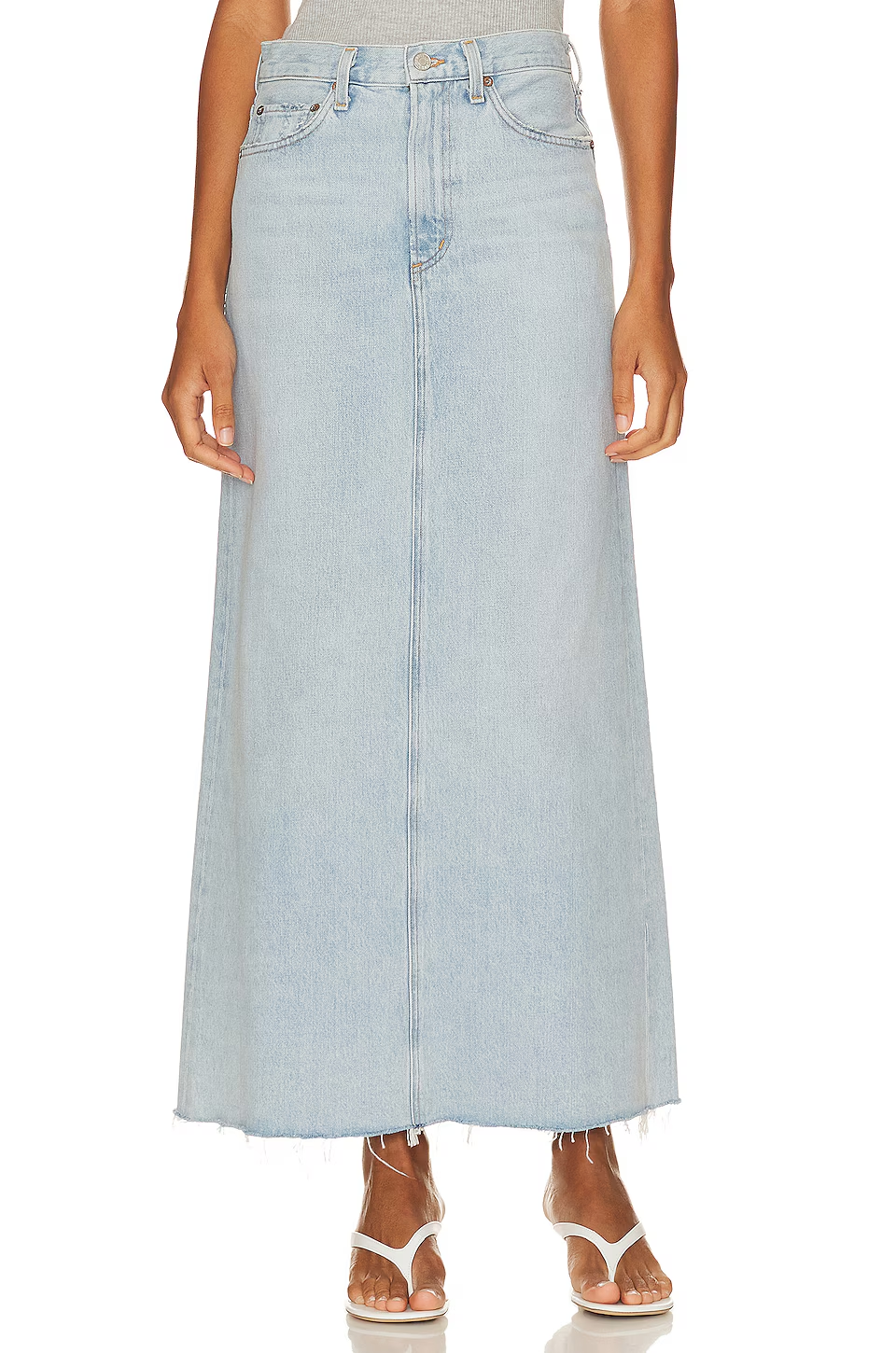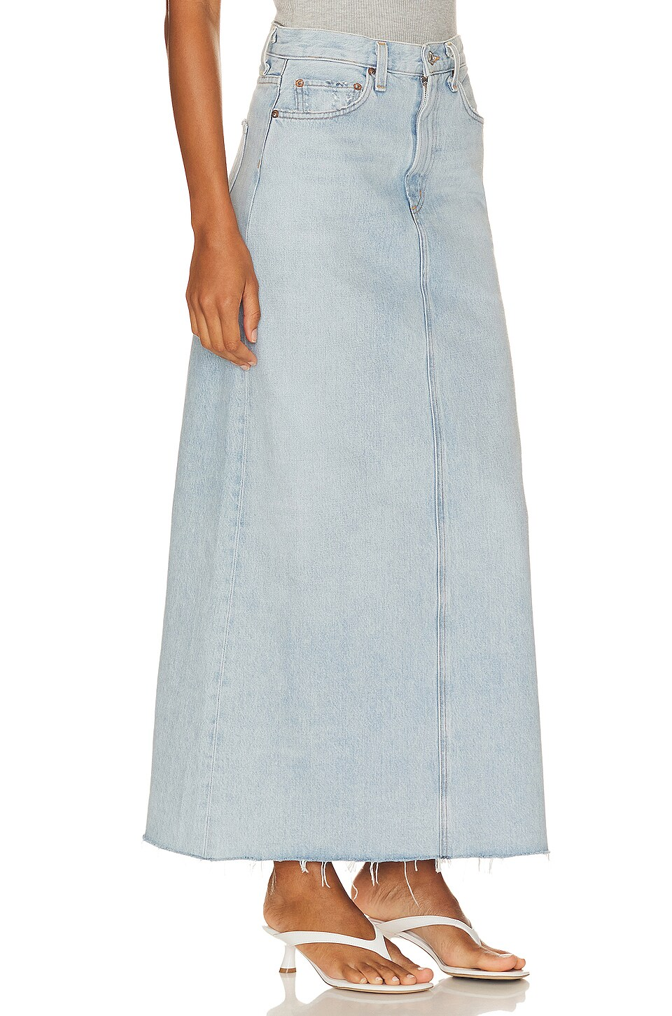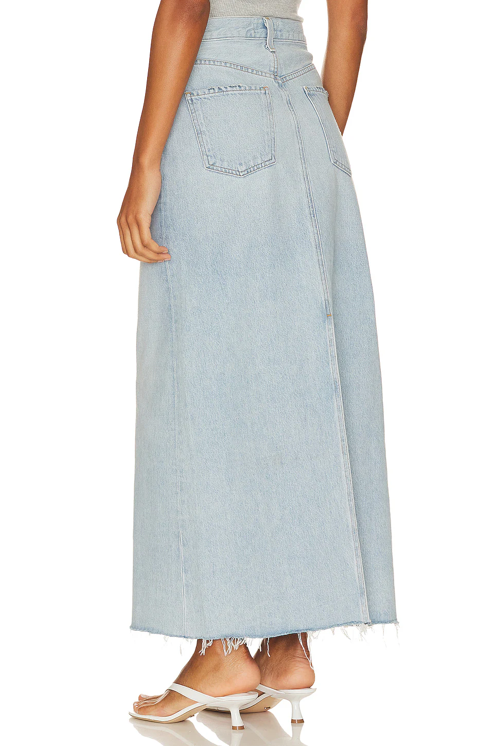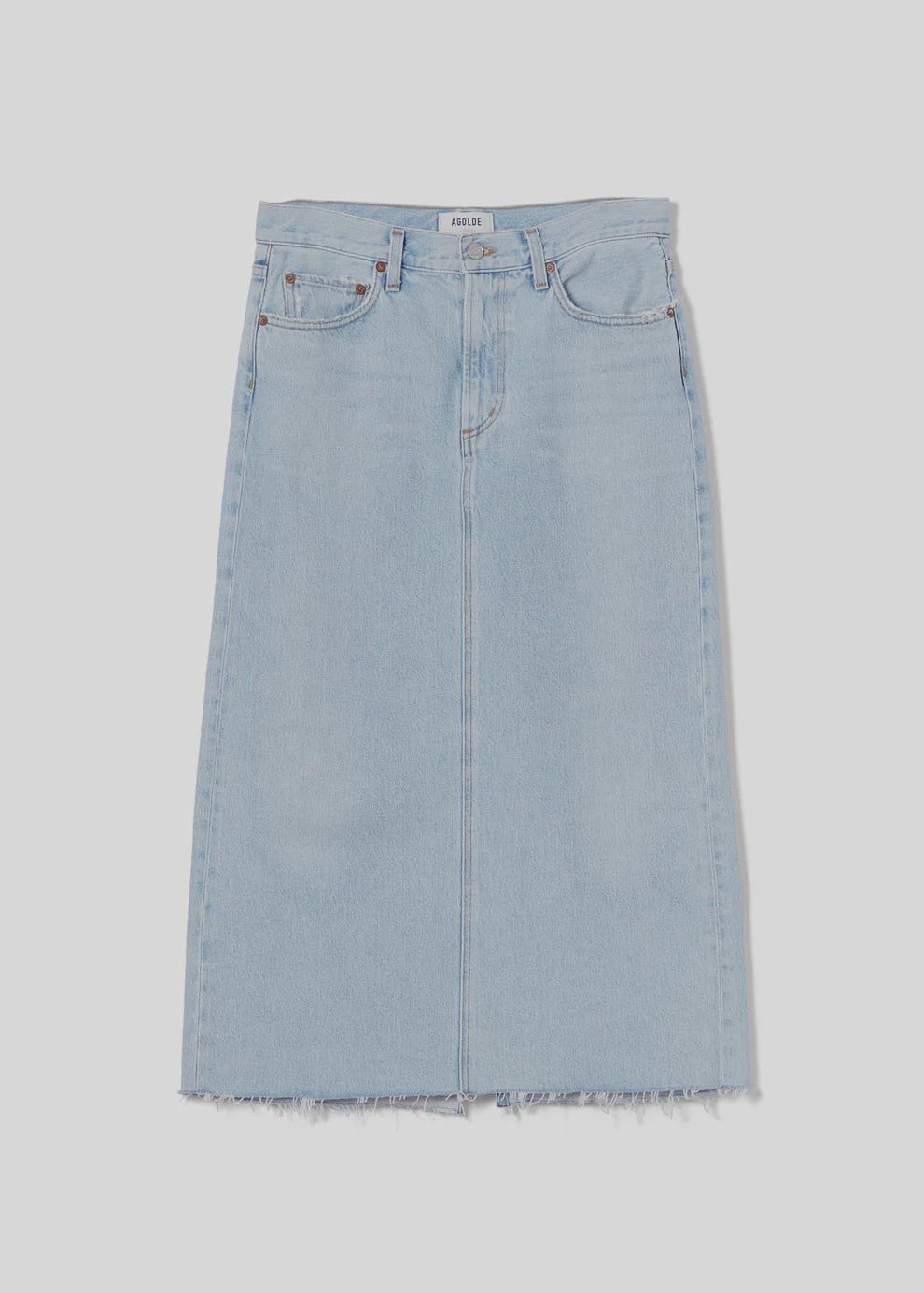 Details: This is a mid-rise denim skirt with a classic '90s silhouette and a back slit. It's crafted in the USA with soft, non-stretch denim made from 100% organic cotton.