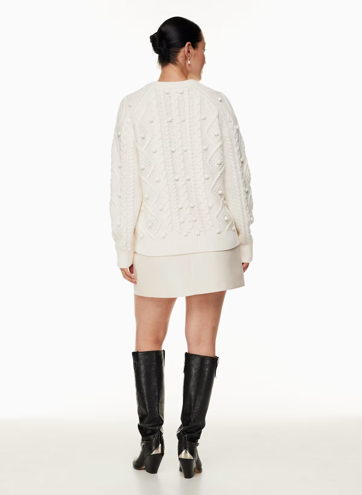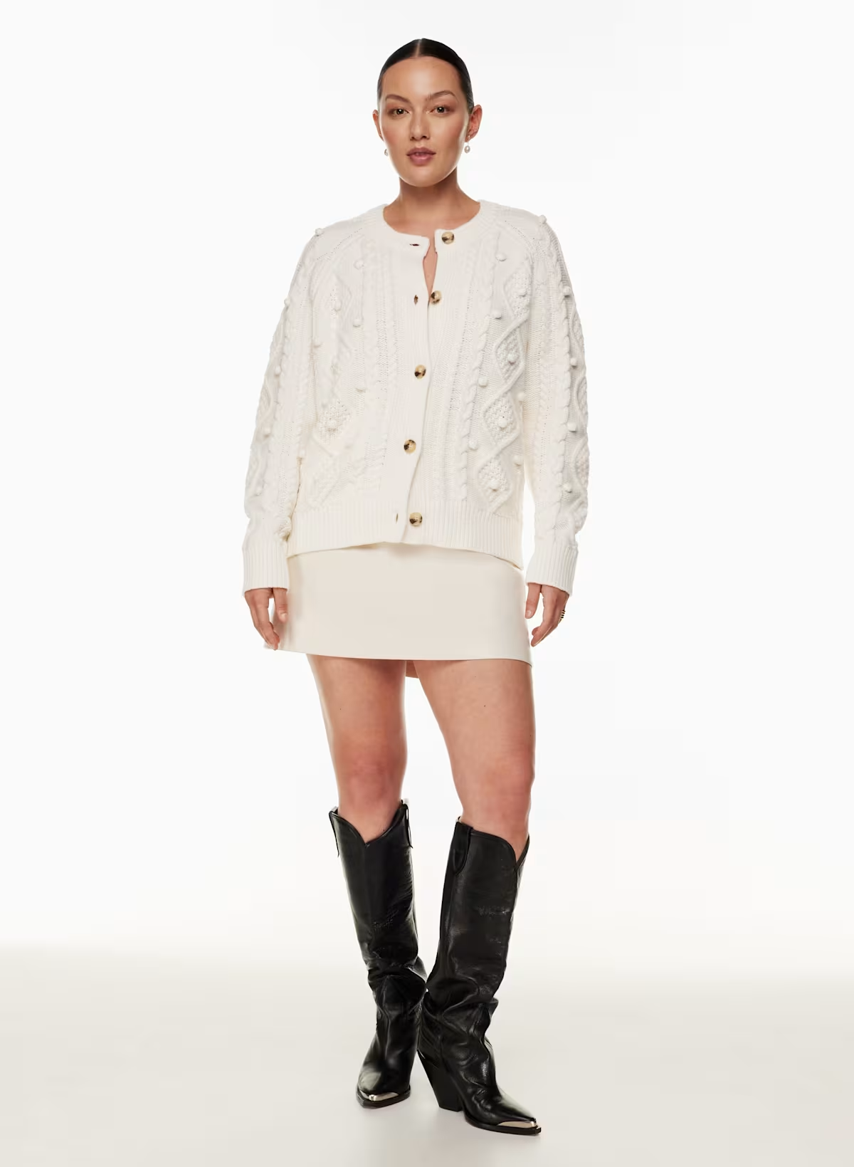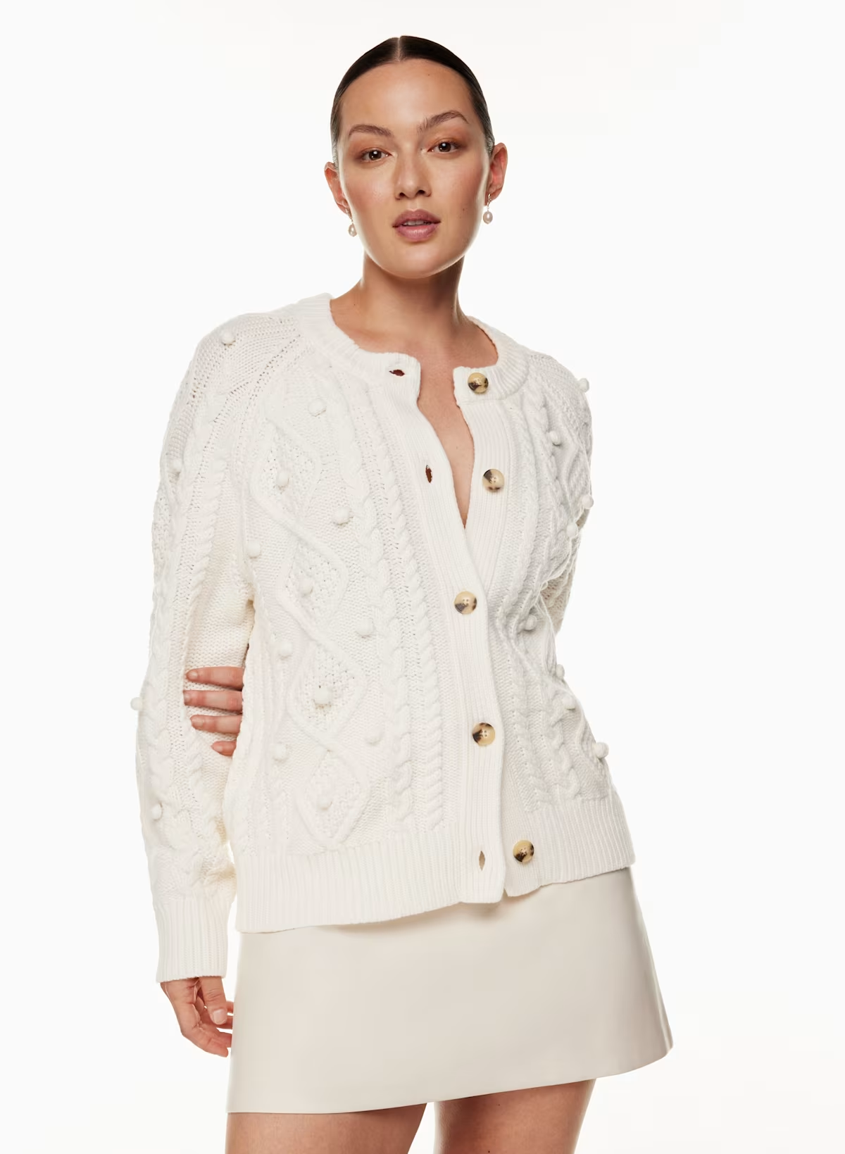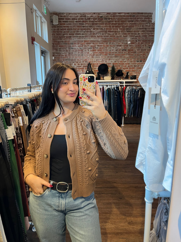 Details: This is a fully fashioned crew-neck cardigan with pom detailing and raglan sleeves. It's crafted with RePlay Wool — responsibly sourced extra-fine merino wool, recycled nylon, and organic cotton yarn that’s naturally warm with a soft feel. It's constructed with a Cable stitch in a unique, custom design for a chunky, three-dimensional look and texture.