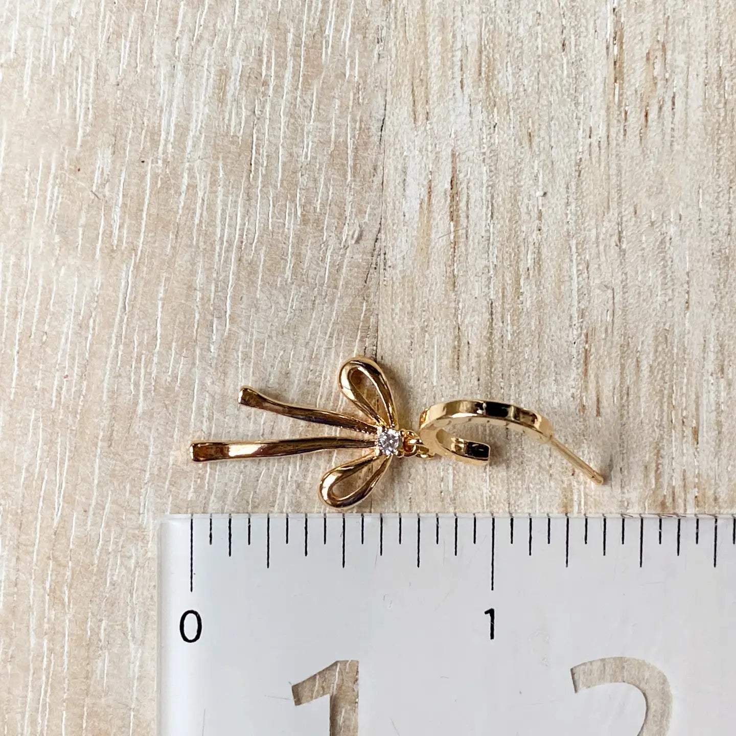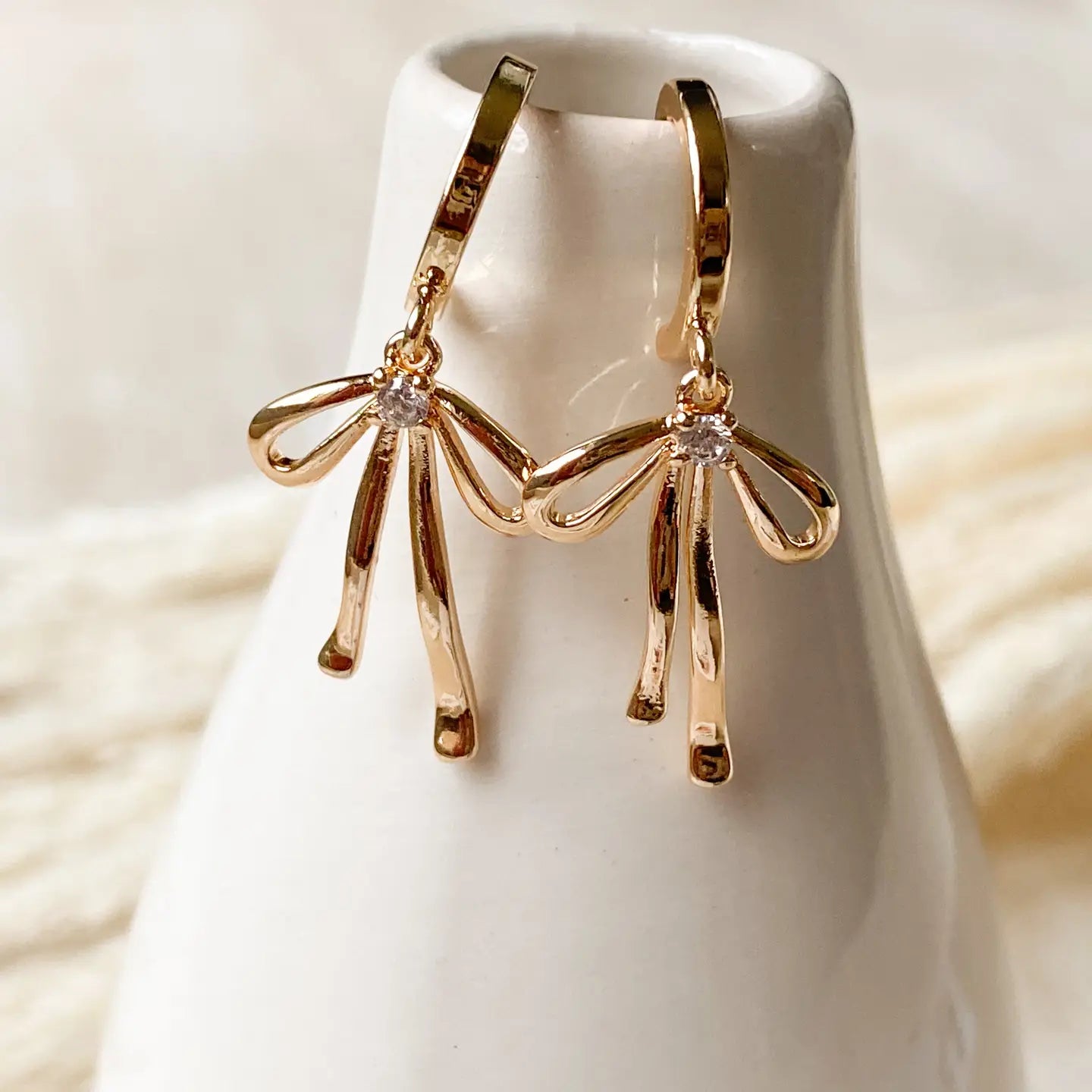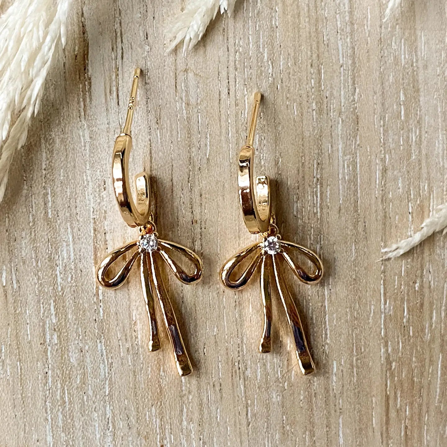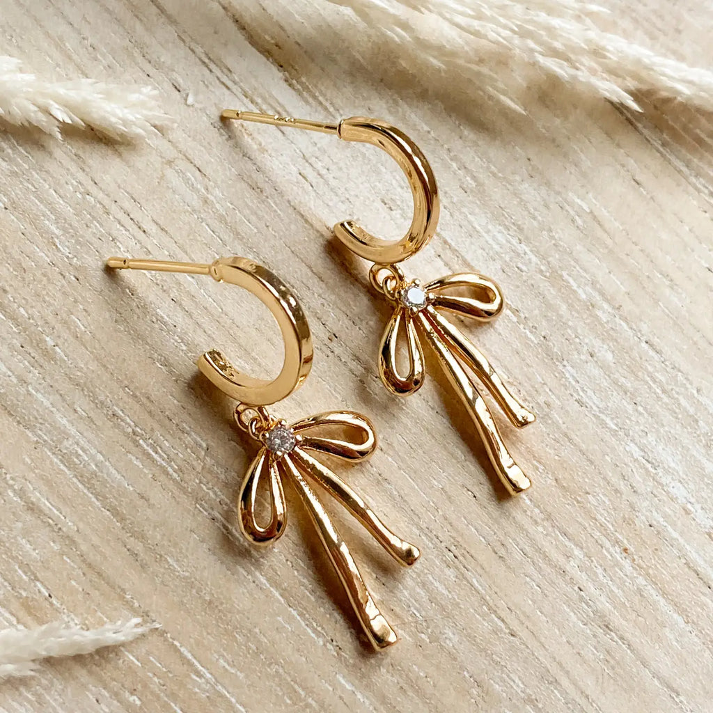 A stud style bow hoop that comes in both silver and gold. The bows each have their own cubic zirconia to give them that extra sparkle. The hoops are 18K Gold plated, nickel free, and approx. 12 mm in diameter.