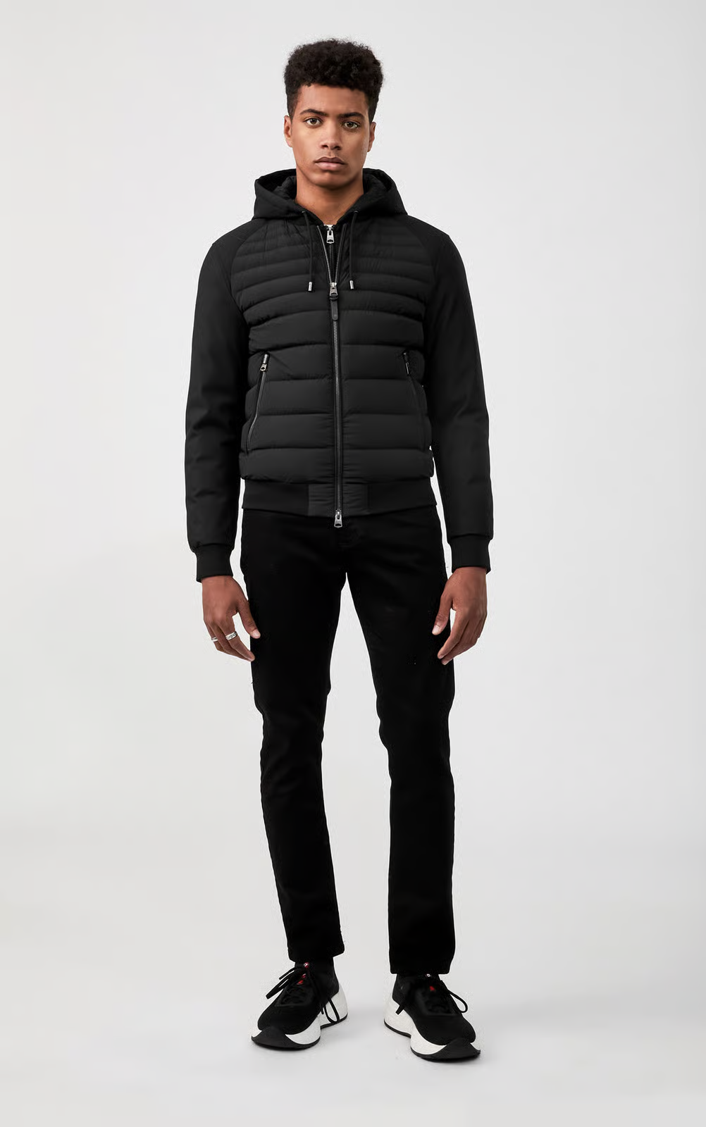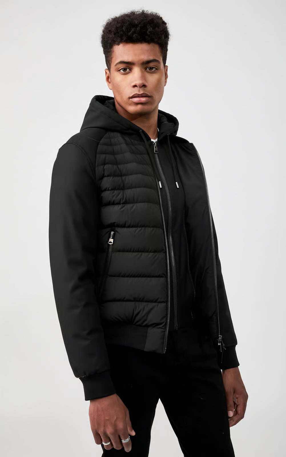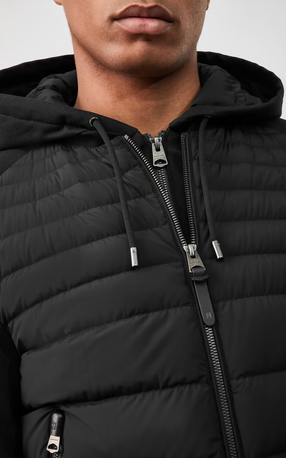 Details: ERYK by MACKAGE is a lightweight down jacket with two-way stretch. The yoke, hood and sleeves are made with birdseye fabric, and the jacket features zippered waist pockets. ERYK is water-repellent and breathable, with a removable bib and drawcord hood.