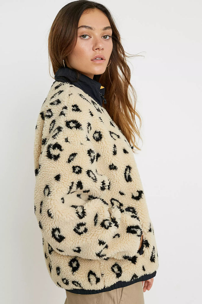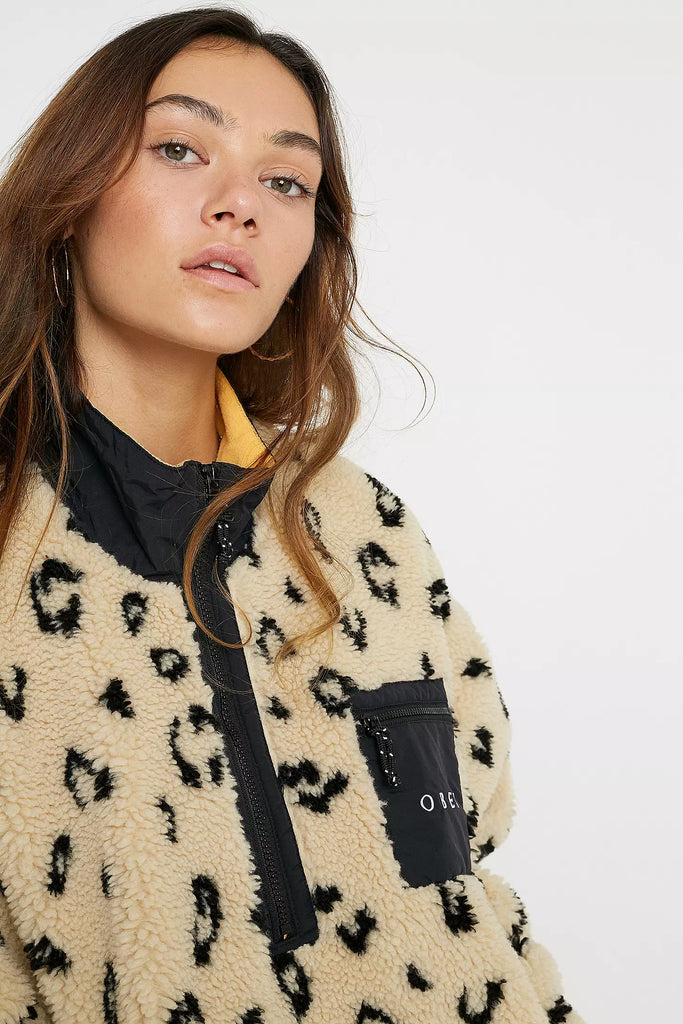 Details: Take on chilly weather with this leopard print fleece anorak from OBEY. Oversized fit with a sherpa construction and a half-zip on the front. Topped with a patch pocket and finished with elastic cuffs and hem.