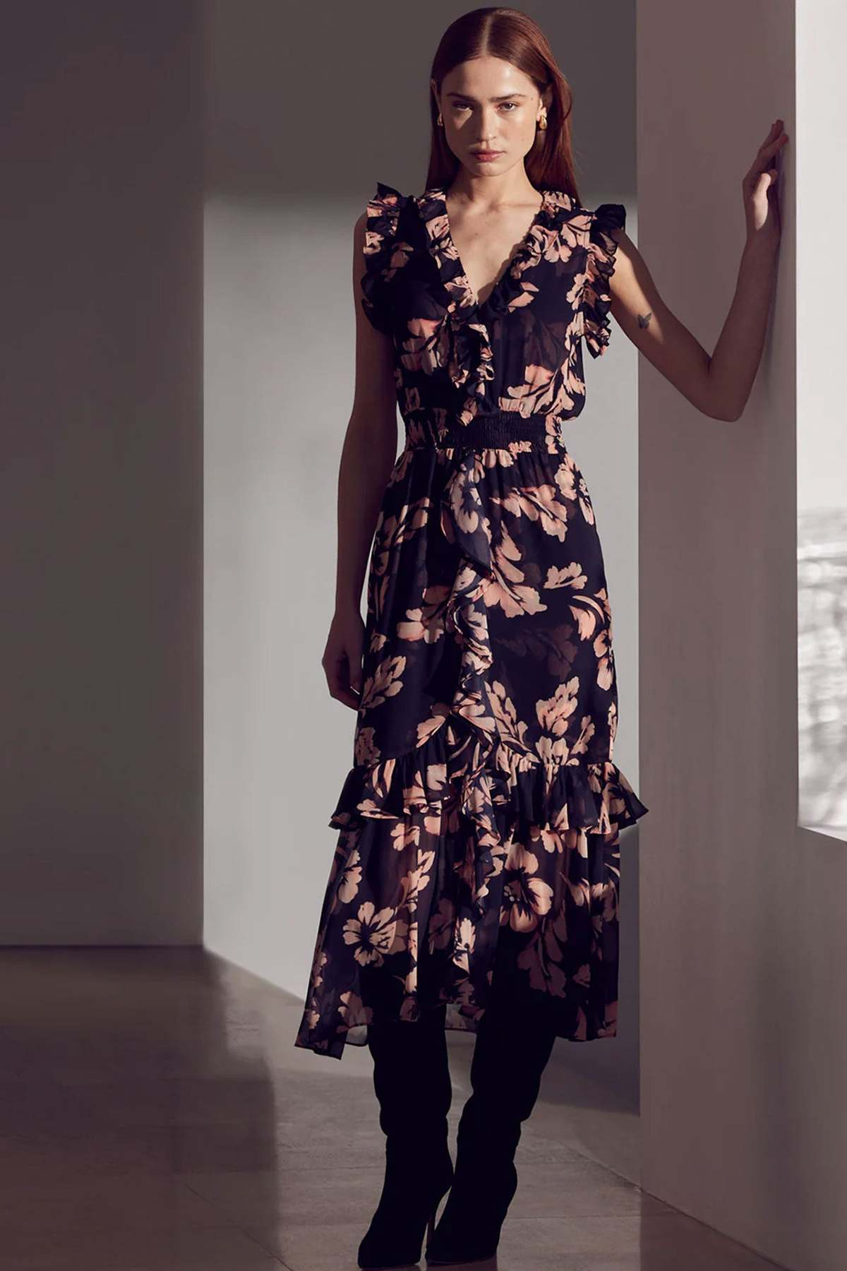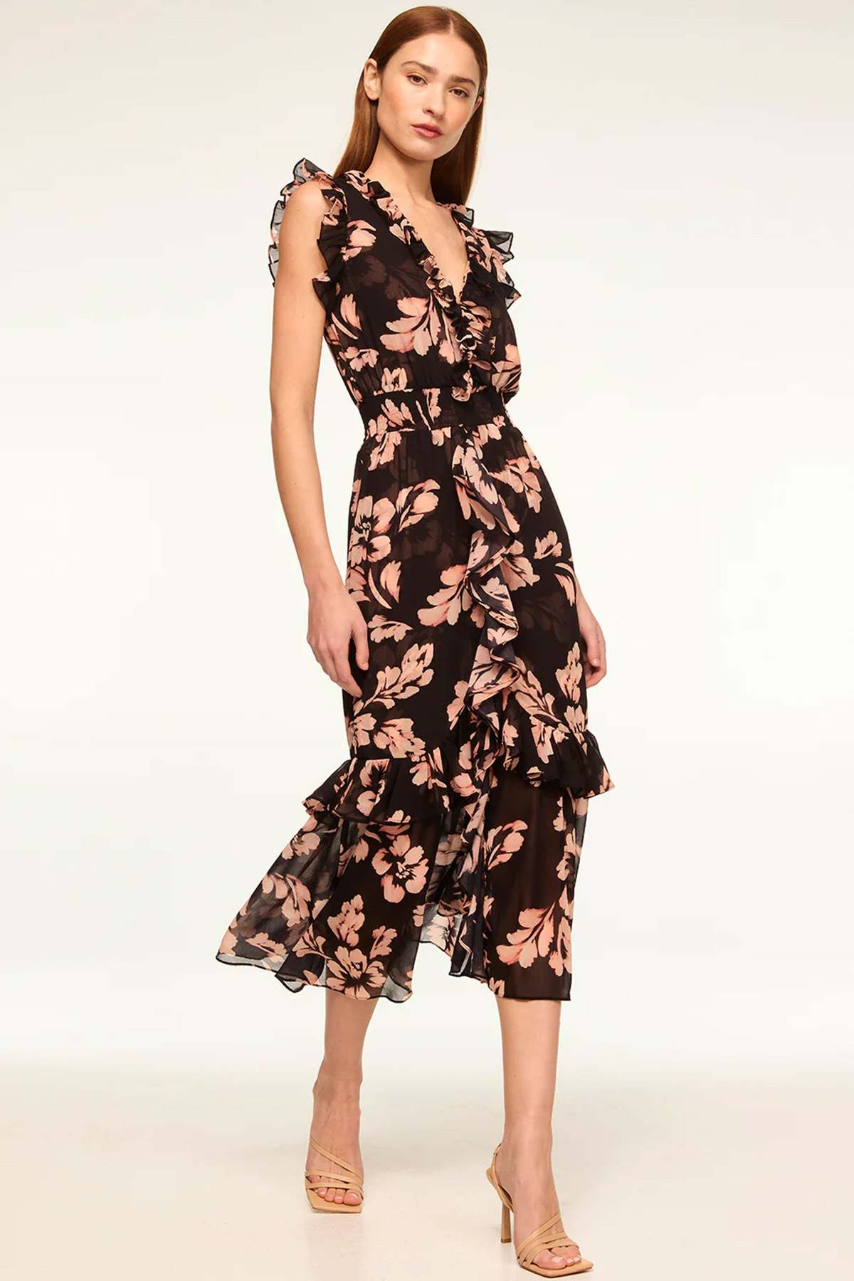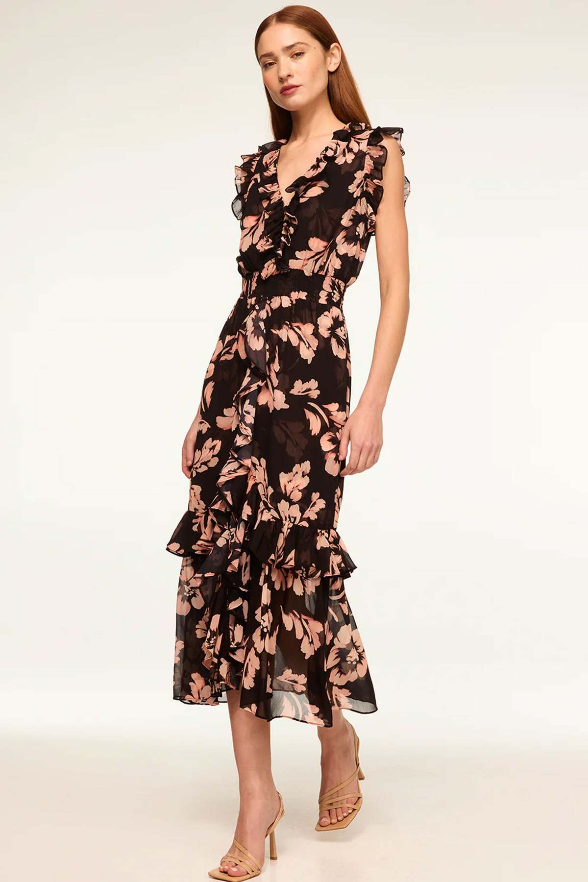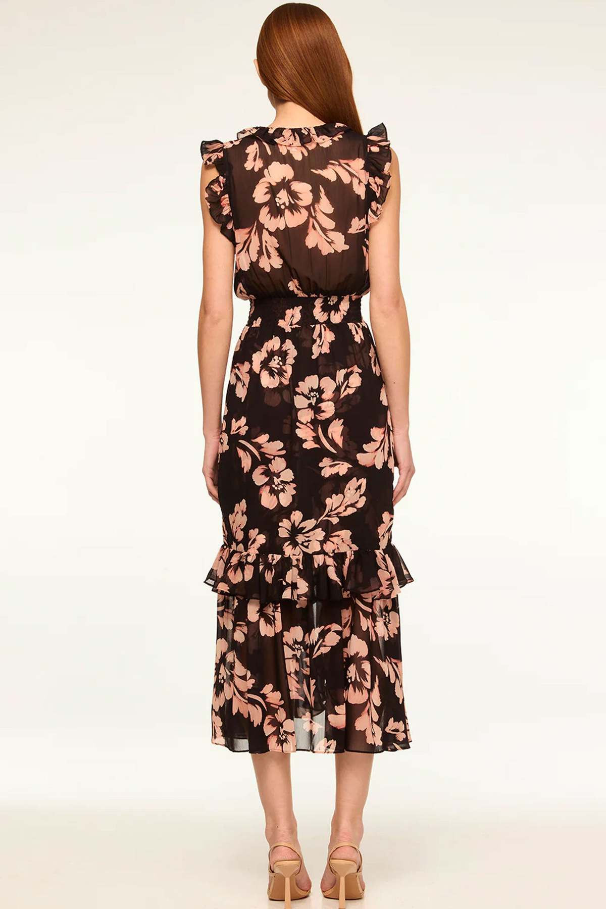 Details: The Kidada dress is a stylish, best-selling midi made from Auric Flora printed chiffon. It features a V-neckline with a hidden hook-and-eye closure, complemented by ruffle details at the shoulders and trim. A smocked waistband flatters the silhouette, flowing into a cascade of ruffled skirt tiers for a chic, feminine look. Perfect for versatile occasions.