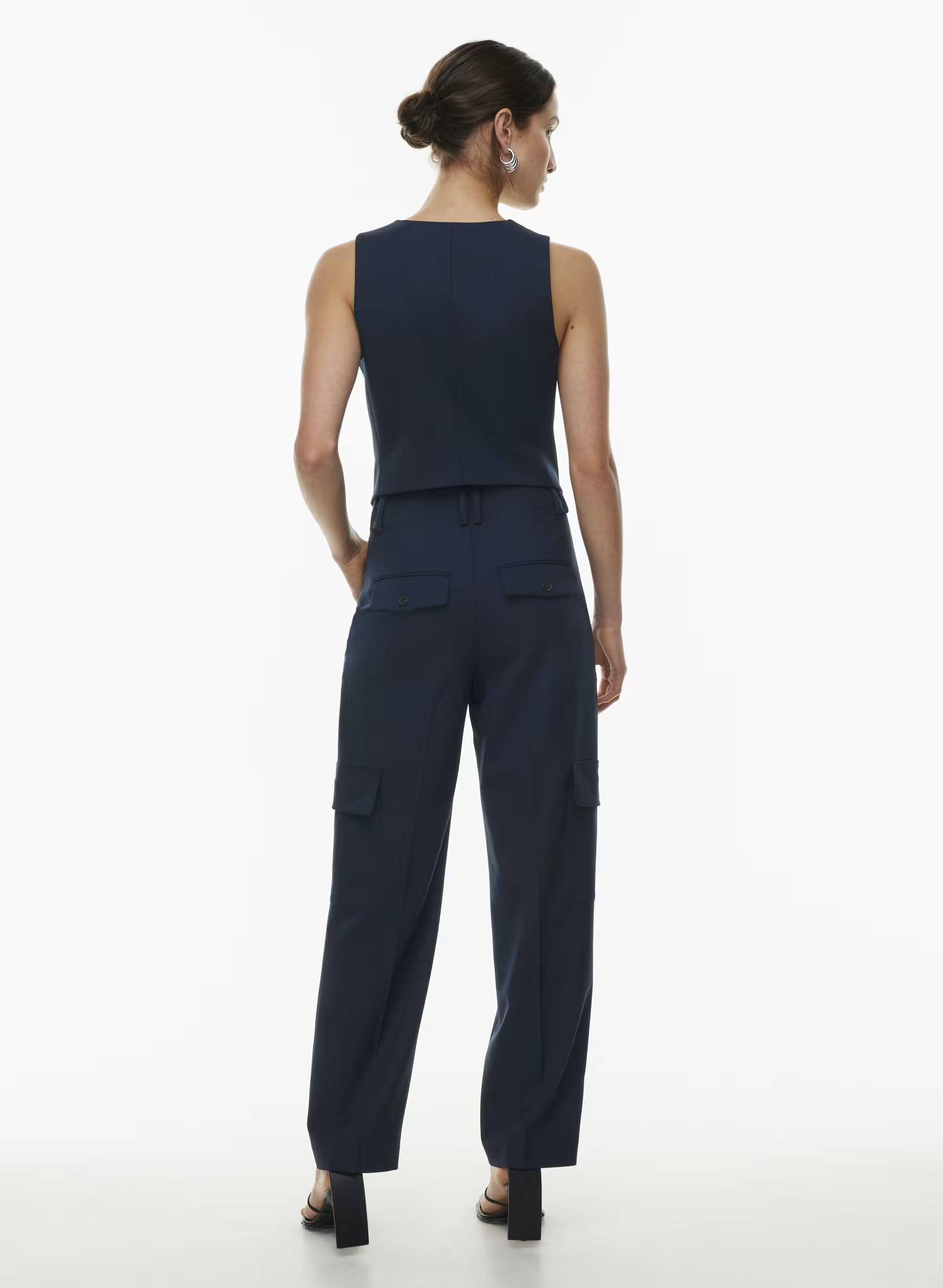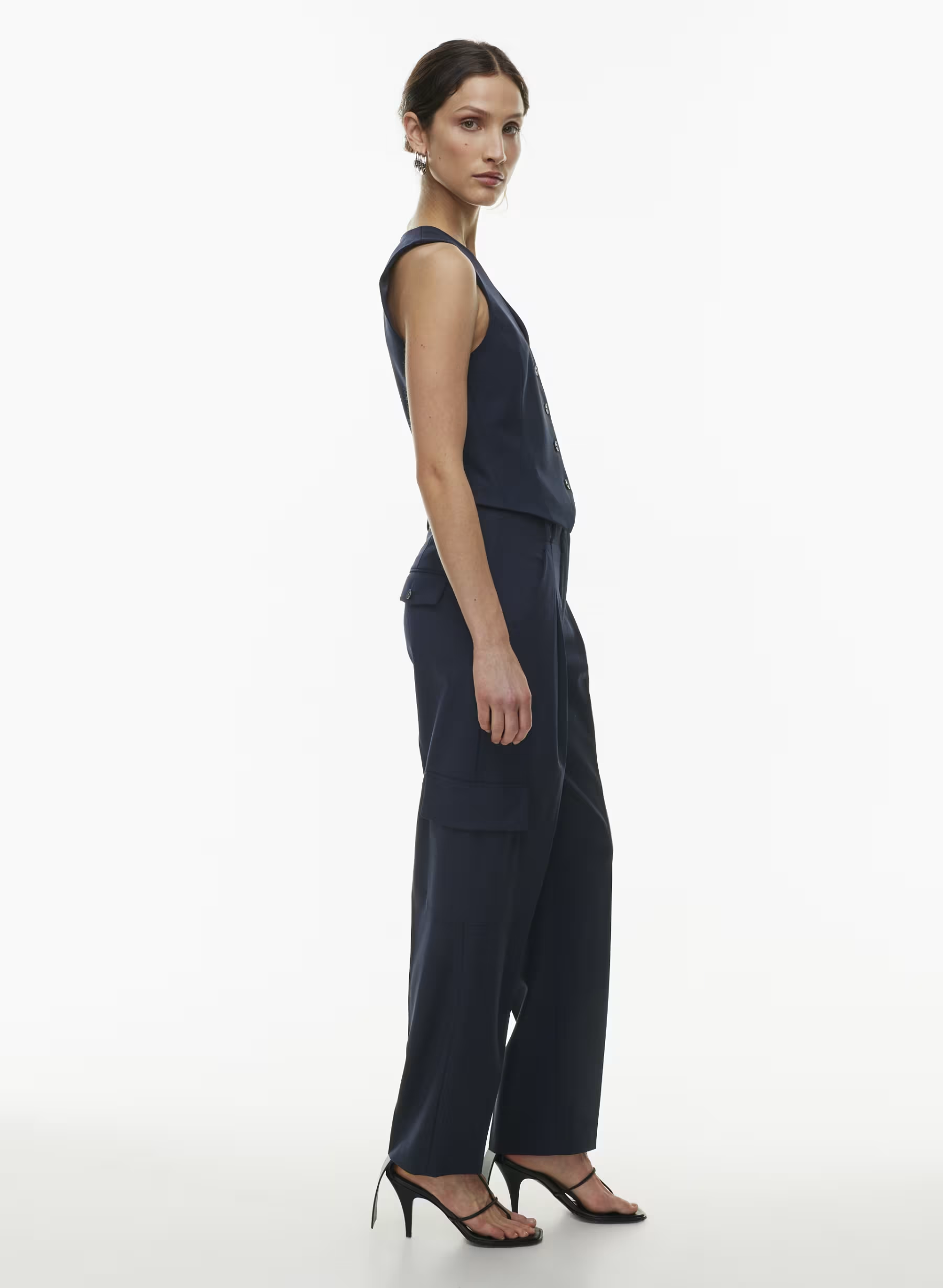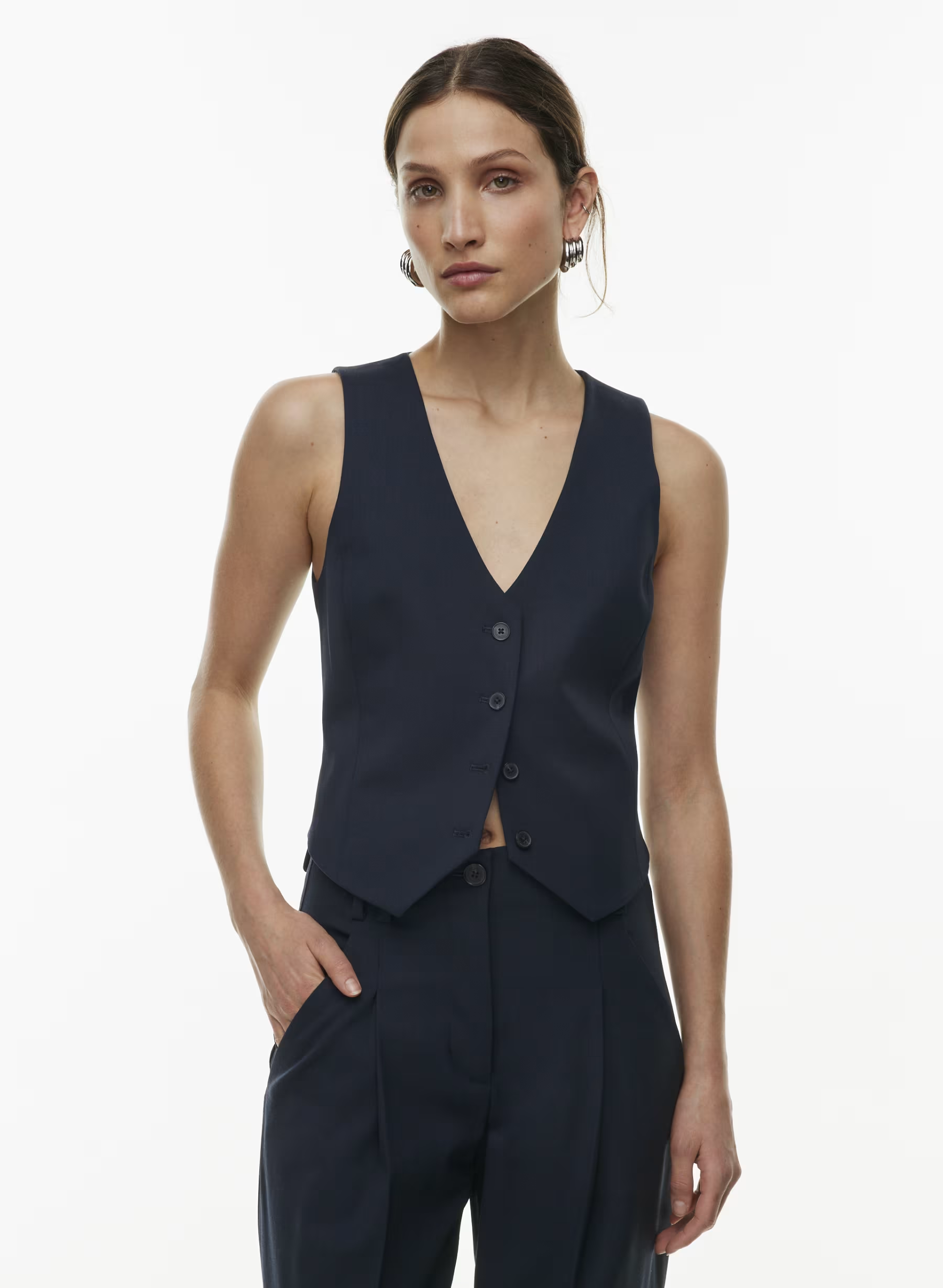Details: This is a classic button-up vest with princess seams for shaping. It’s expertly tailored with City Wool — softly structured stretch wool twill for all-season, all-city wearability. It’s sourced from a premier Italian mill.