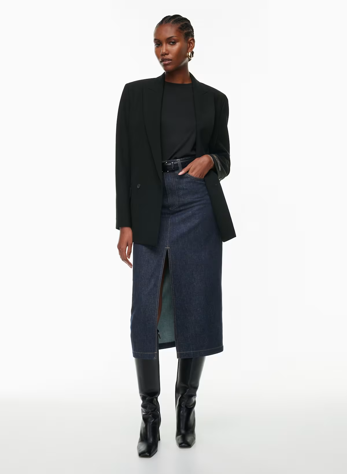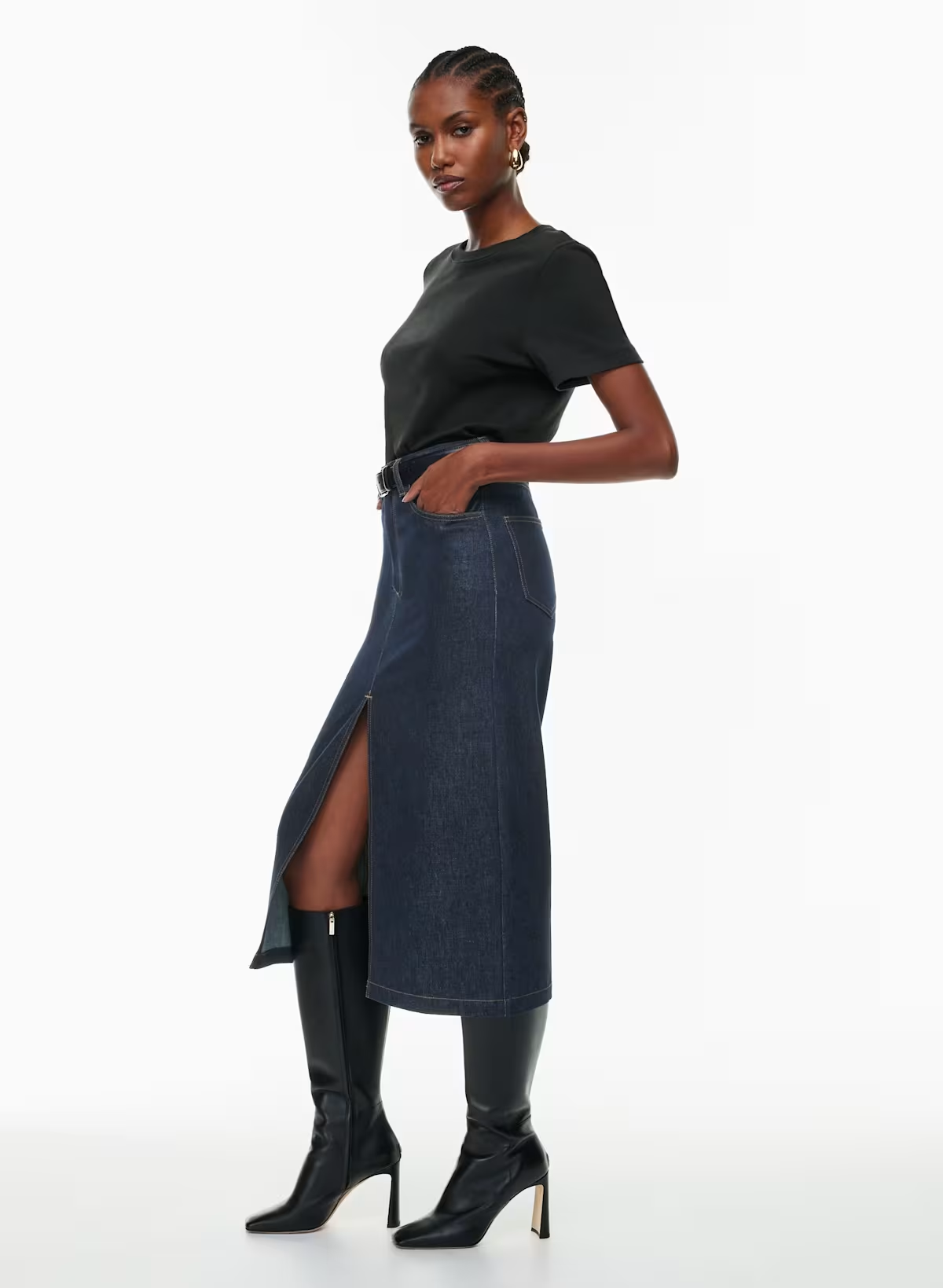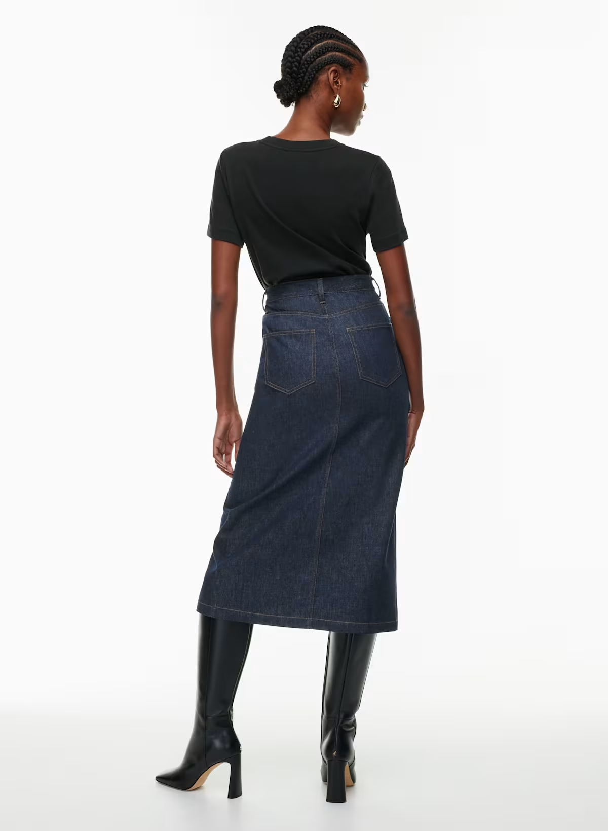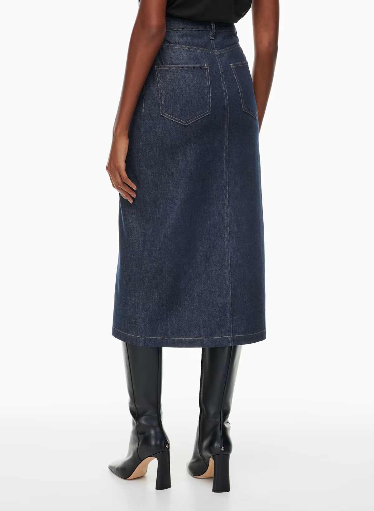 Details: This is a denim skirt with scoop front pockets, back patch pockets and a centre front slit.