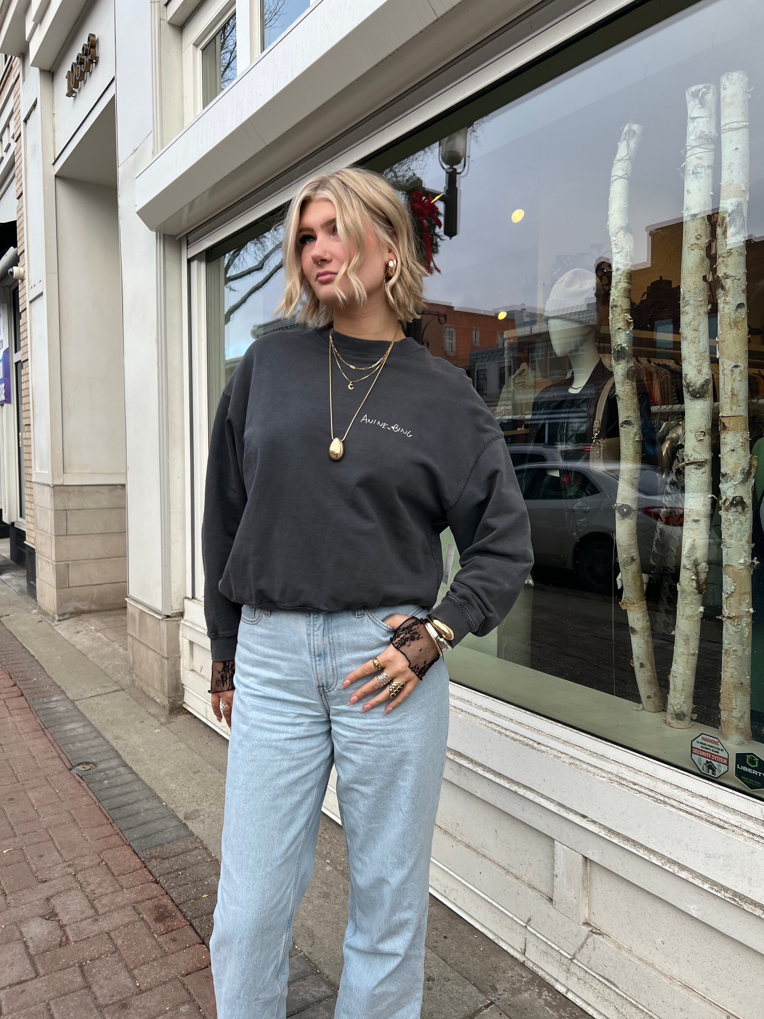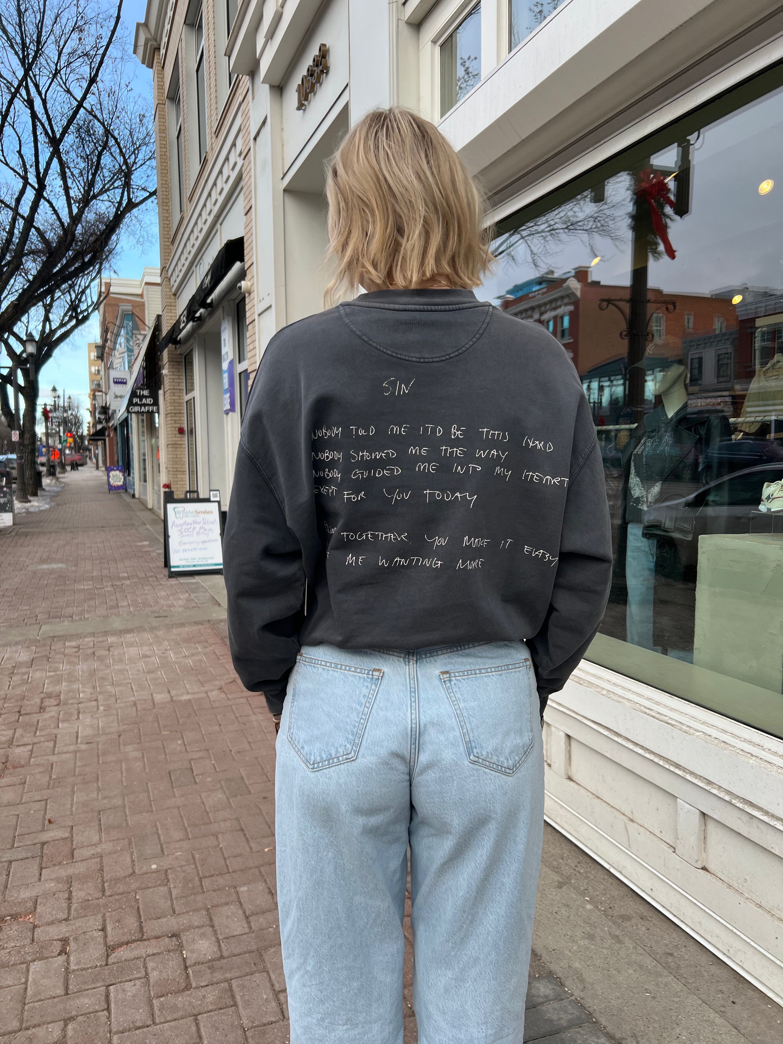 Details: The Jaci Sweatshirt Lyrics is an oversized crewneck pullover made from midweight 100% cotton French terry in washed black. This cozy separate features a handwritten graphic screen printed at the wearer's left chest and handwritten "Sin" lyrics off of Anine's album THERAPY across the back in contrast white.