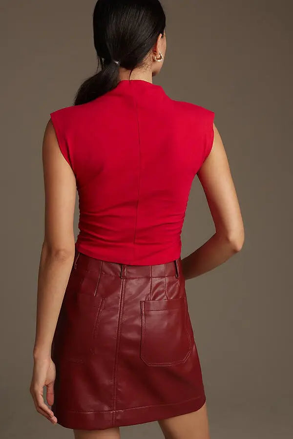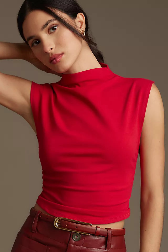 Details: Easy little number. The Lindy is a fitted, cropped top with cap sleeves. It has light ruching on the sides and a high, mock neckline. It gives you a little shape in the areas where you might want it.