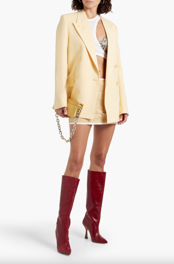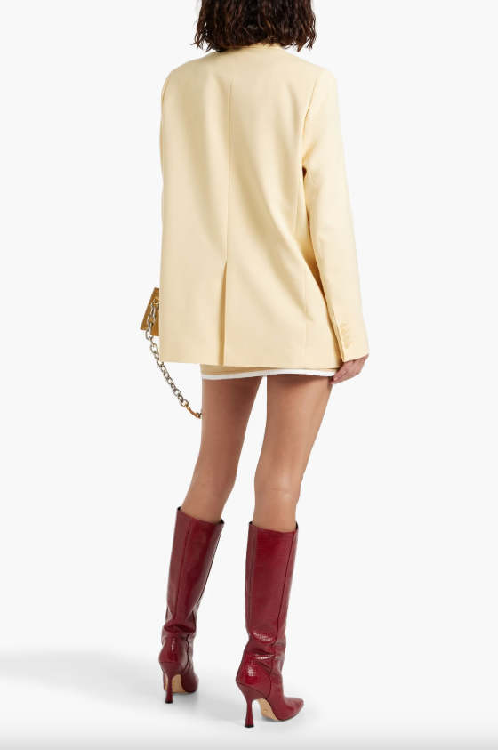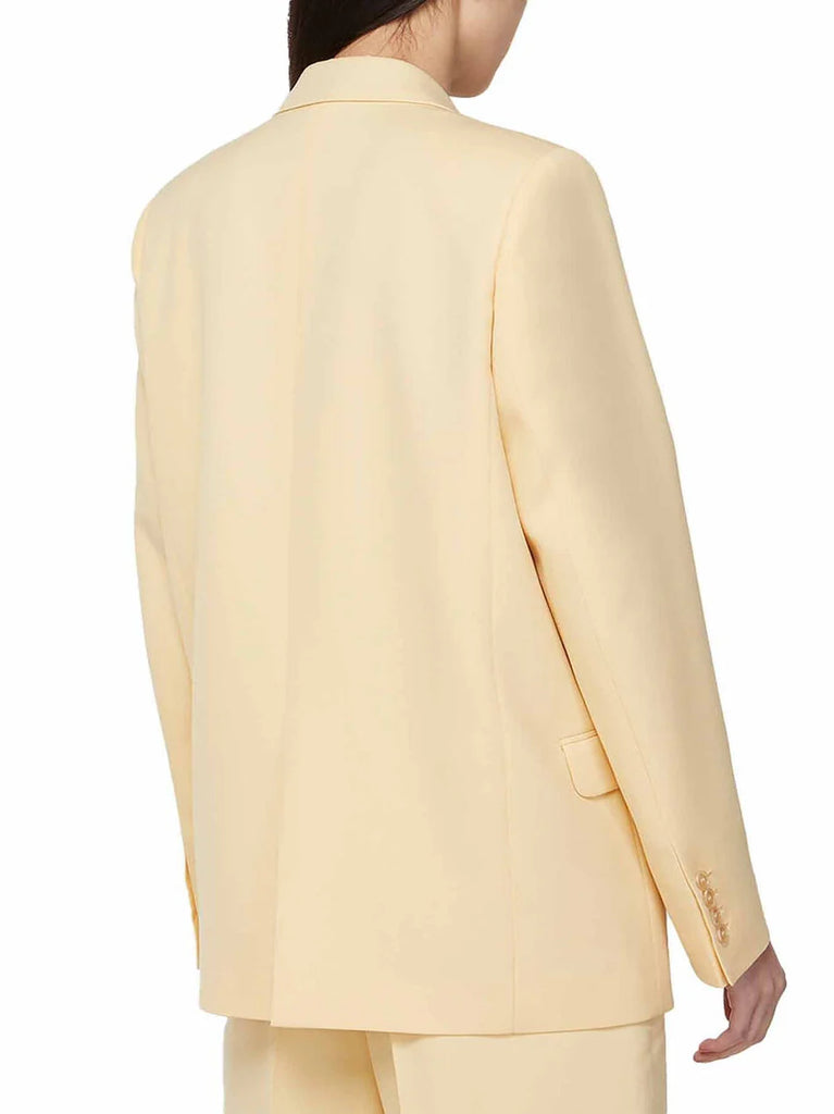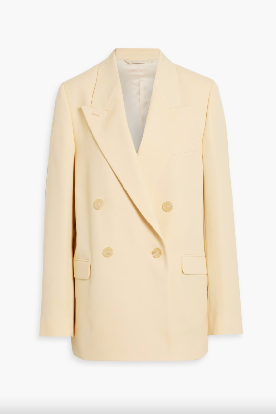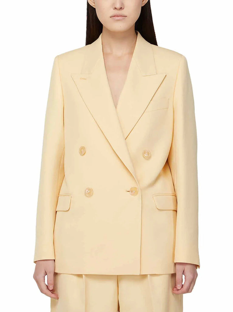 Details: This women's collection double-breasted blazer by Acne Studios is crafted from a blended fabric and features peak lapels, front button closure, chest pocket, front pockets, buttoned cuffs and back vent.