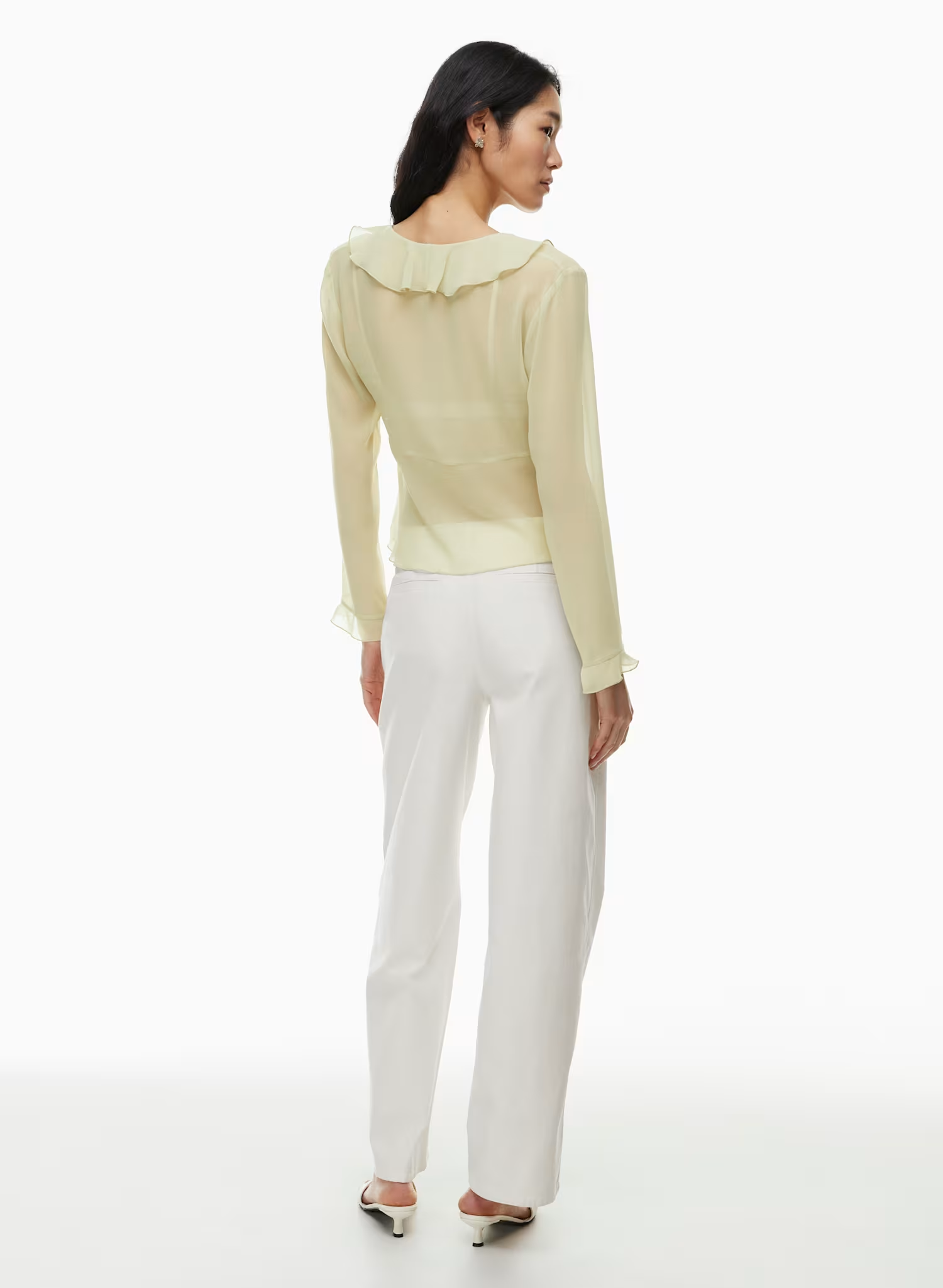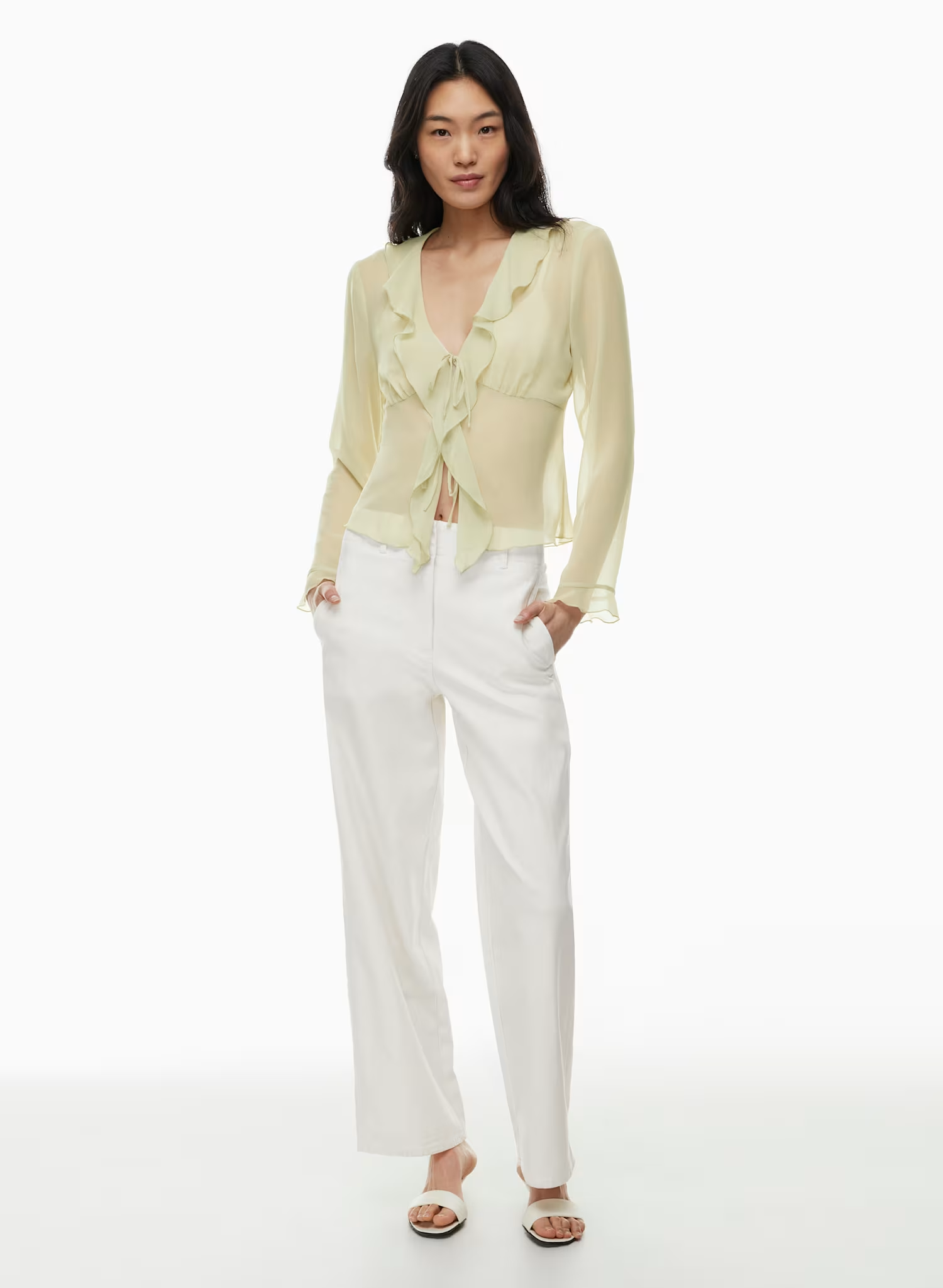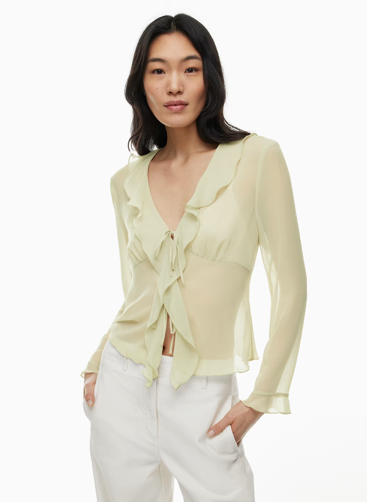 This is a V-neck blouse with ruffled edges and a tie closure. It’s made with Fête Chiffon™ — lightweight, semi-sheer fabric with an ethereal drape.