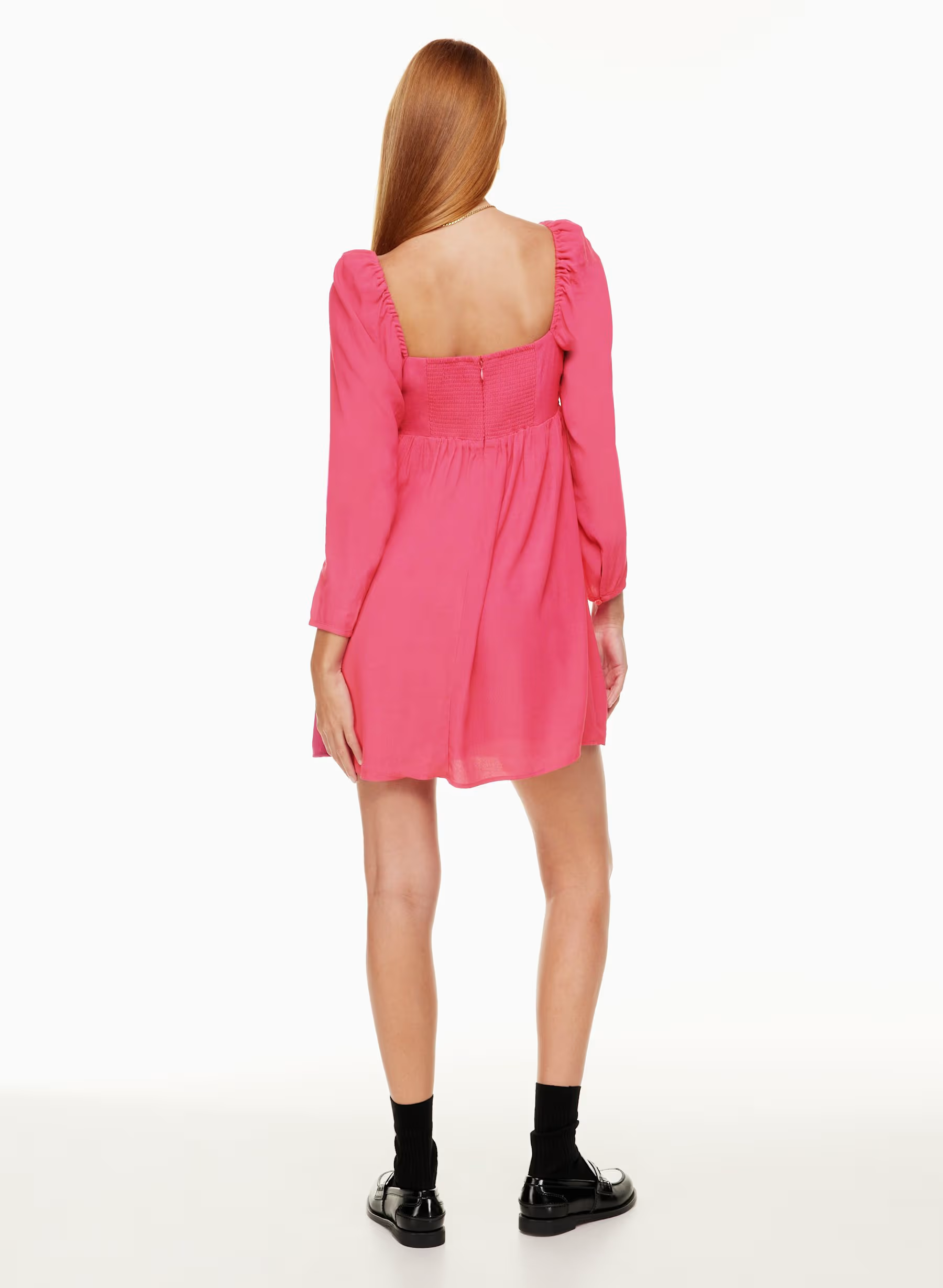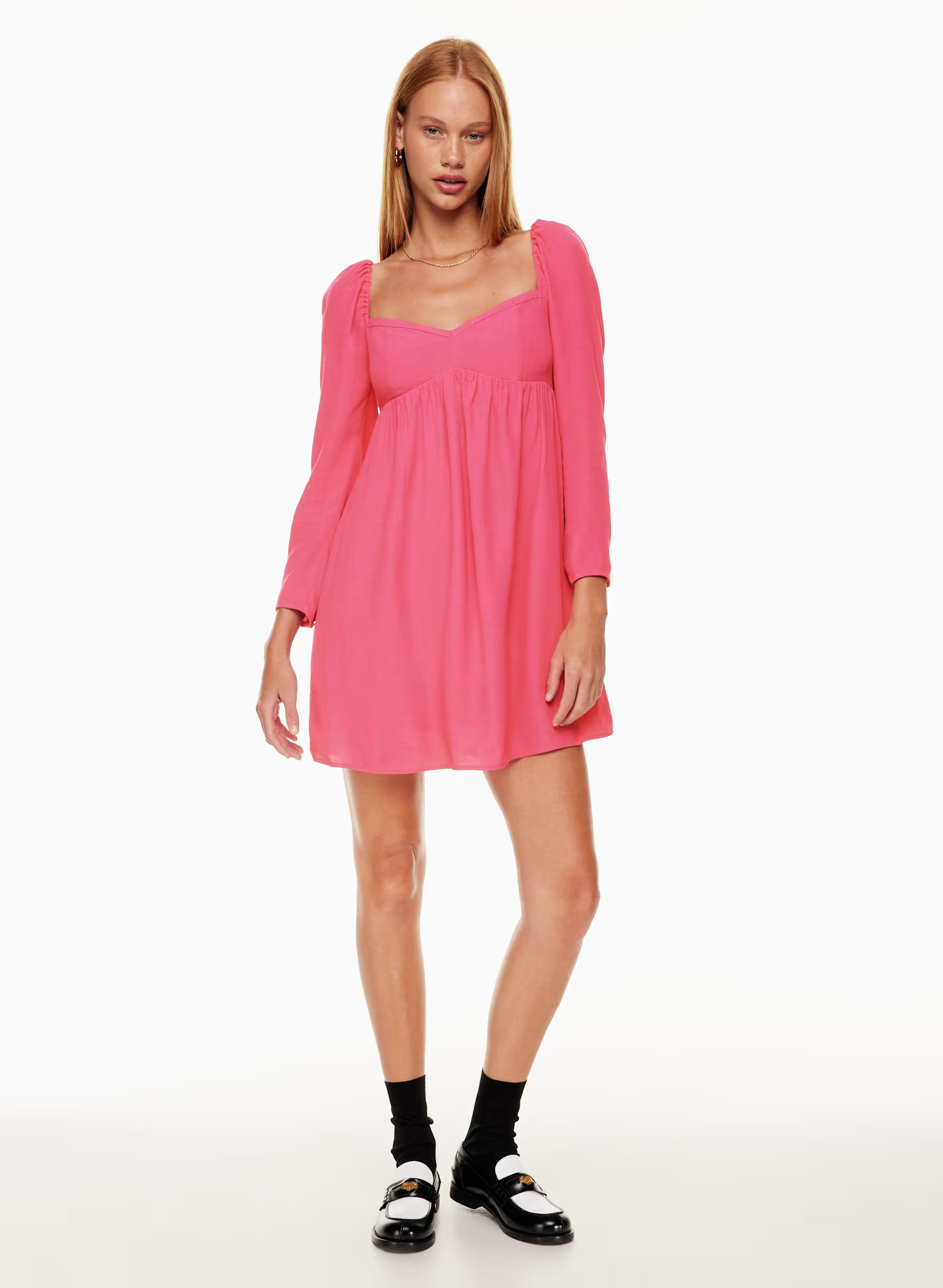 Details: This is a babydoll mini dress with a sweetheart neckline, princess seams and puff sleeves. It's made with drapey pebbled crepe.