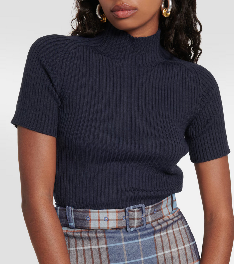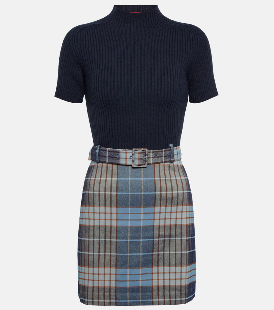 Details: Showcasing versatile appeal, the Patsy dress is cut from lightweight twill. This model features a ribbed-knit mockneck top and a checked mini-length skirt with a matching belt.