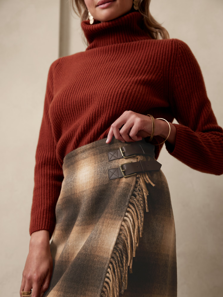 Details: Crafted from a single piece of a warm and rich wool-blend fabric, this cozy blanket skirt uses handmade fringe and beautiful leather trim at the buckle to become a luxury piece for all season wear.