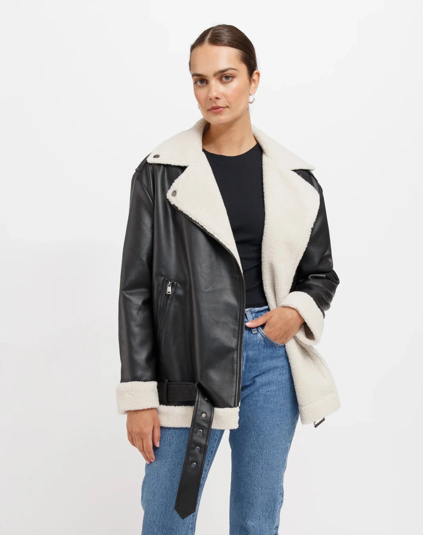The Florence Moto Vegan Leather Jacket fits oversized with a relaxed, long body. She has an adjustable belt with silver hardware throughout the jacket.