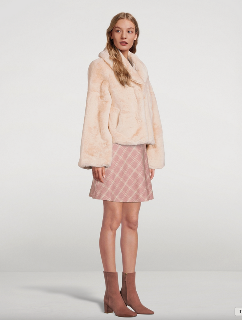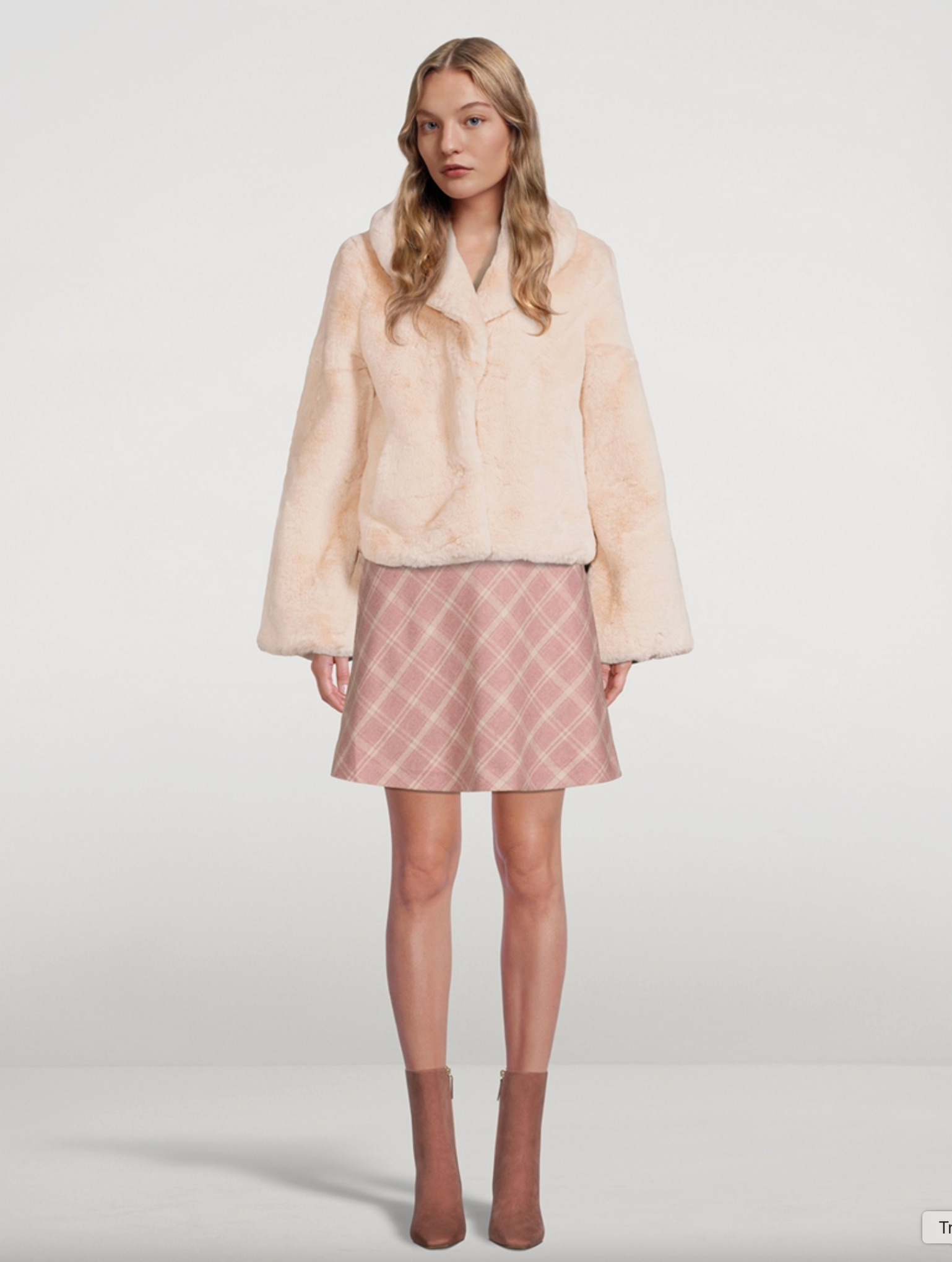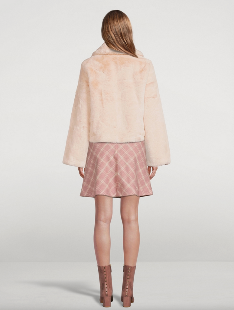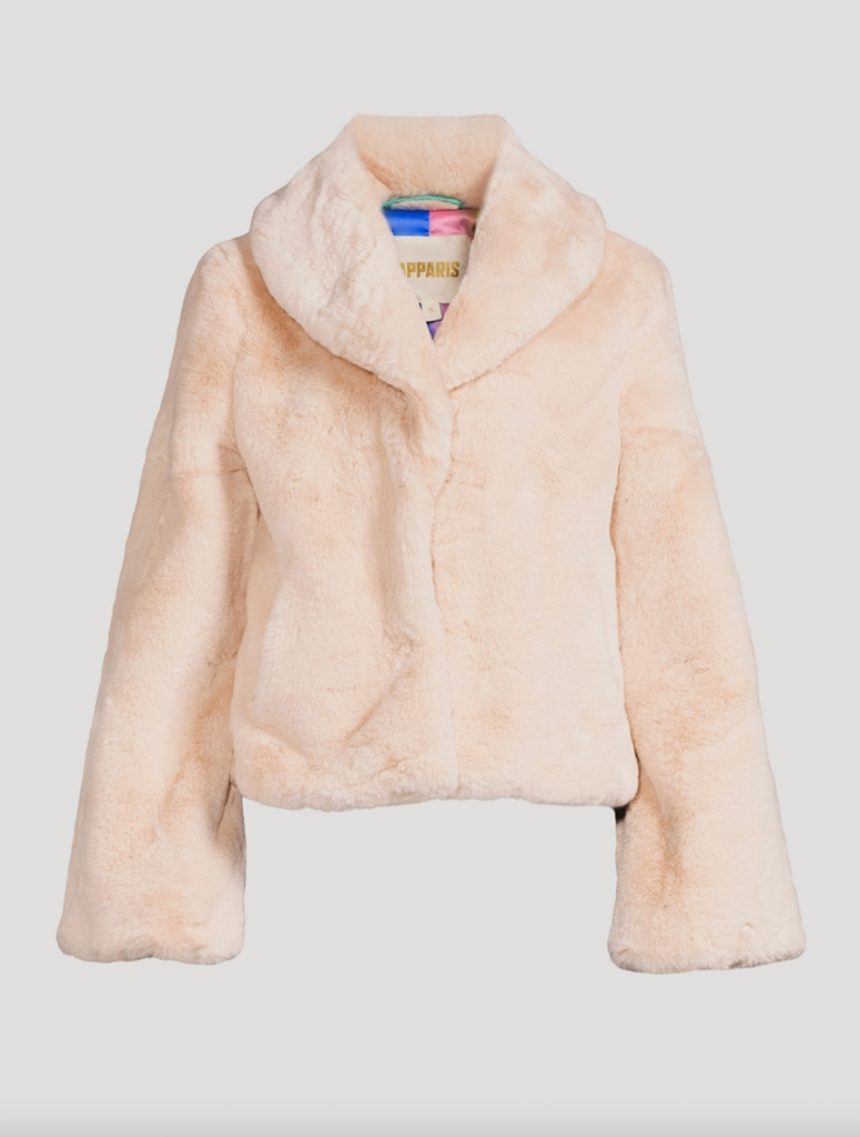Details: This faux fur coat is designed with a cropped silhouette, slash pockets and dramatic wide sleeves. Made with innovative, bio-based fabric, powered by corn: KOBA faux fur, the cropped coat is finished with a bright, unique rainbow print, meant to depict natureβs natural curves.