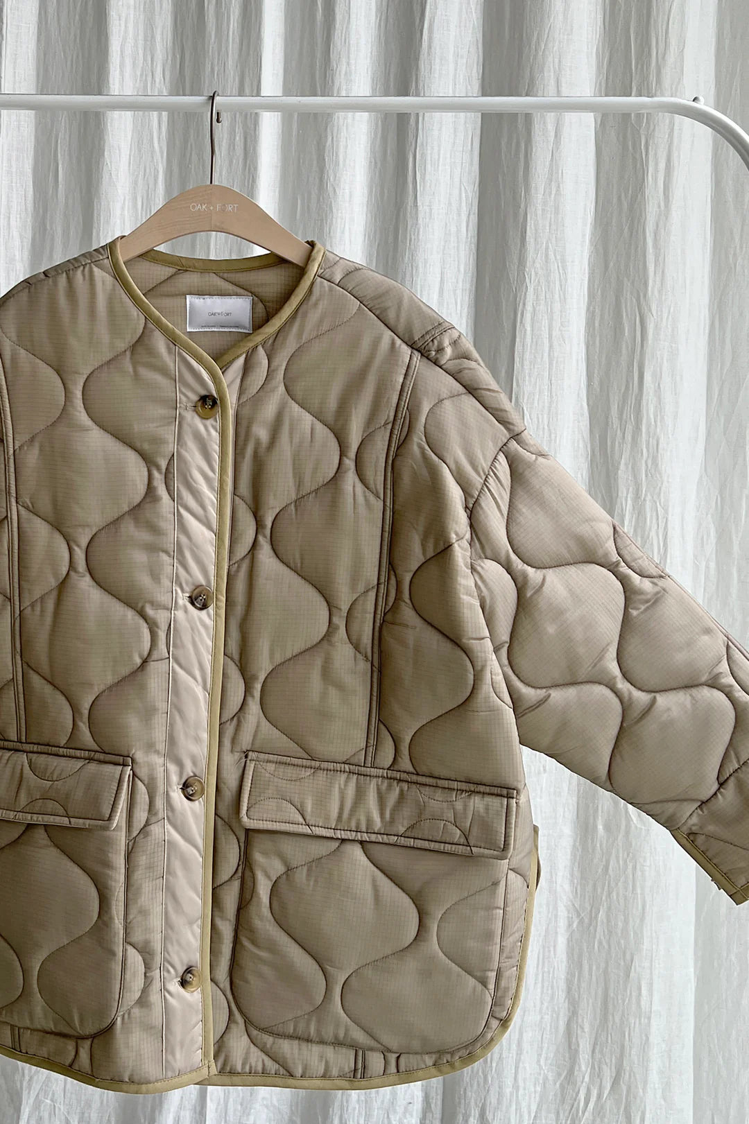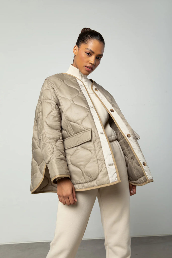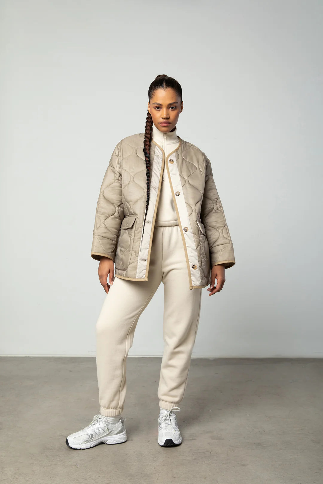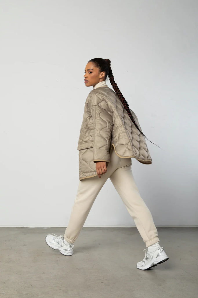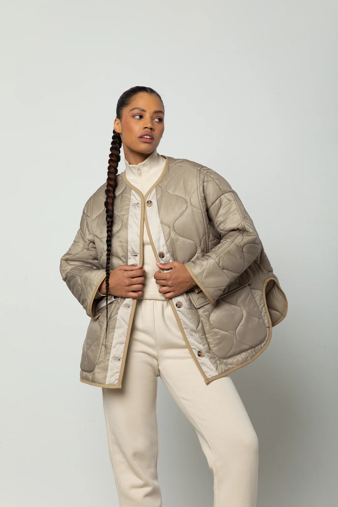 Details: This quilted jacket is made in an oversized fit to layer over hoodies or sweaters. It has a button details, dropped shoulders, side slits and large front pockets. An ideal transitional piece to wear this season and into the next.