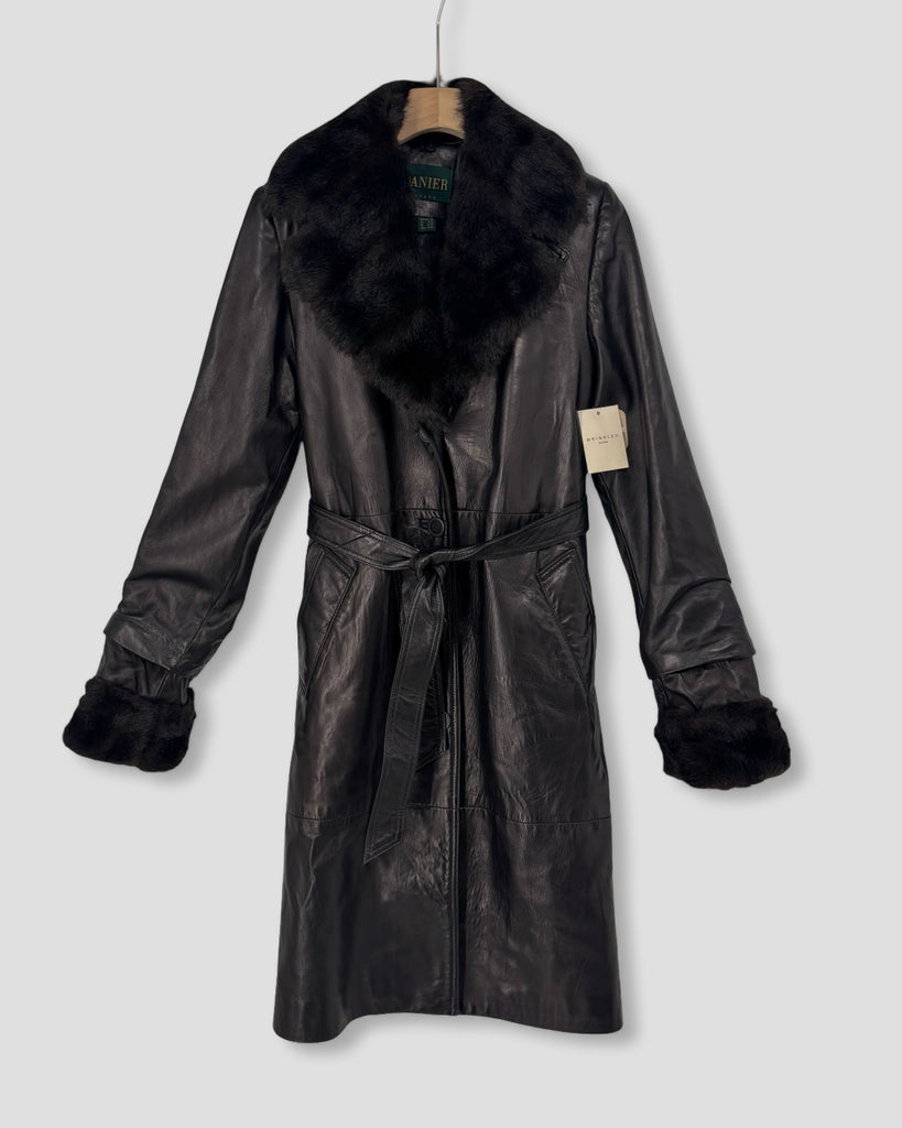 (XS) Vintage Belted Leather Trench w/ Fur Trim