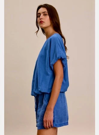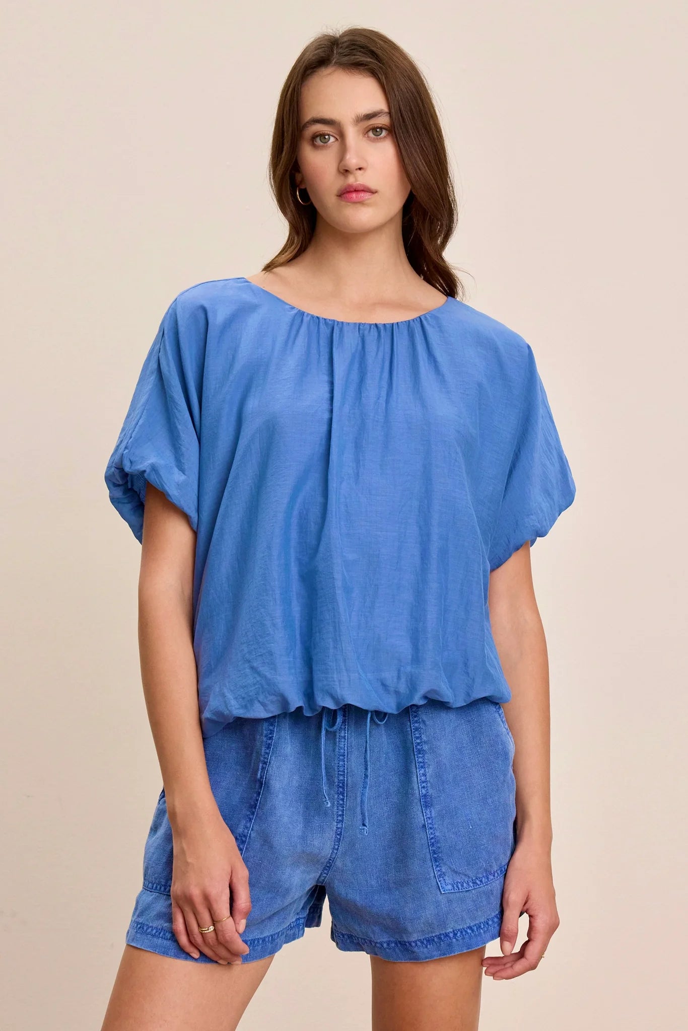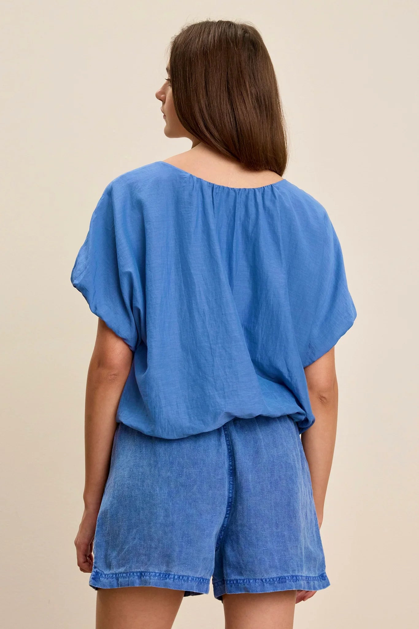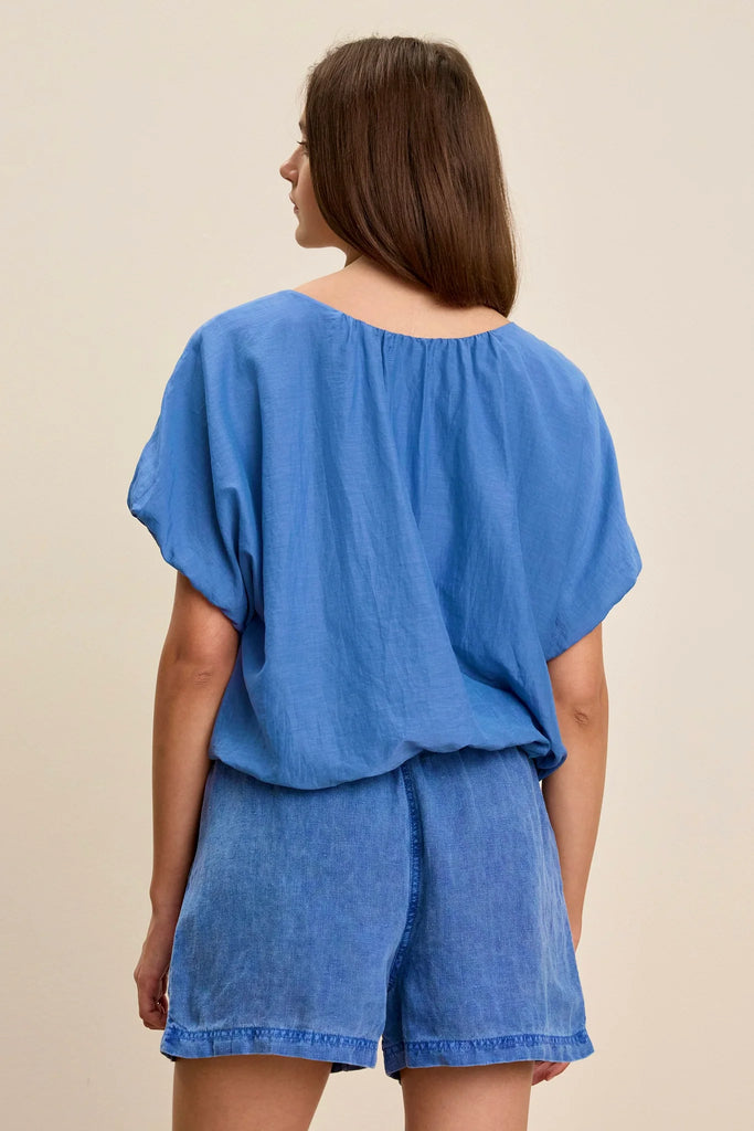 Vitta Silk Voile Top: Made from silk cotton voile with a subtle sheen. Its crew neckline and elastic, flutter sleeves offer effortless elegance, while the keyhole closure at the back adds a subtle detail. The elastic hemline ensures a comfortable fit.