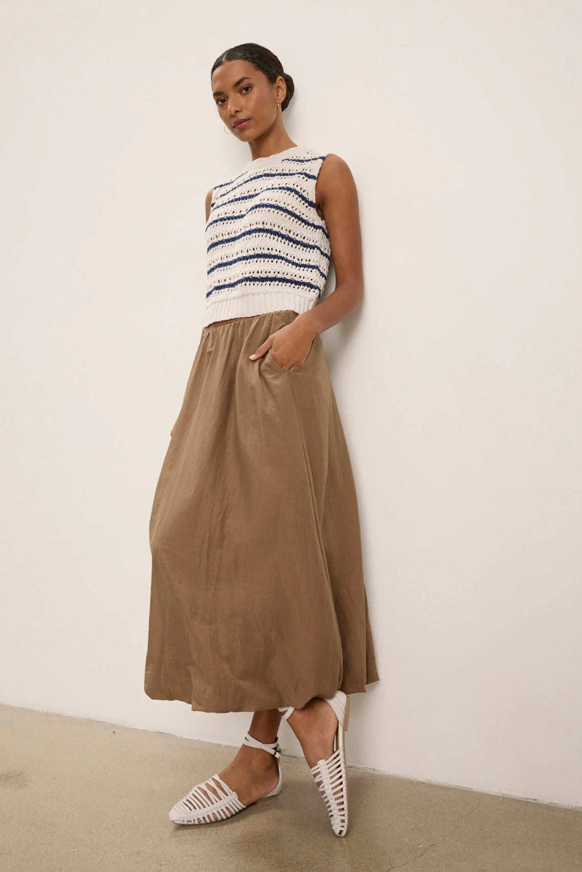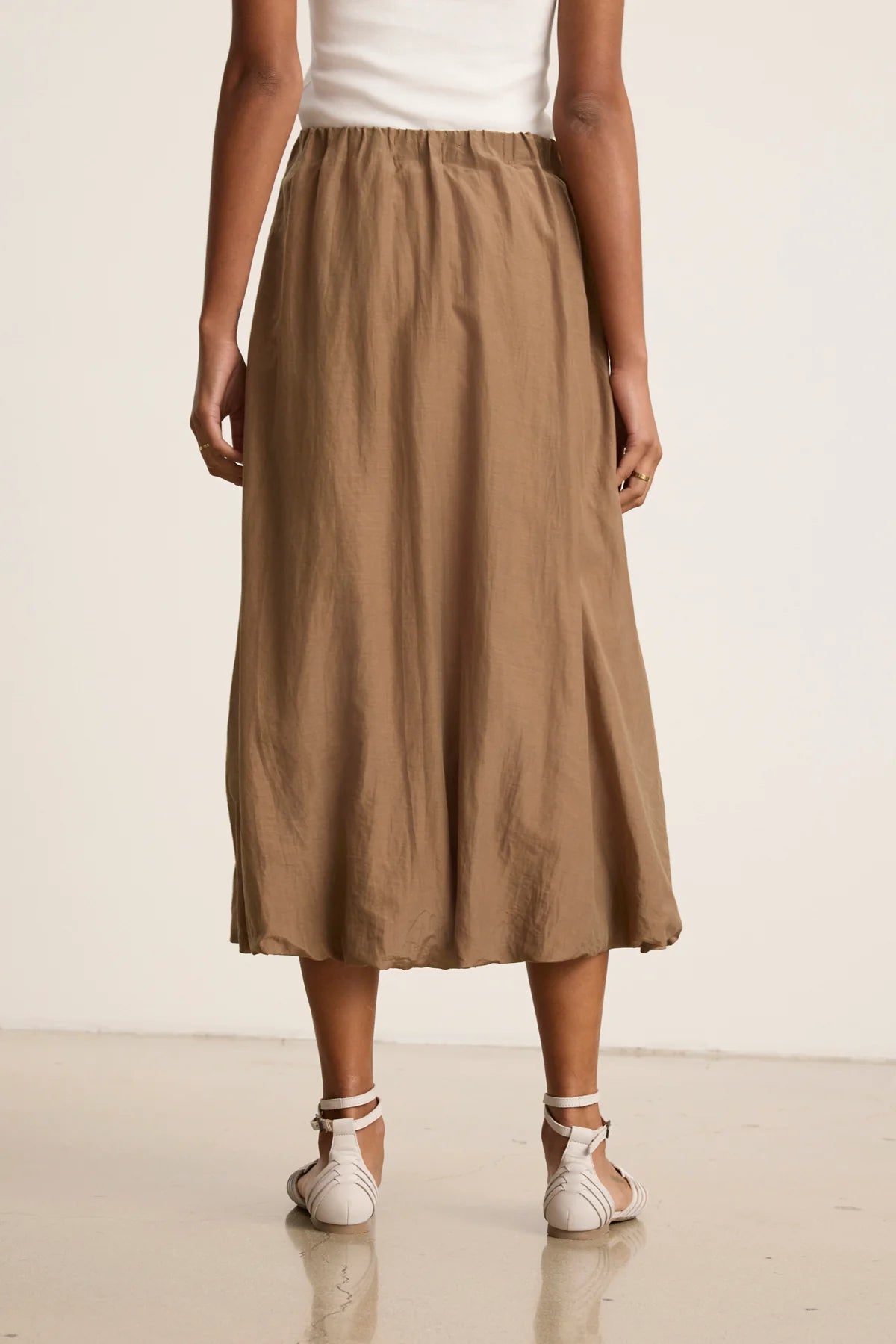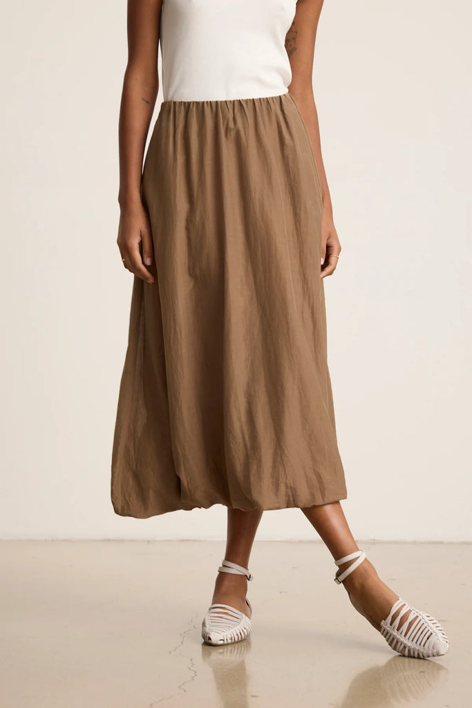 Ines Silk Cotton Voile Skirt: Crafted from silk cotton voile with a subtle sheen, this skirt features a pull-on design with a fully elastic waist for ease and comfort. Side seam pockets add functionality, while the bubble hem creates a soft, voluminous silhouette.