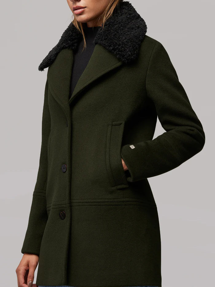 Detail: Adreanna is a timeless mid-length, straight-fit classic wool coat. This transitional fall and winter style features a notch collar, button front closure, oversized angled welt pockets and a detachable black faux shearling collar for extra warmth and comfort.