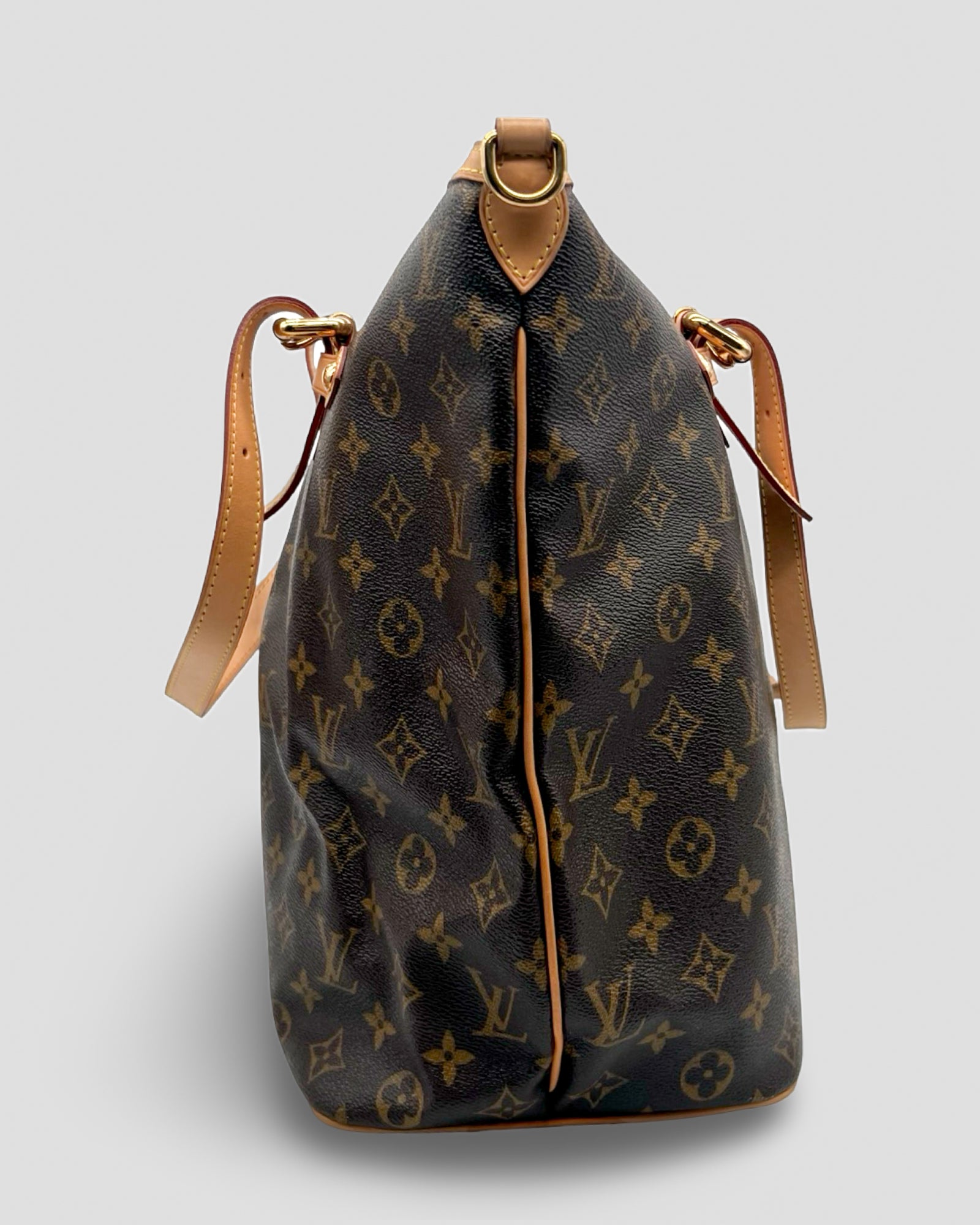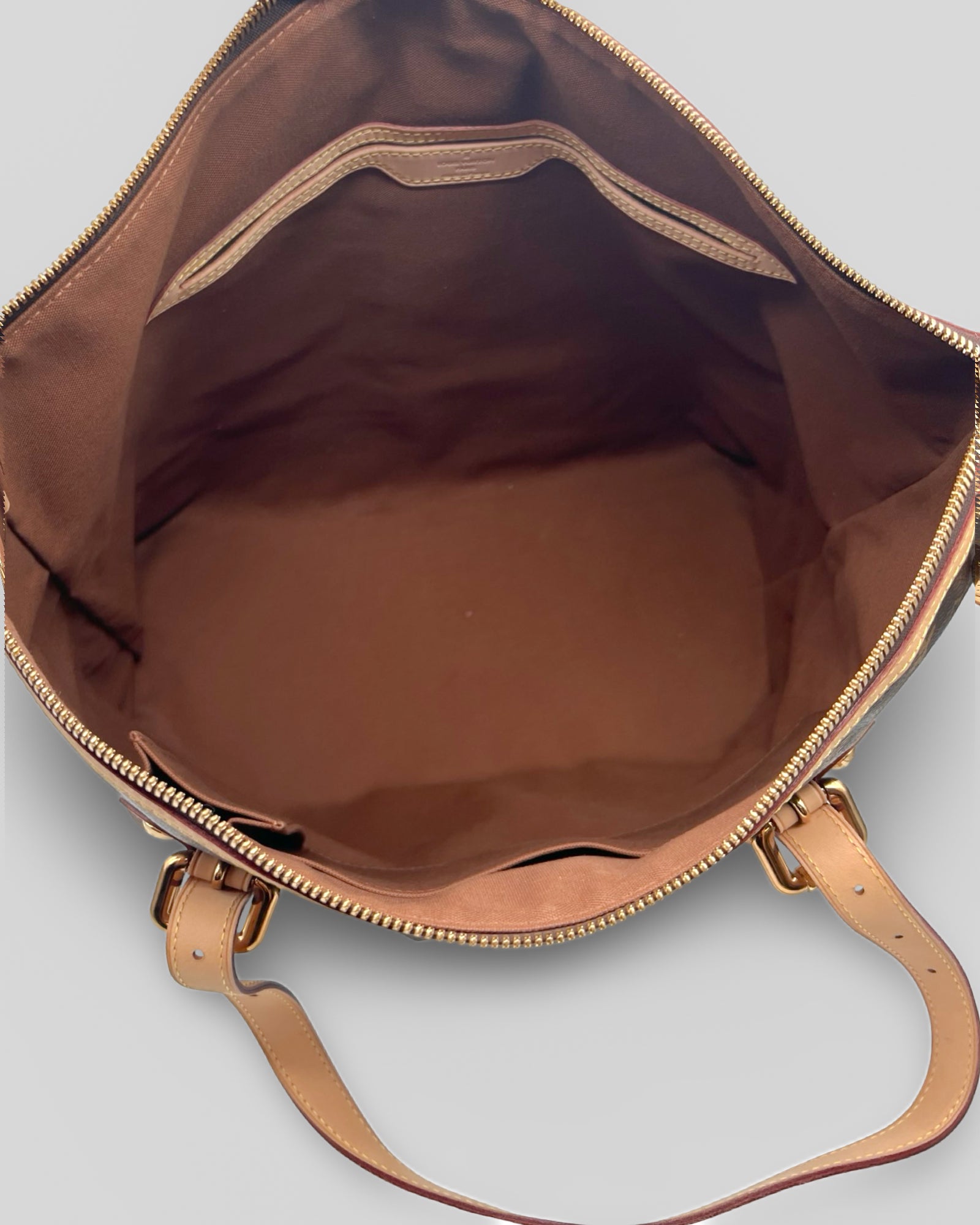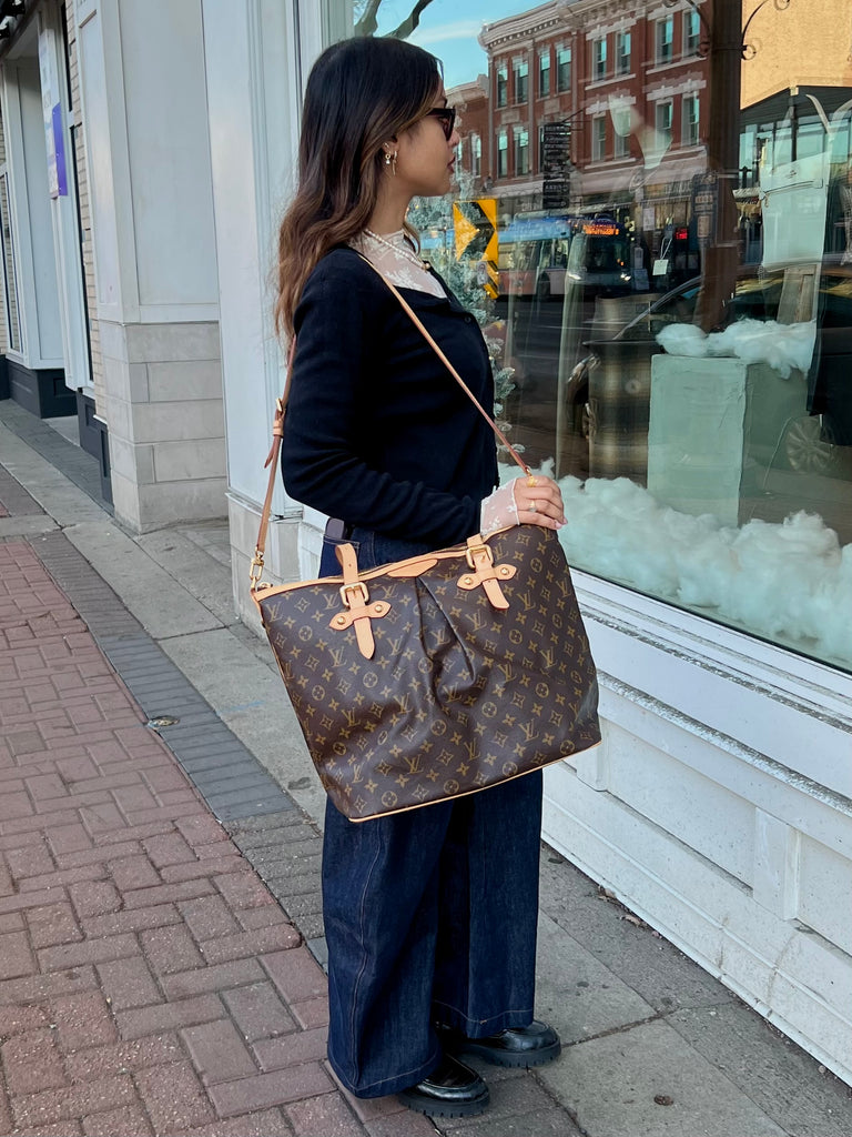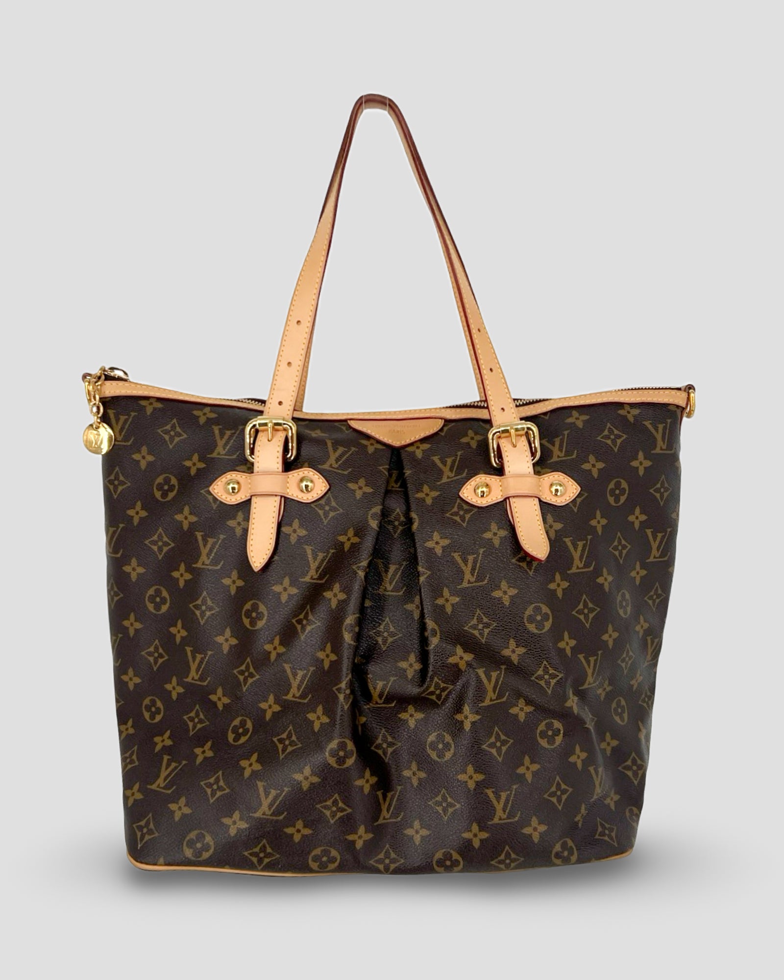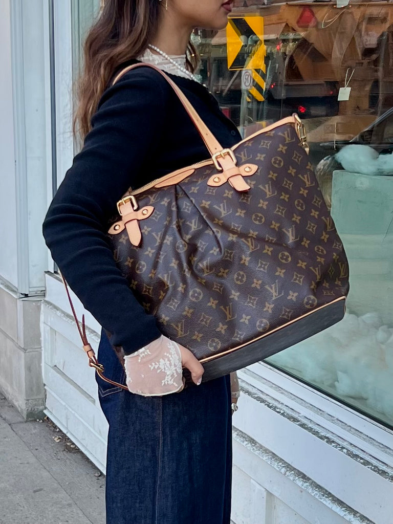 Details: This Palermo GM tote from Louis Vuitton circa 2010 is crafted in the designer's brown Monogram canvas, and features natural cowhide leather trim, gold-tone metal hardware, a detachable and adjustable shoulder strap, adjustable double handles, pleating on the body, and piped edges. Secured with a top zip closure, it opens to a solid tonal textile-lined interior containing three slip pockets, and a D-ring.