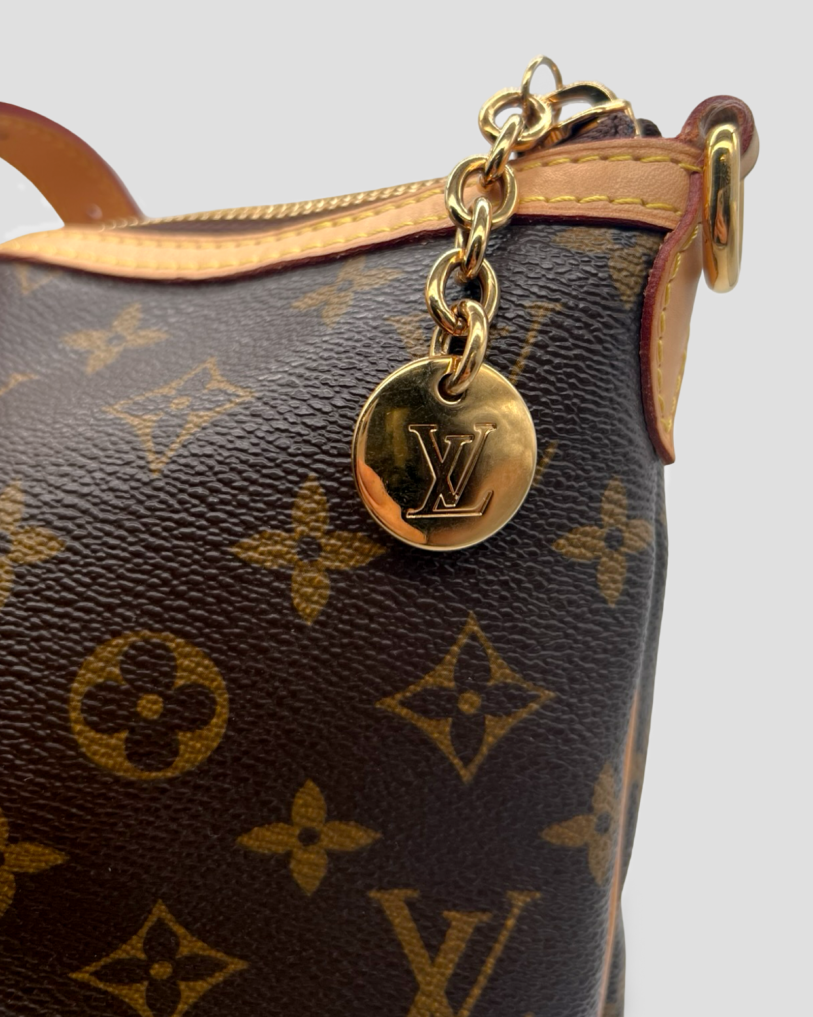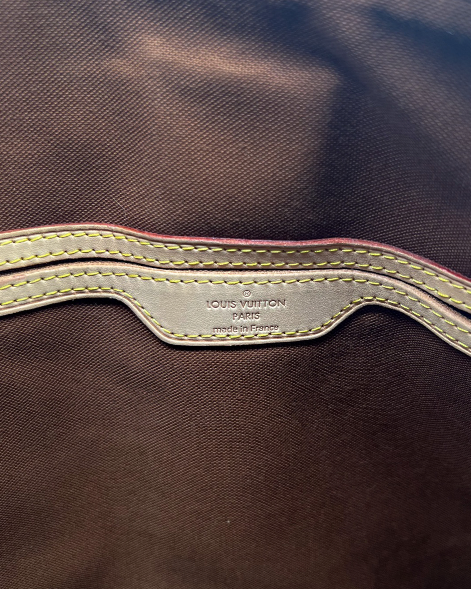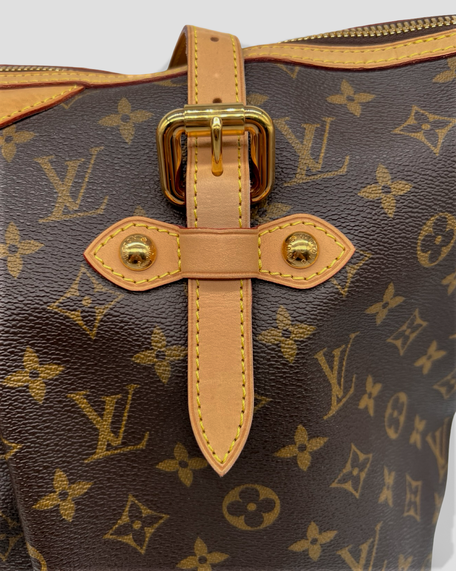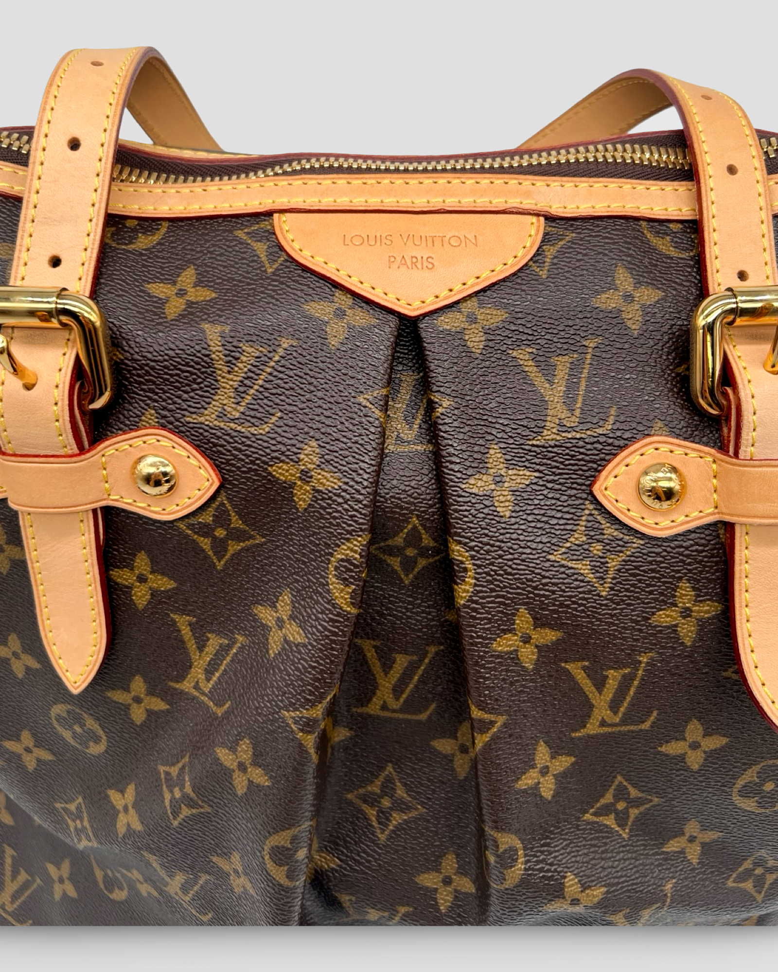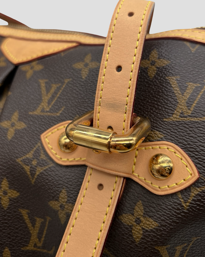 Details: This Palermo GM tote from Louis Vuitton circa 2010 is crafted in the designer's brown Monogram canvas, and features natural cowhide leather trim, gold-tone metal hardware, a detachable and adjustable shoulder strap, adjustable double handles, pleating on the body, and piped edges. Secured with a top zip closure, it opens to a solid tonal textile-lined interior containing three slip pockets, and a D-ring.