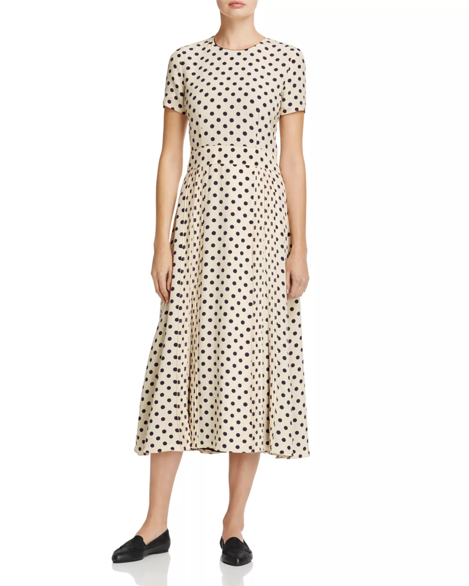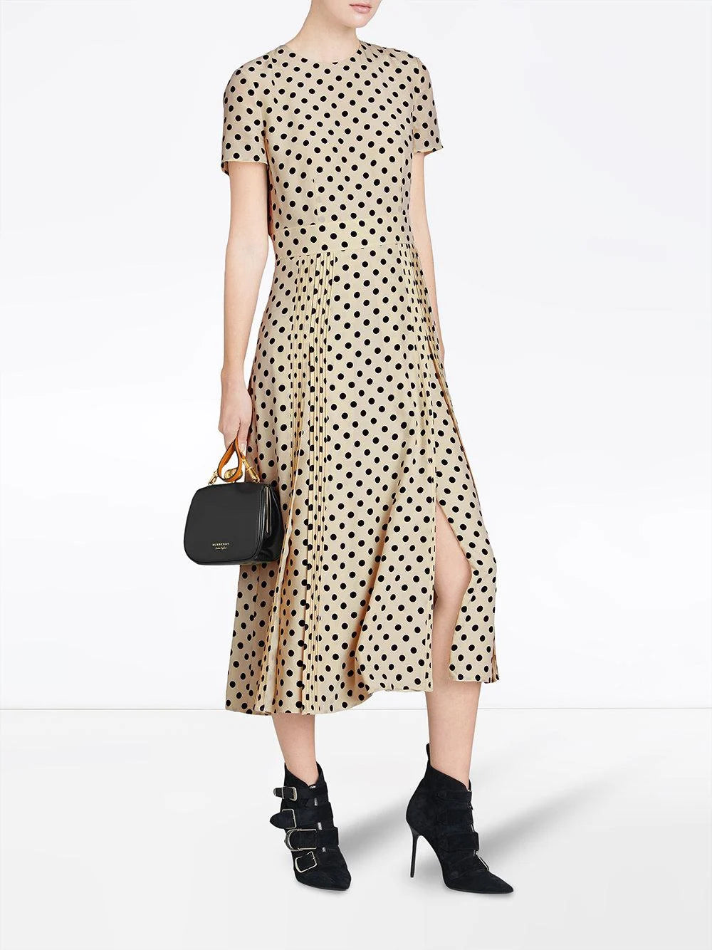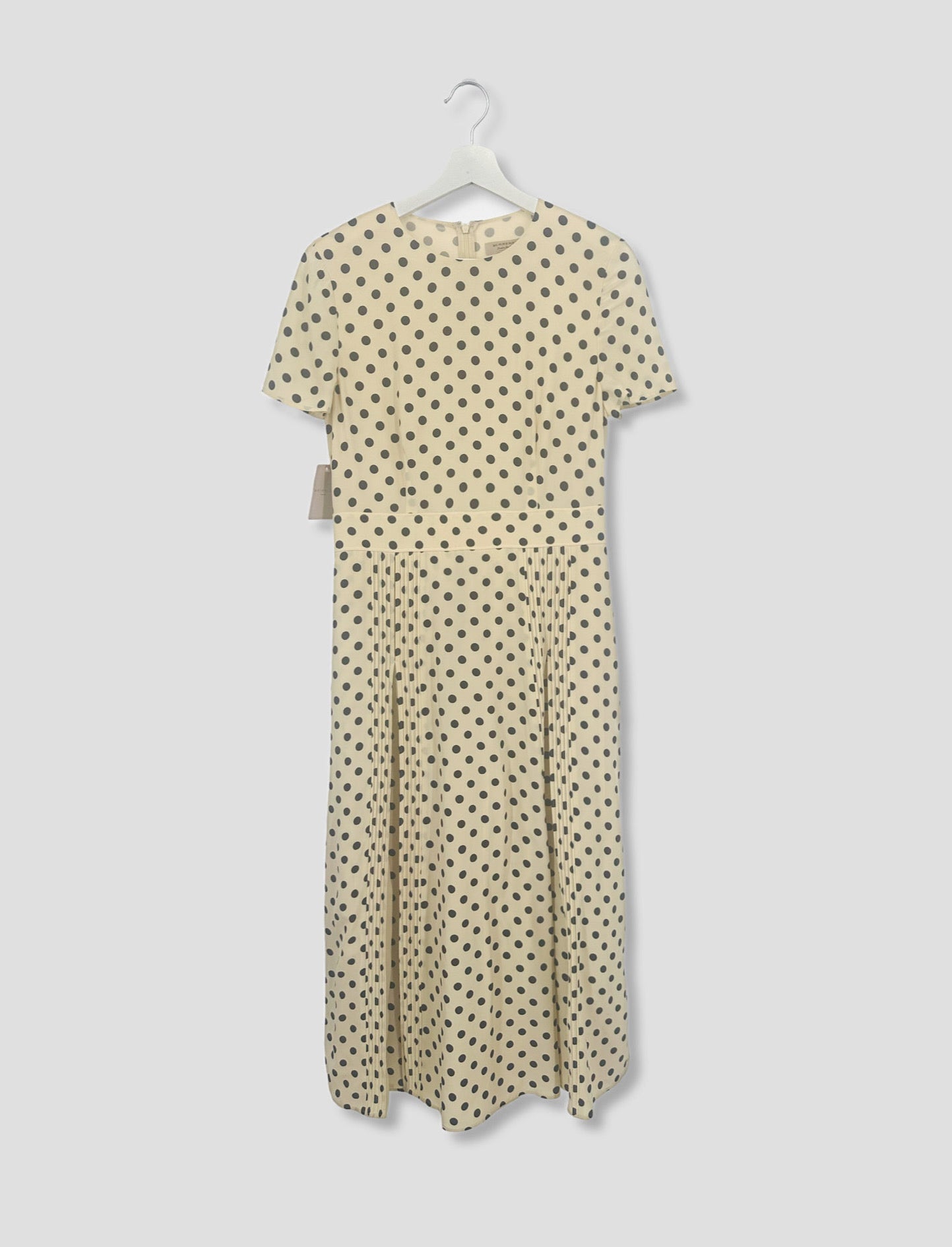 Details: Adorned with a charming polka-dot print, this gorgeous Mulberry silk dress from Burberry possesses the label's iconic tailored aesthetic with precision pleating and a fit-to-flatter silhouette.