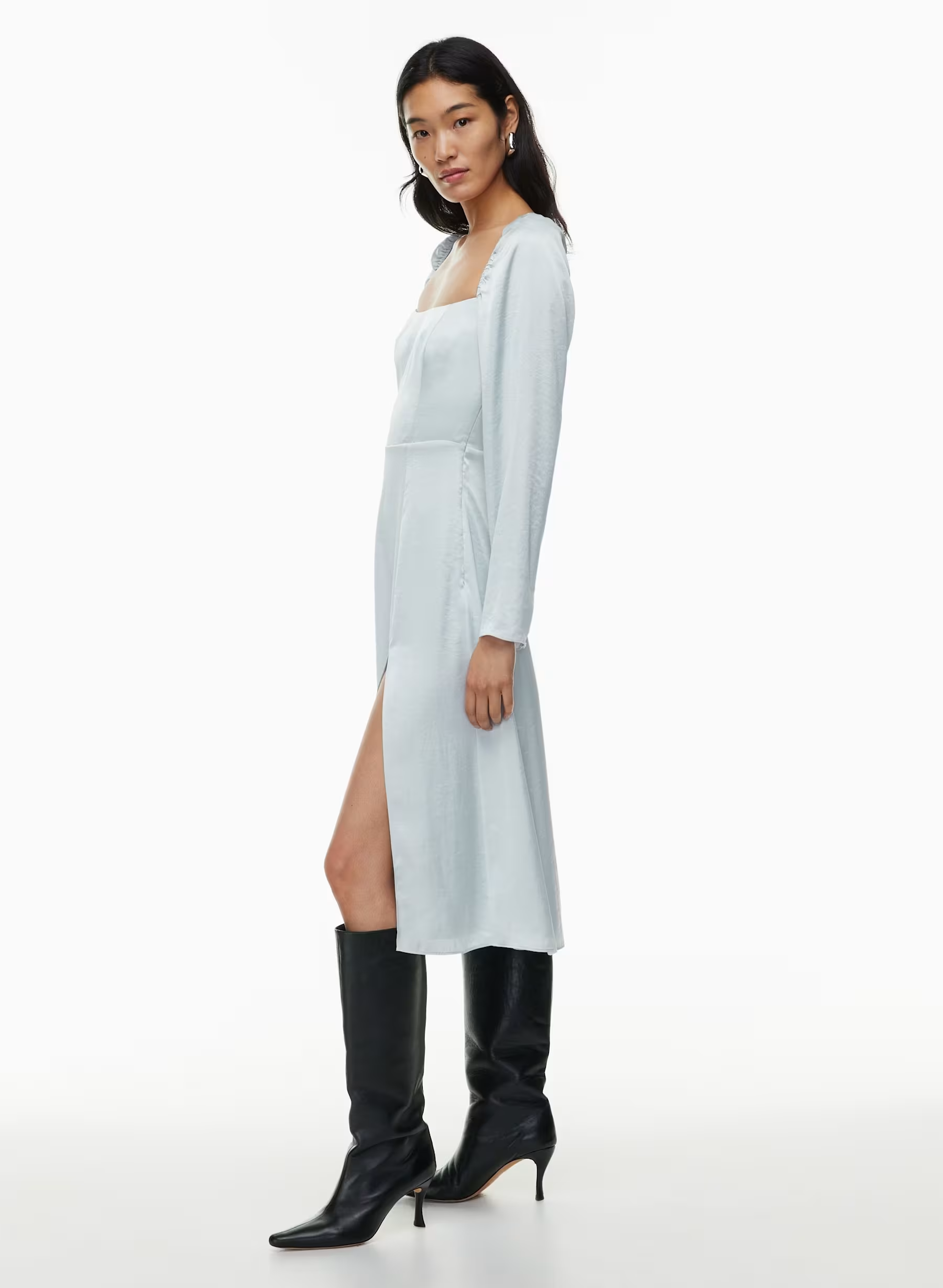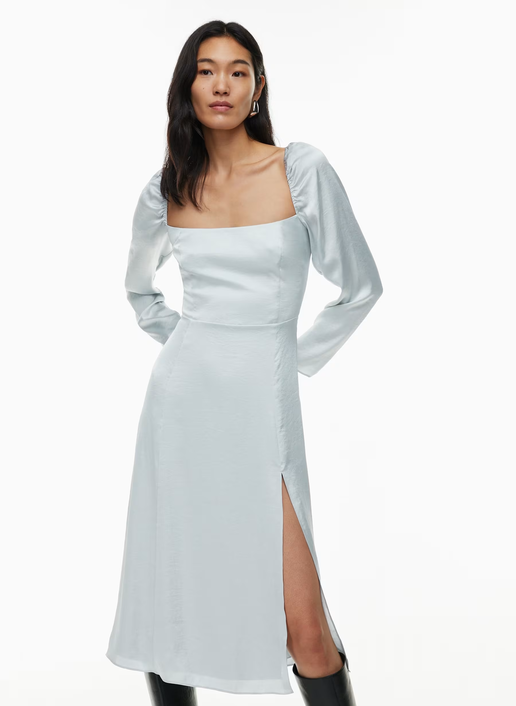 Details: This is a squareneck dress with long sleeves, a smocked back panel and a thigh slit. It’s made from Effortless Satin — drapey, lightweight Japanese satin with a glossy look and feel.