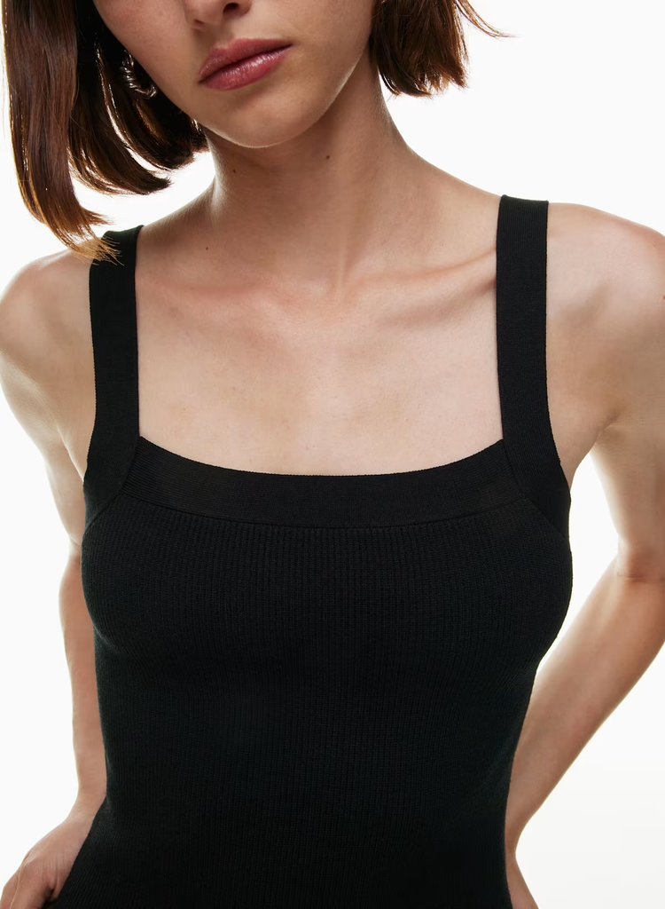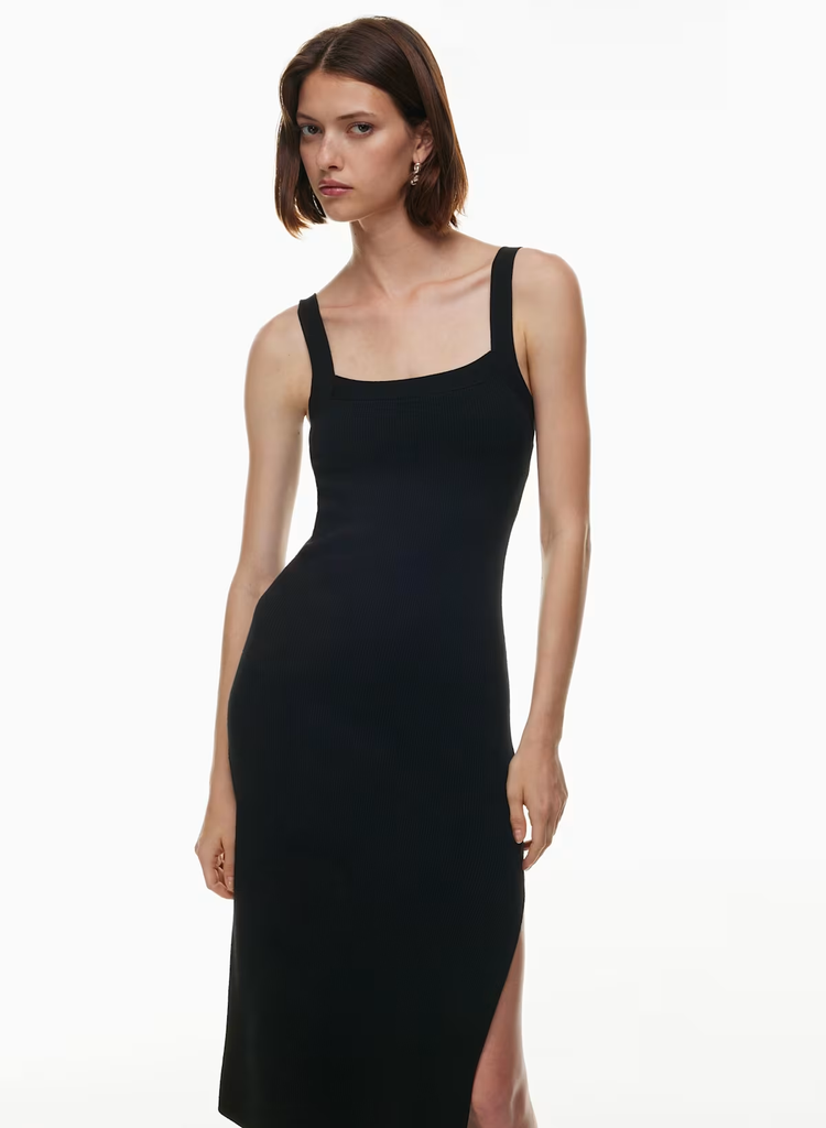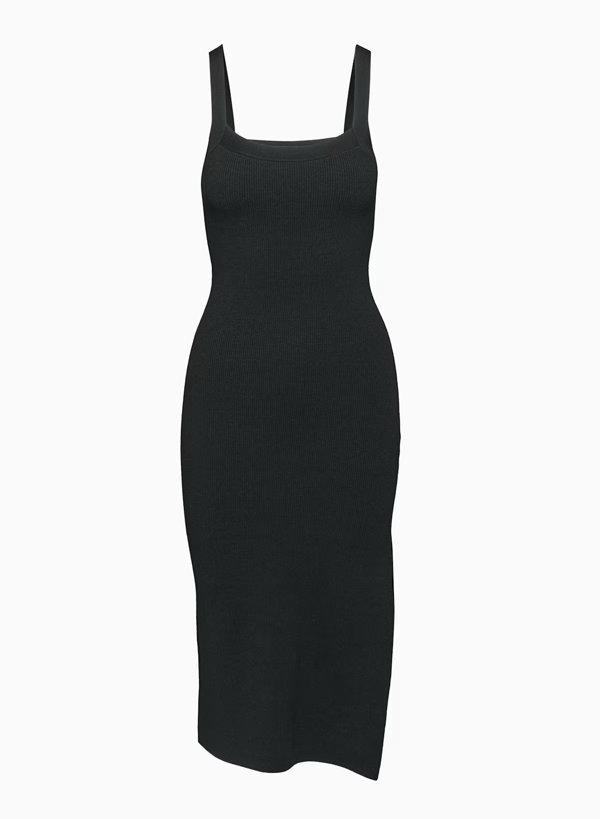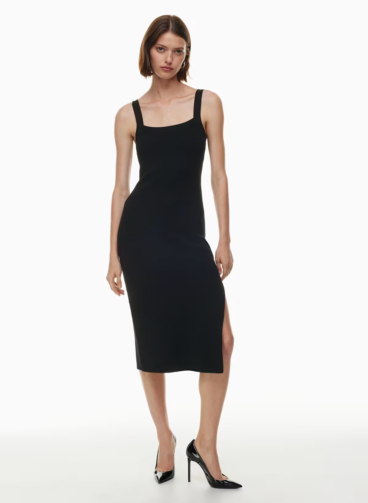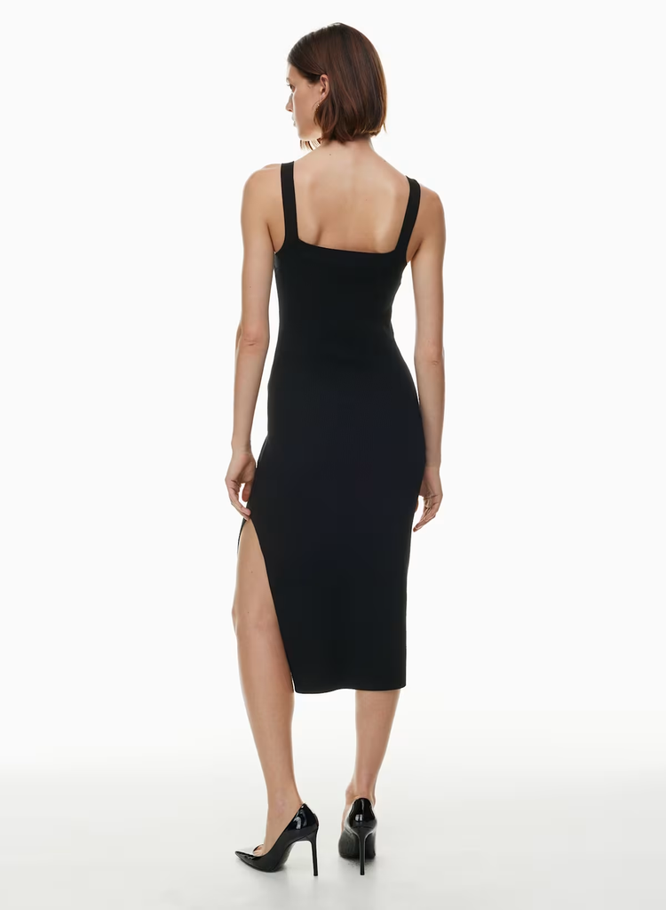 This is a fully fashioned midi dress with a double square neckline and a side slit. It’s knit with Wonder Yarn — the lightweight yarn that lives up to its name. This peachy-soft yarn offers the all-season warmth of wool, without the wool.
