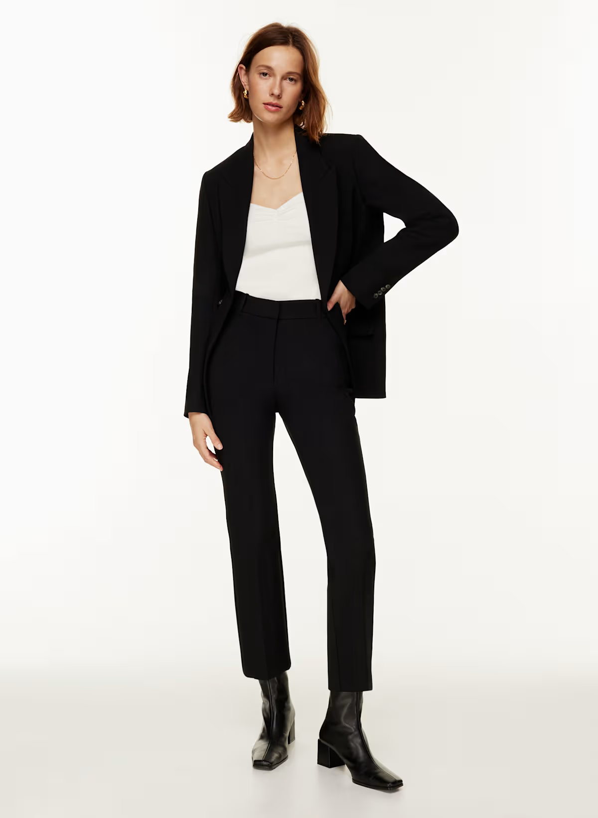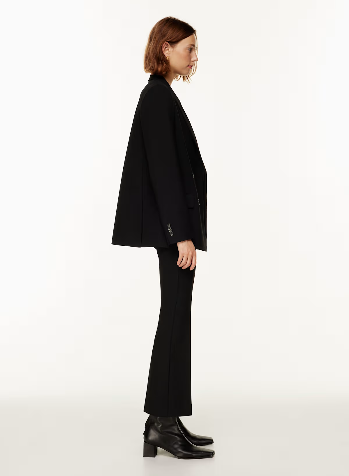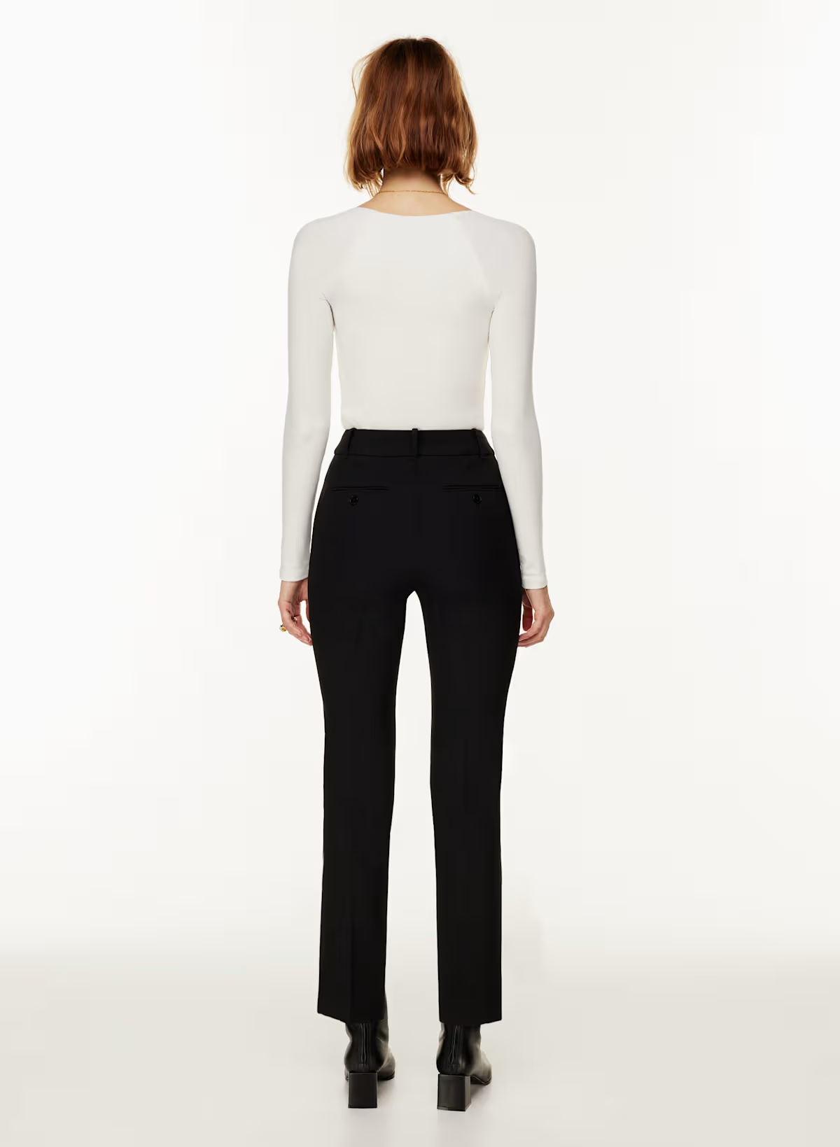 Details: These are high-waisted pants with a kick flare leg and back welt pockets.