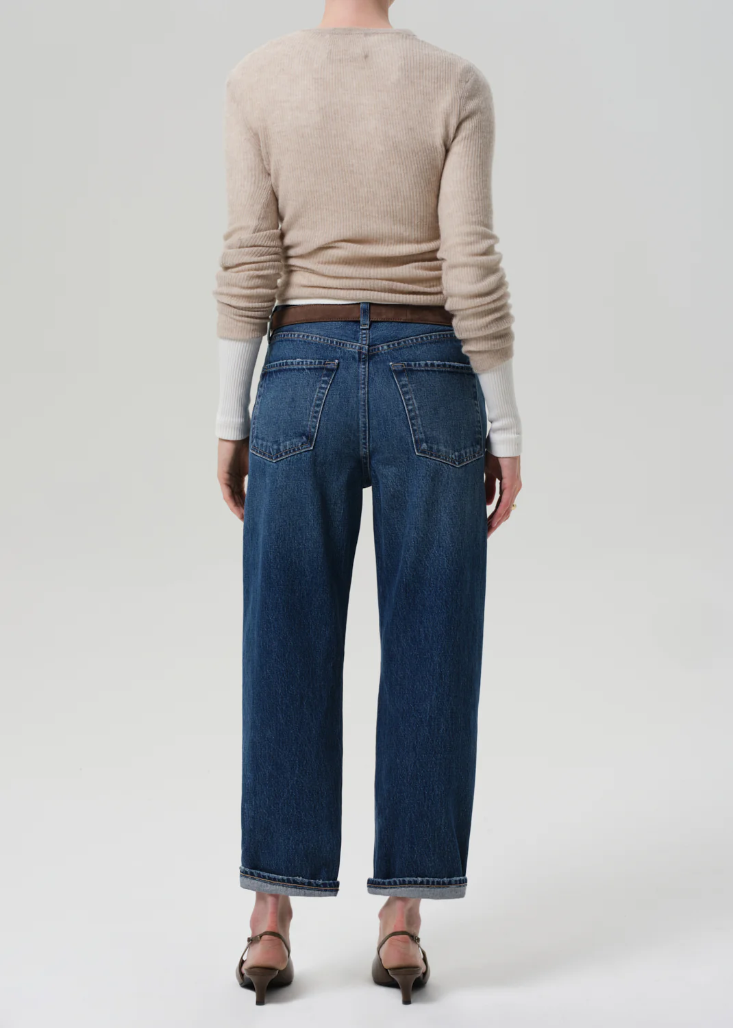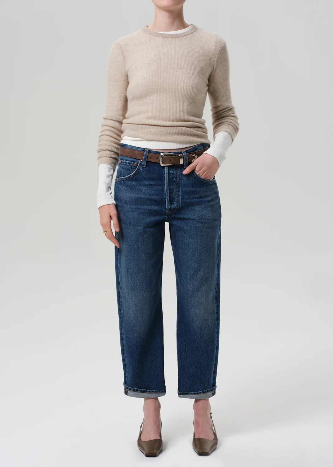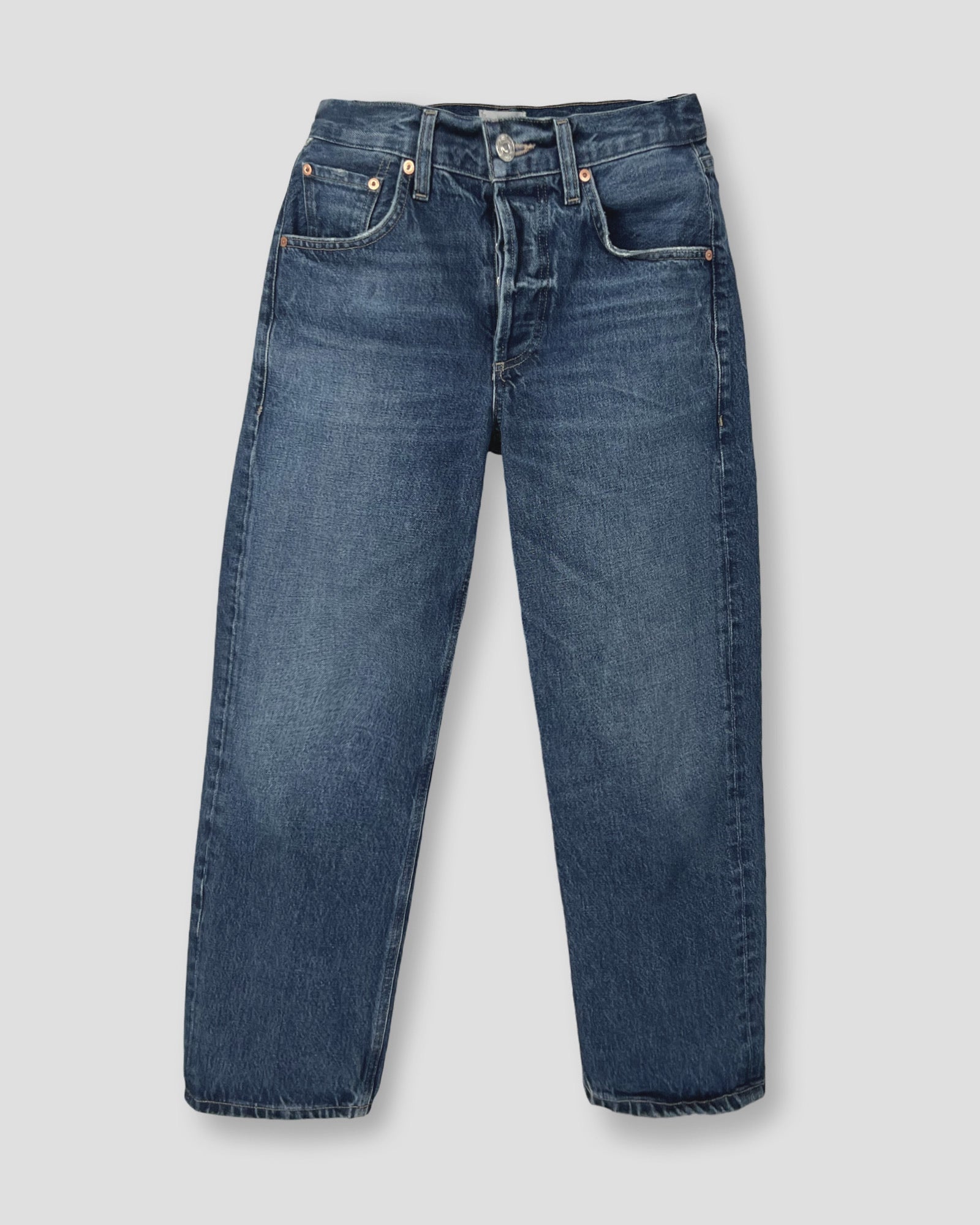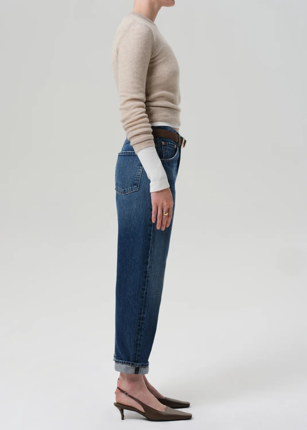 Details: The ‘Dahlia Baby Roll’ is a relaxed tapered jean crafted from rigid regenerative cotton denim with a soft, broken-in feel. Designed with a button fly and optional cuff, it offers ease with a considered finish. The Claremont wash—a medium indigo with soft fading, marbling, and whiskering—evokes a timeless, lived-in feel. Wear it cuffed with sneakers or long with low-heeled boots.
