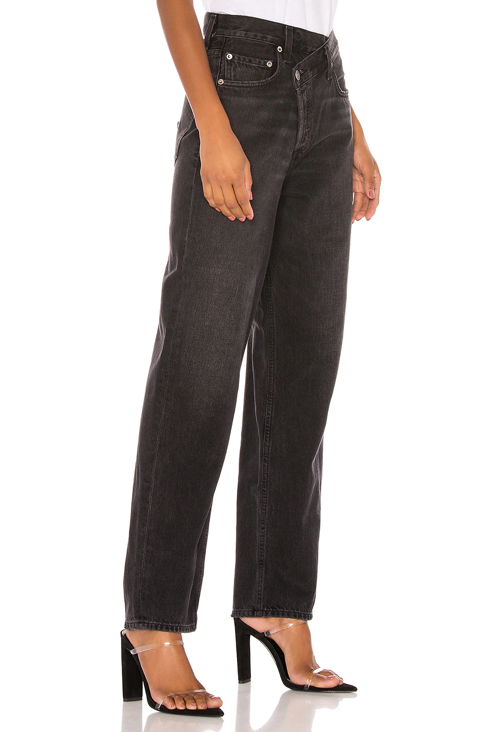 Details: Criss cross straight jeans. Light fading and distressed detail. Asymmetrical button fly. 5-pocket design.
