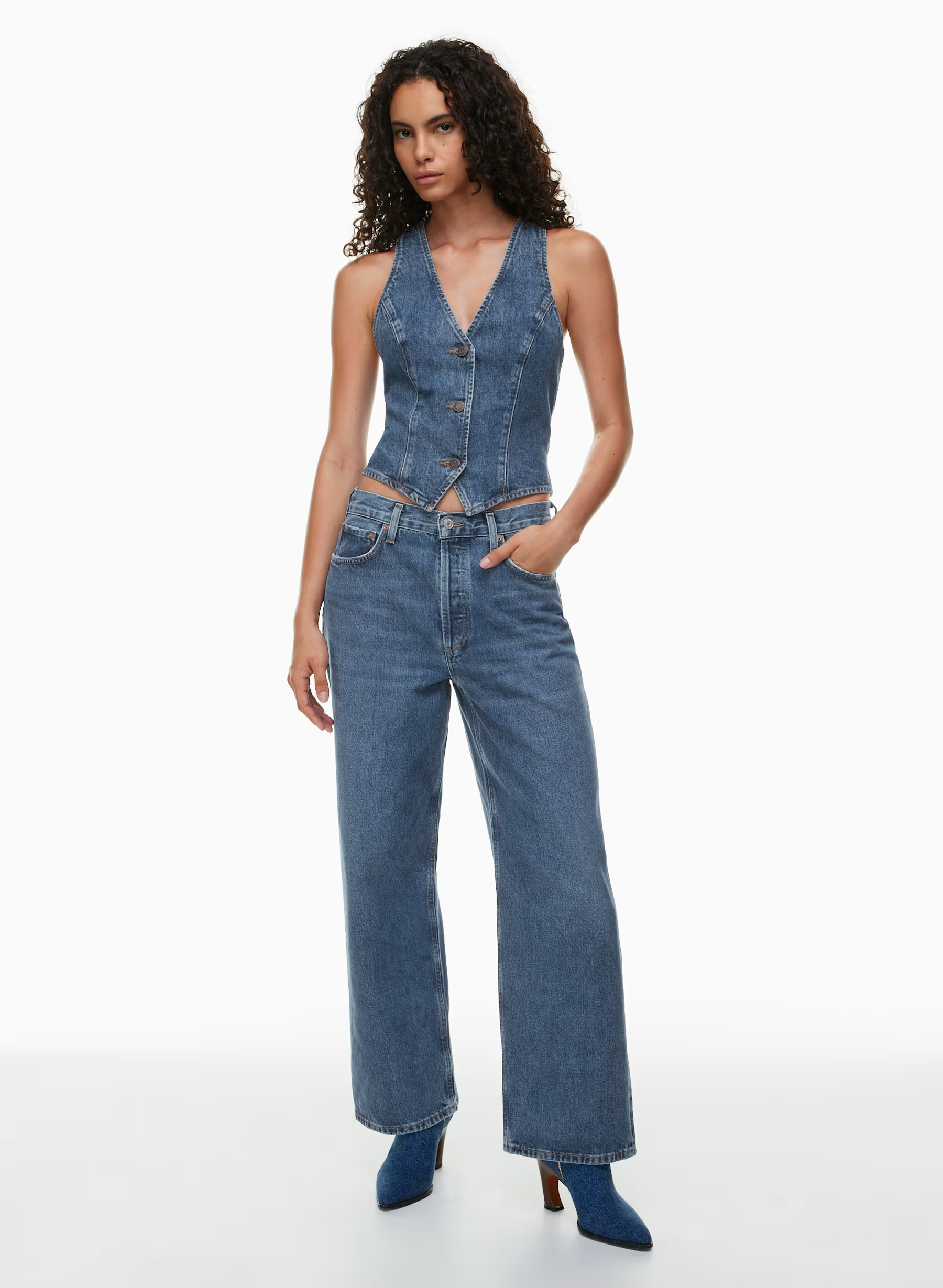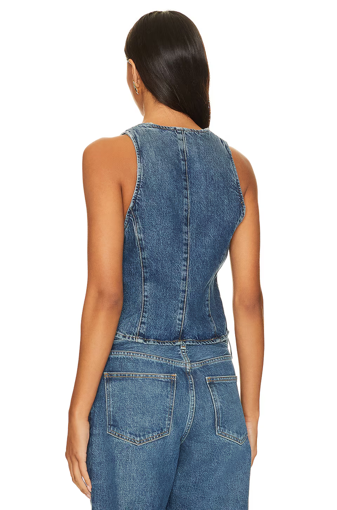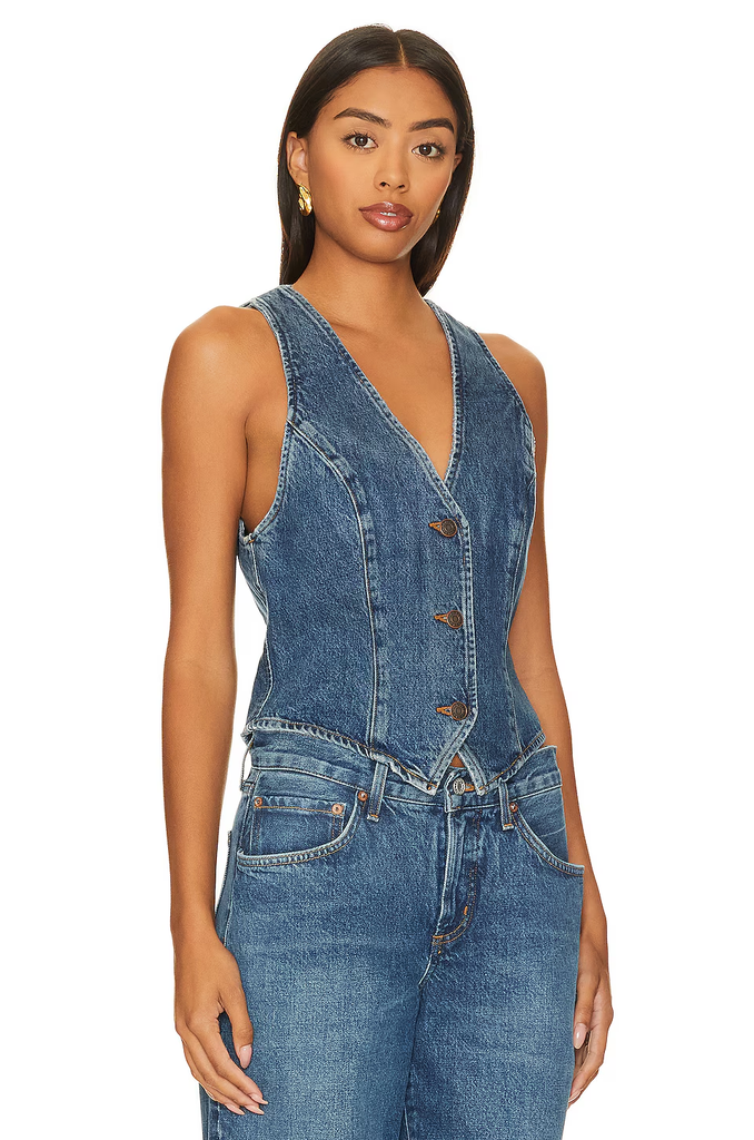 Details: This is a V-neck button-up vest designed with a close fit and flattering princess seam detailing down the body. It's made with an organic and recycled cotton blend that's soft to the touch.