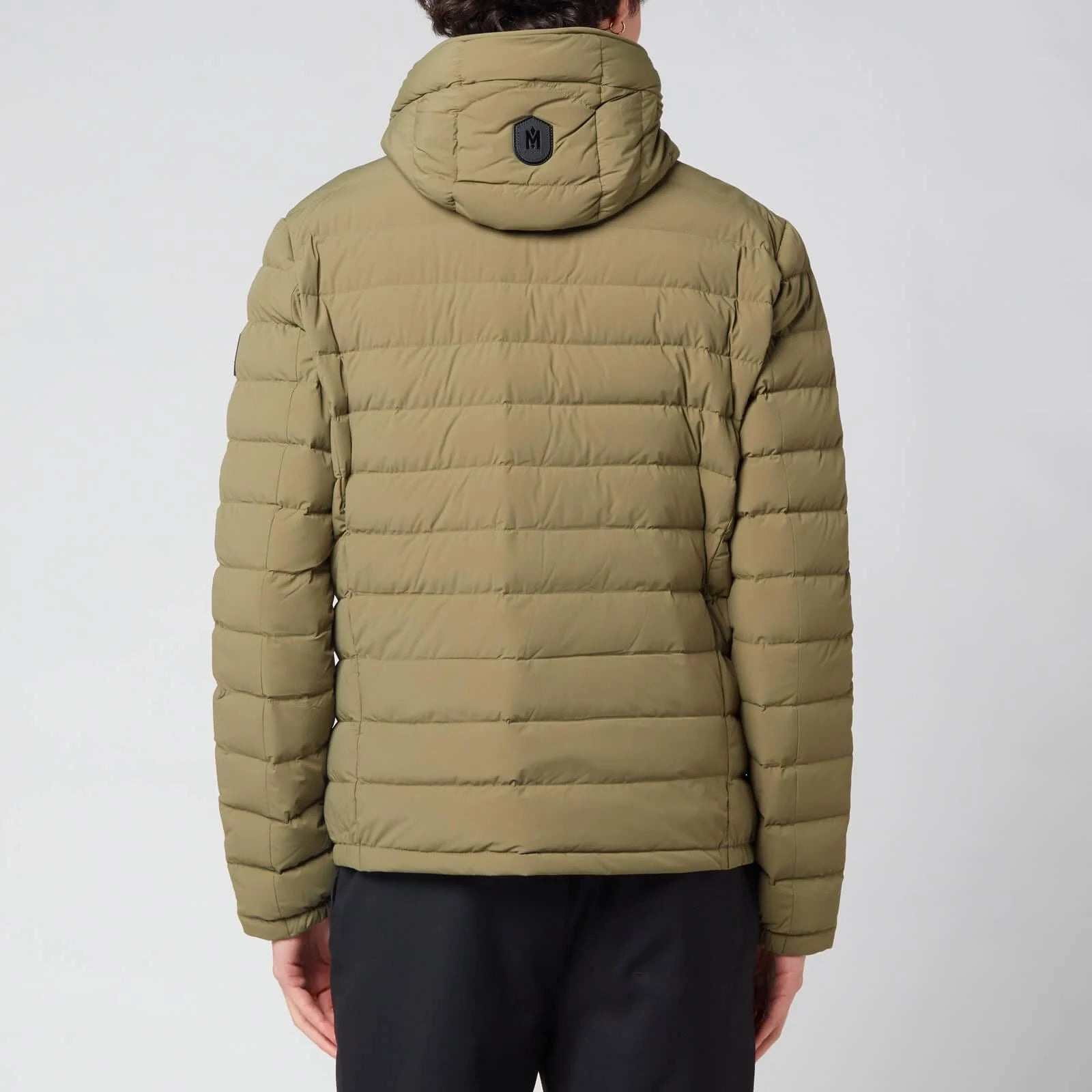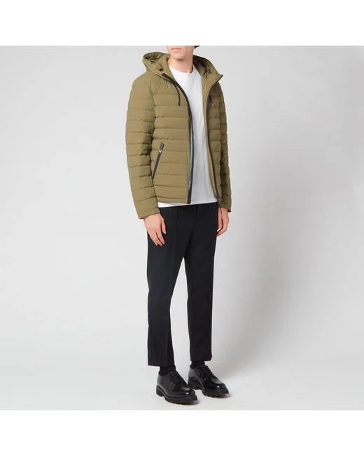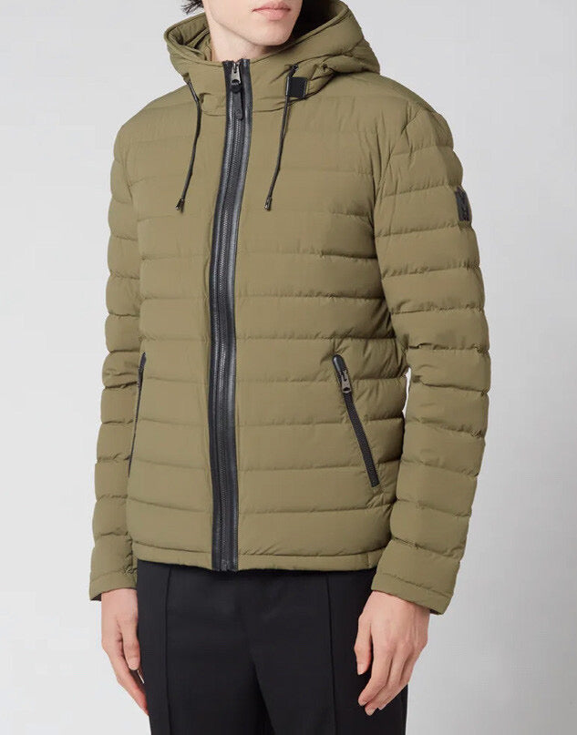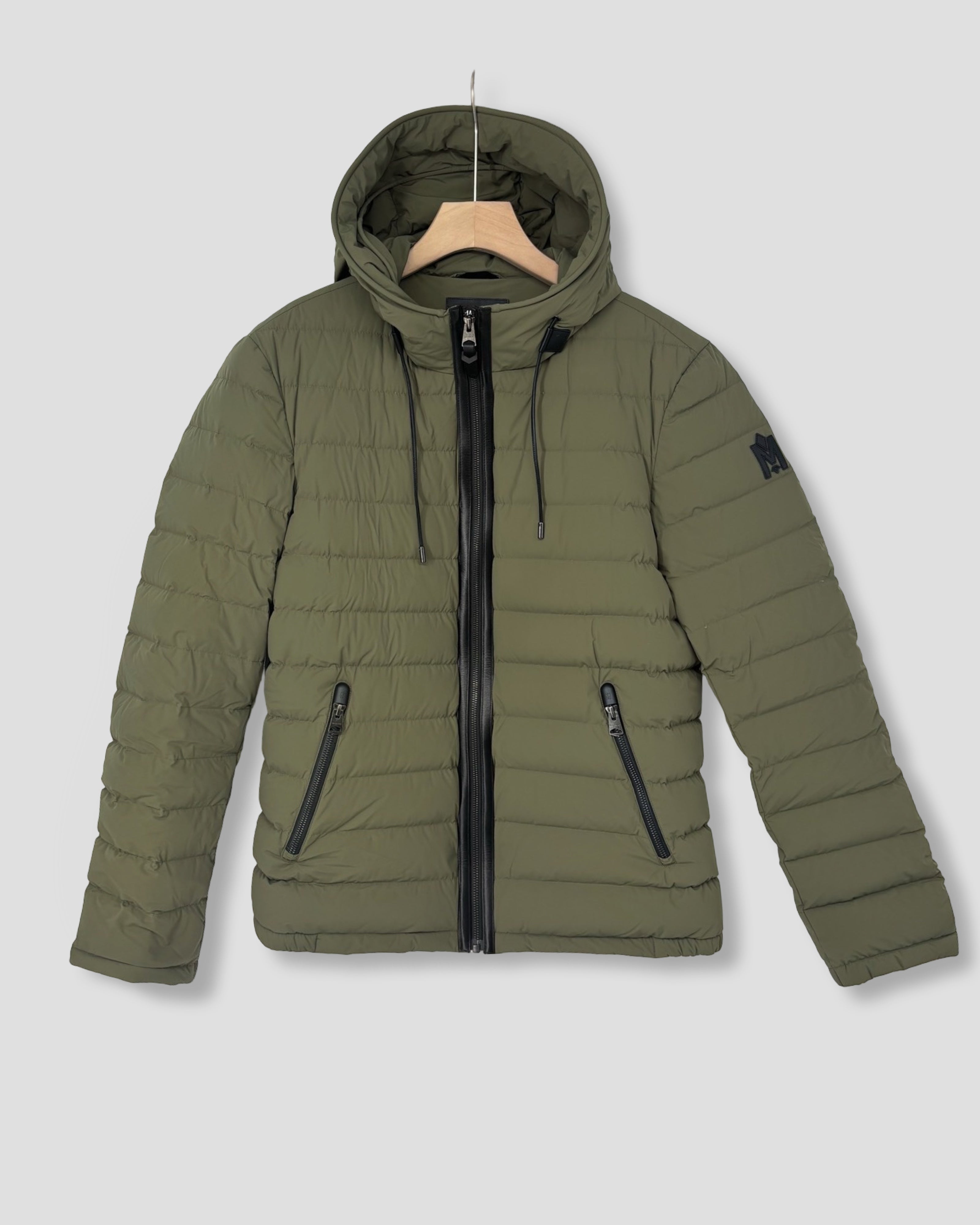 Details: This lightweight down jacket is designed with an adjustable storm visor hood with leather drawcords and an elasticized drawcord bottom hem. Crafted in a water-repellent, breathable and two-way stretch fabric, the slim-fit coat is finished with zippered waist pockets with 3D branded MACKAGE zipper stopper covers and a leather trim along the center front zipper.