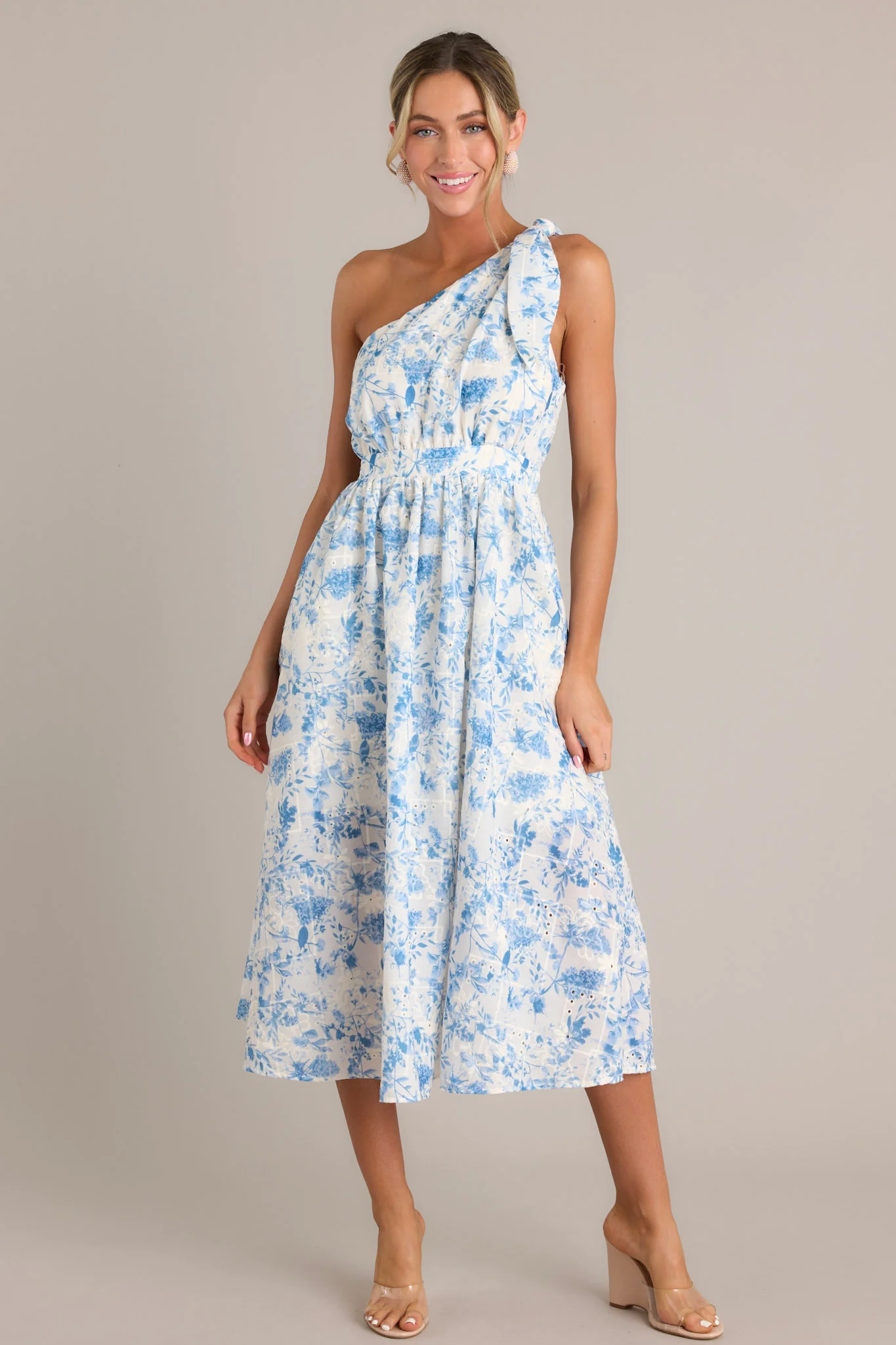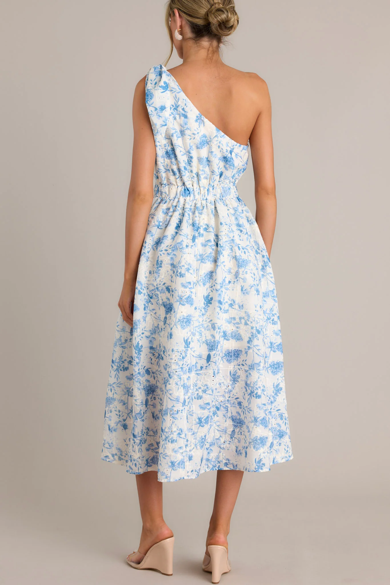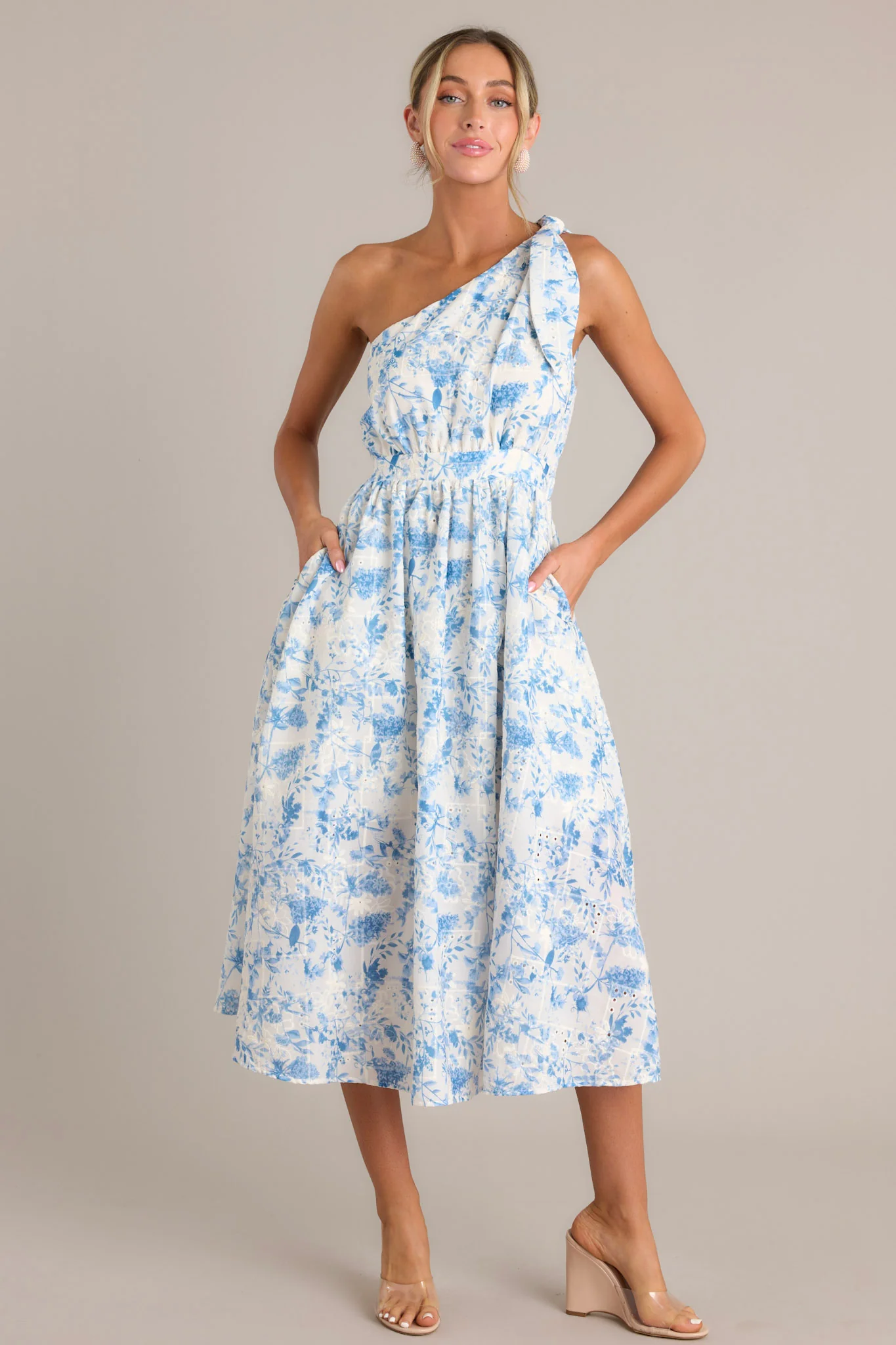 Details: Be the belle of the ball in the Bluebell Bliss Midi Dress! This charming one-shoulder dress features a beautiful blue floral print that will have you feeling like a breath of fresh air. Embrace your playful side and enjoy the comfort and elegance of this unique and stylish piece, perfect for any occasion. Don't be afraid to bloom and stand out in this stunning dress! This blue midi dress features an asymmetrical neckline, a self-tie shoulder feature, a thick waistband with an elastic insert, a discrete side zipper, functional hip pockets, and embroidered details throughout.
