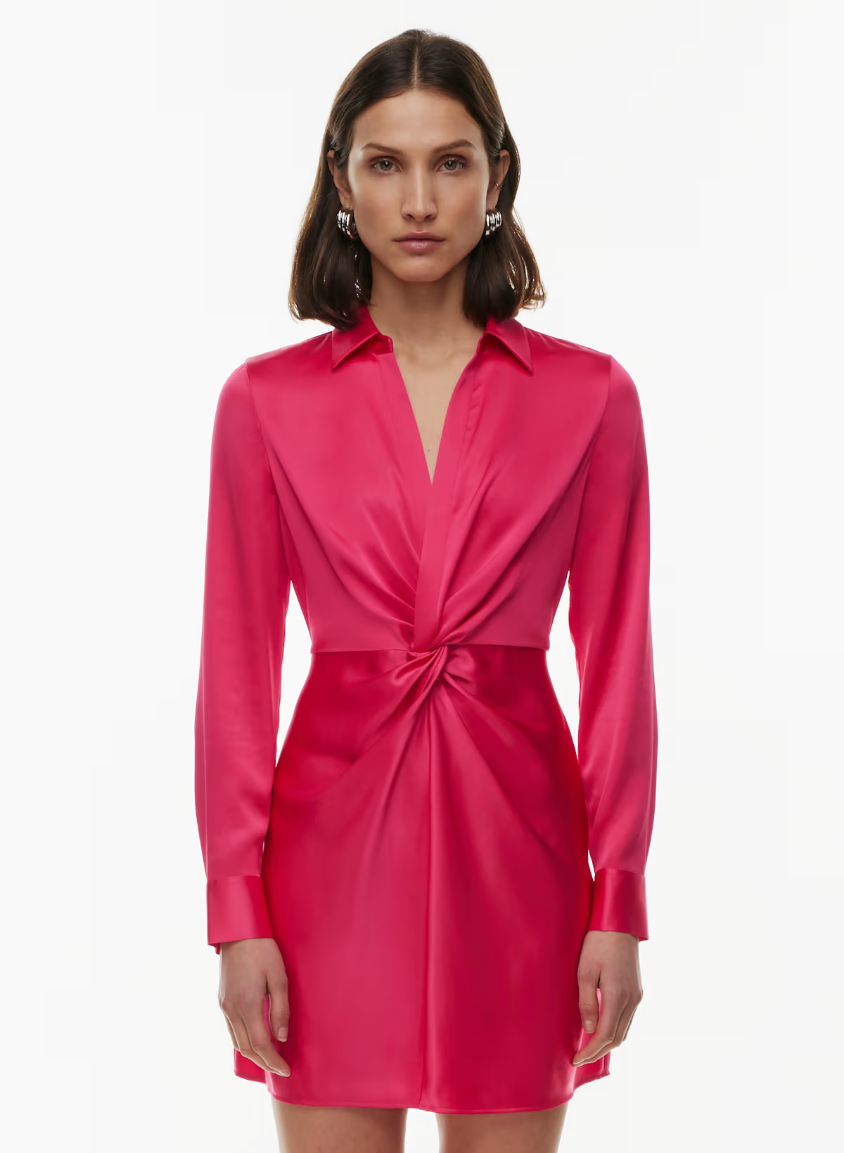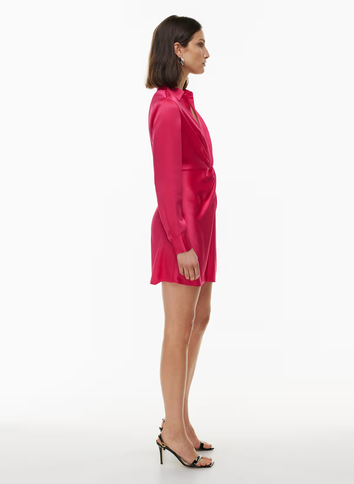 This is a mini shirt dress with ruching at the front. It’s made with Naia Renew — a drapey satin fabric with a lustrous, glossy sheen that’s extremely soft to the touch.