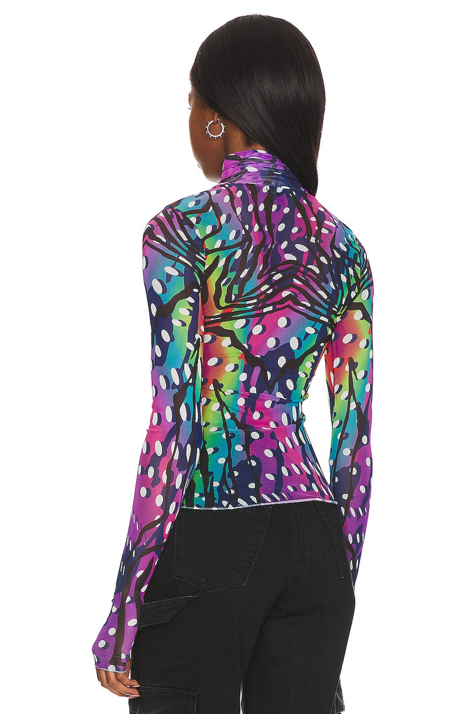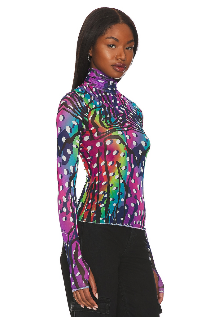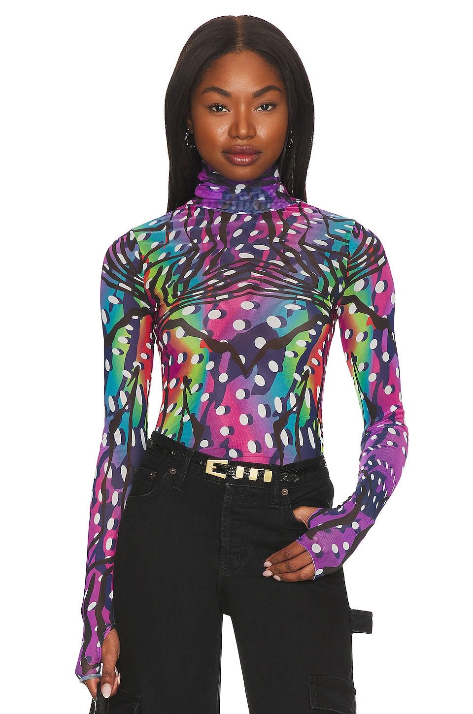 Details: The AFRM Zadie Top features a mock neck and long sleeves with thumbhole cut-outs. This top has a lightweight, semi-sheer mesh fabric. Please note that undergarments can show through.