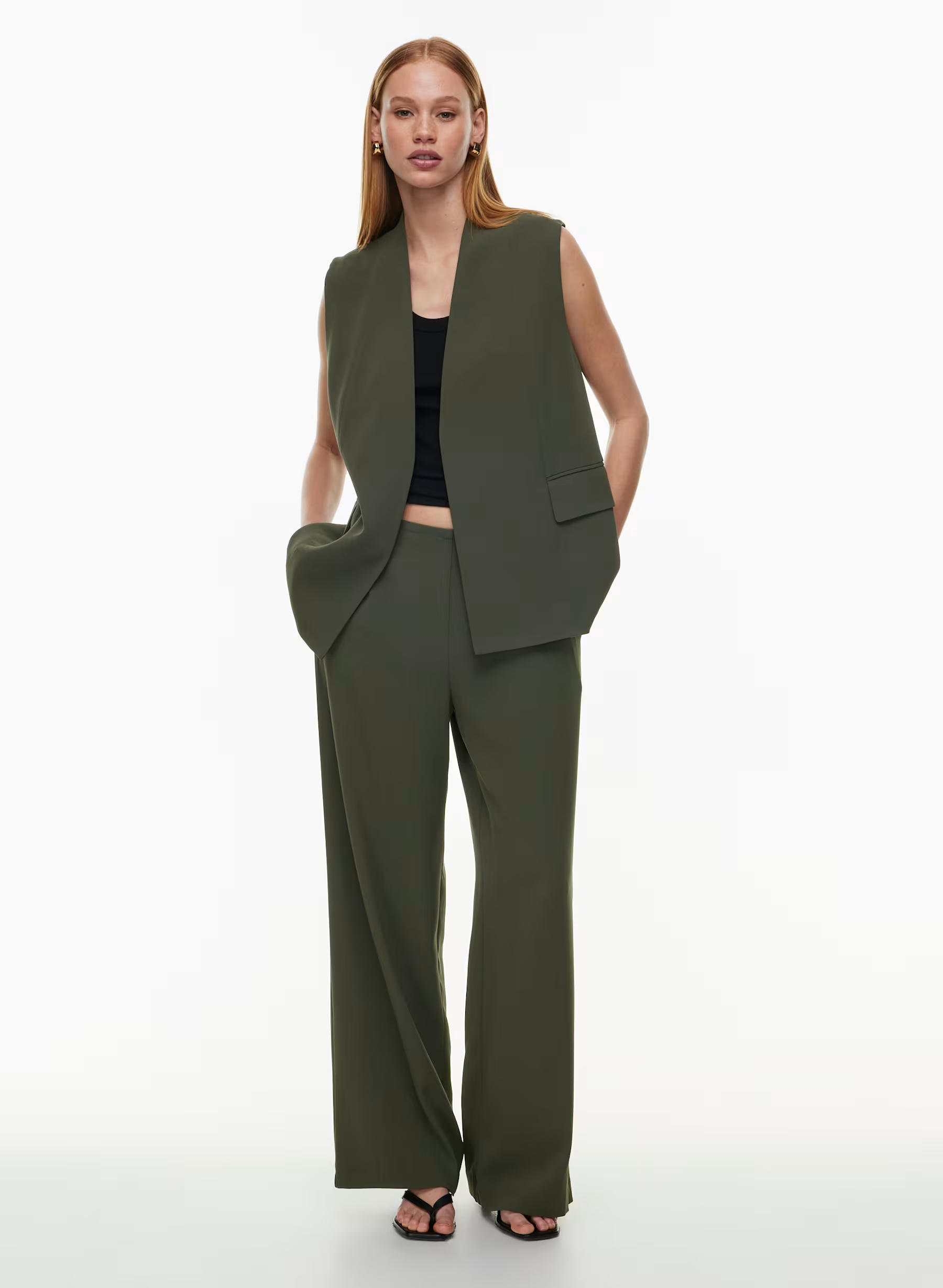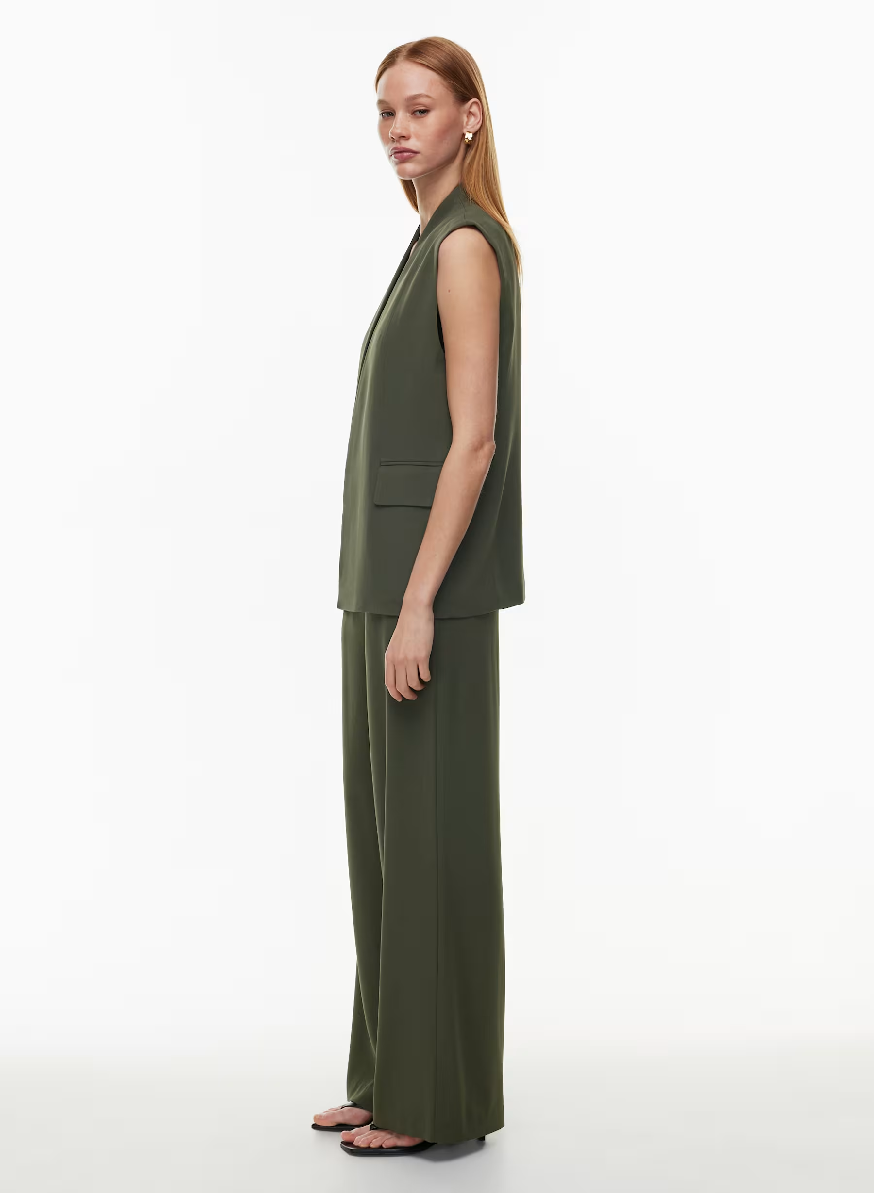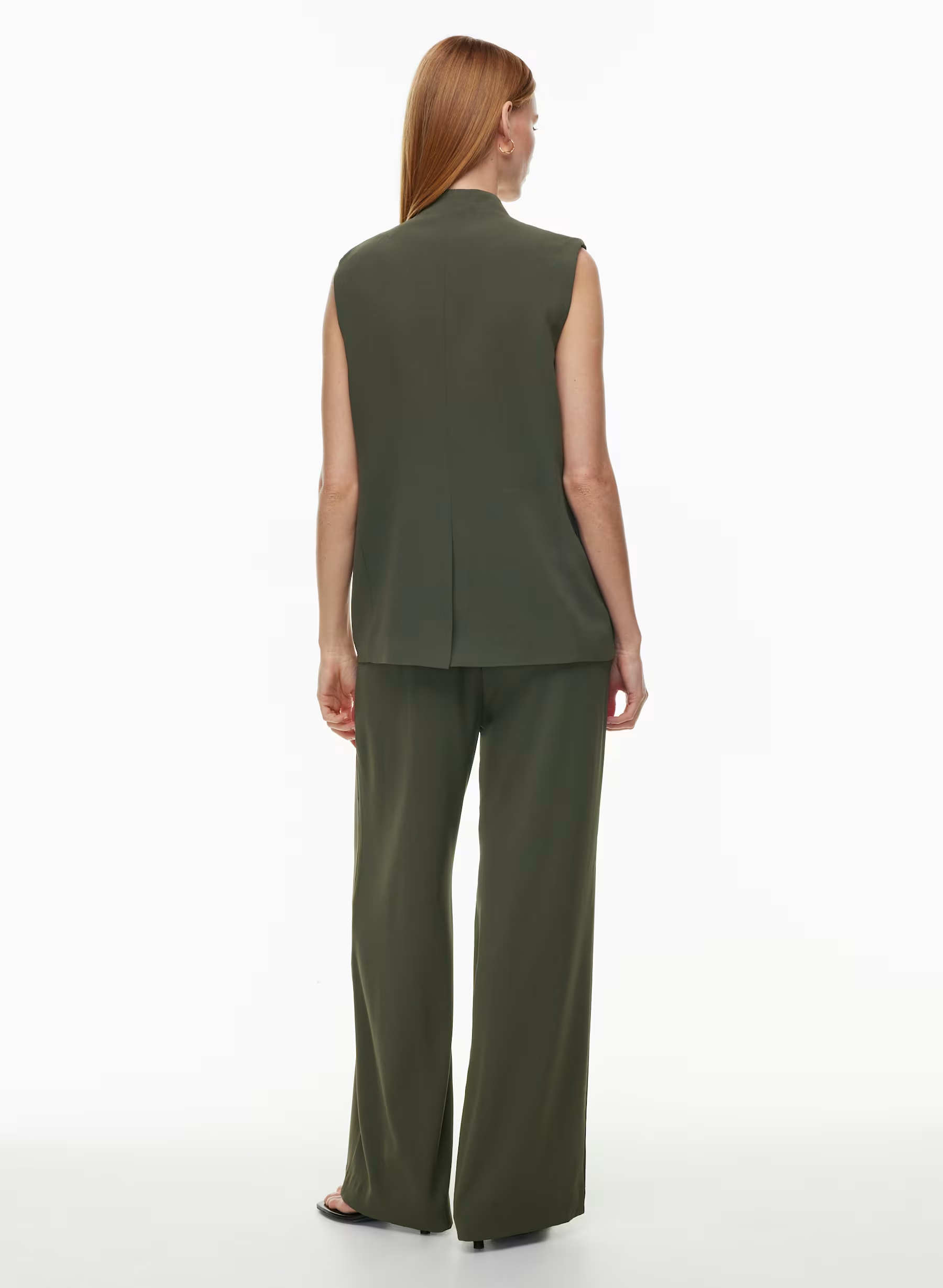 Details: This is an open-front vest with a relaxed fit, front welt pockets and a back vent. It’s made with Mirror Crepe— Babaton’s essential crepe fabric with a soft drape and silky satin back.