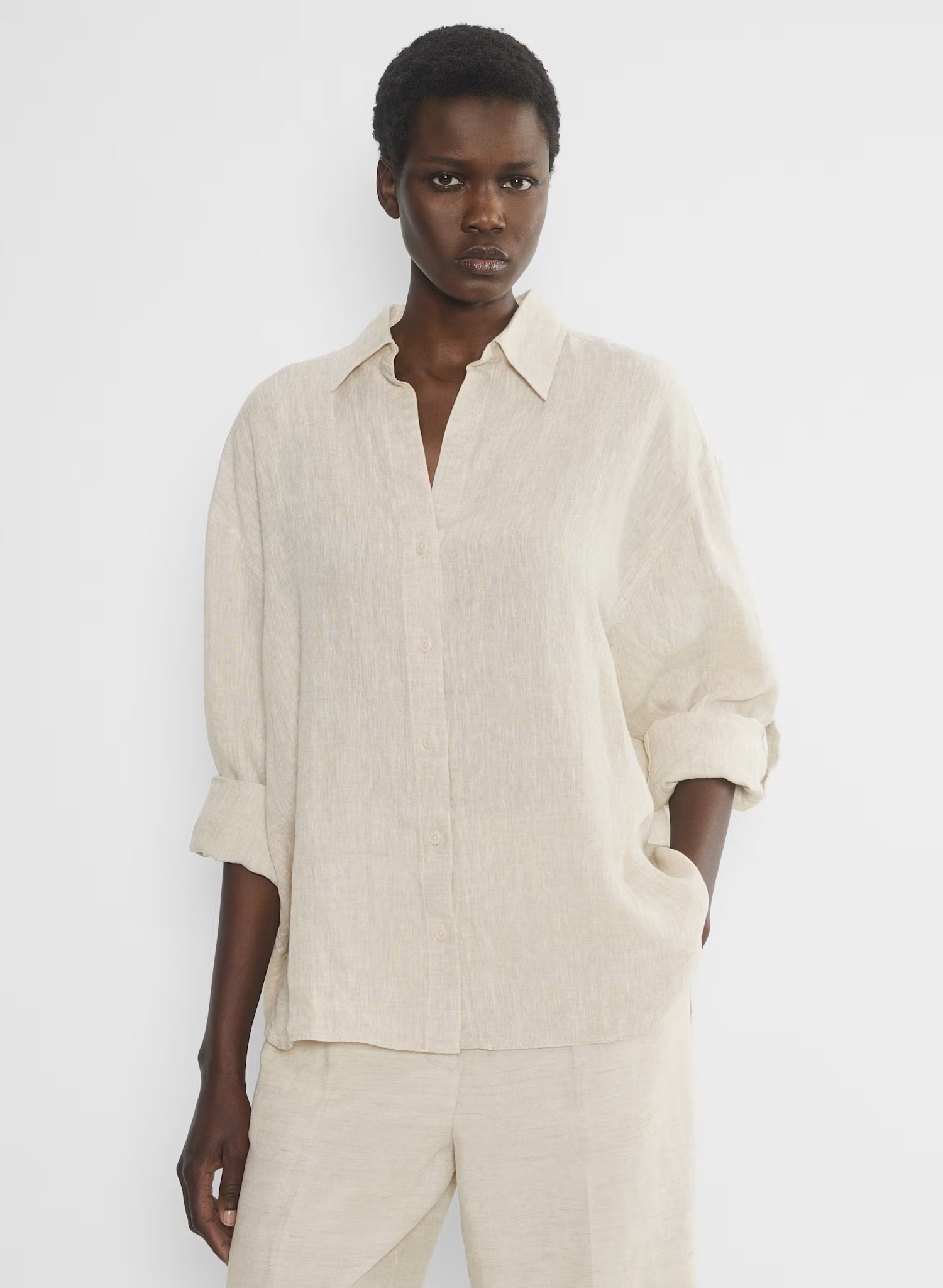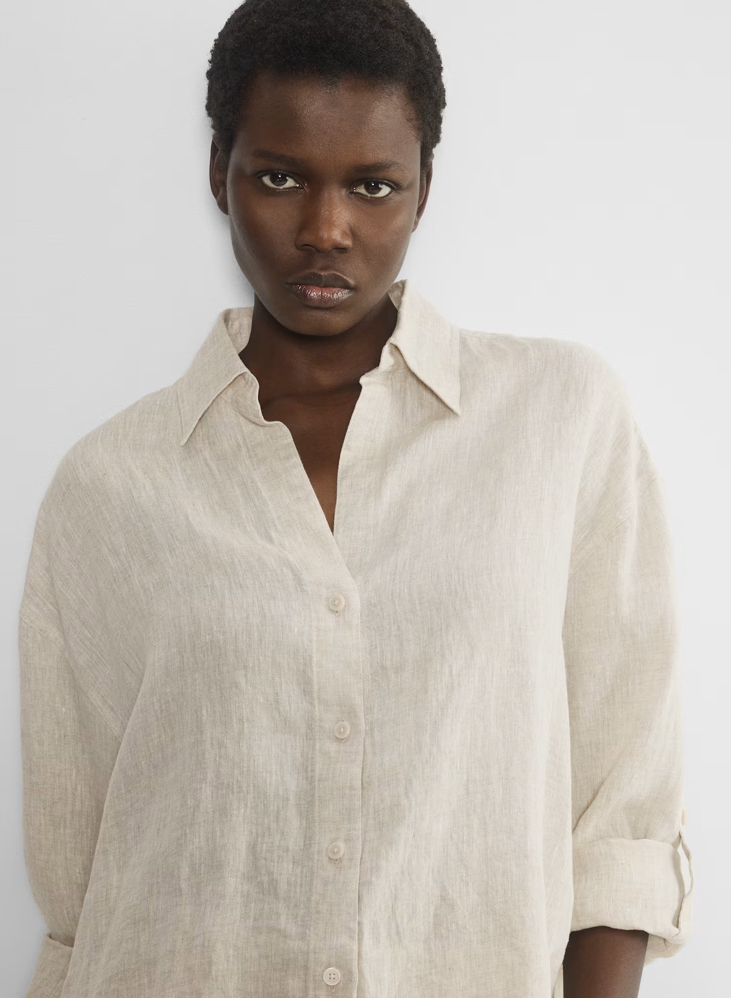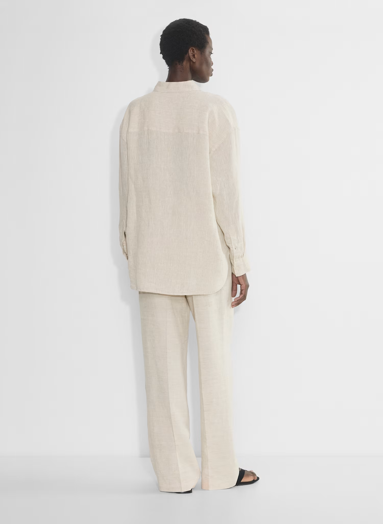 This is an oversized button-up shirt with dropped shoulders and button-closure cuffs. It’s crafted from naturally breathable 100% linen with an authentic subtle texture and soft, airy feel. The fibres are made with flax from Europe.