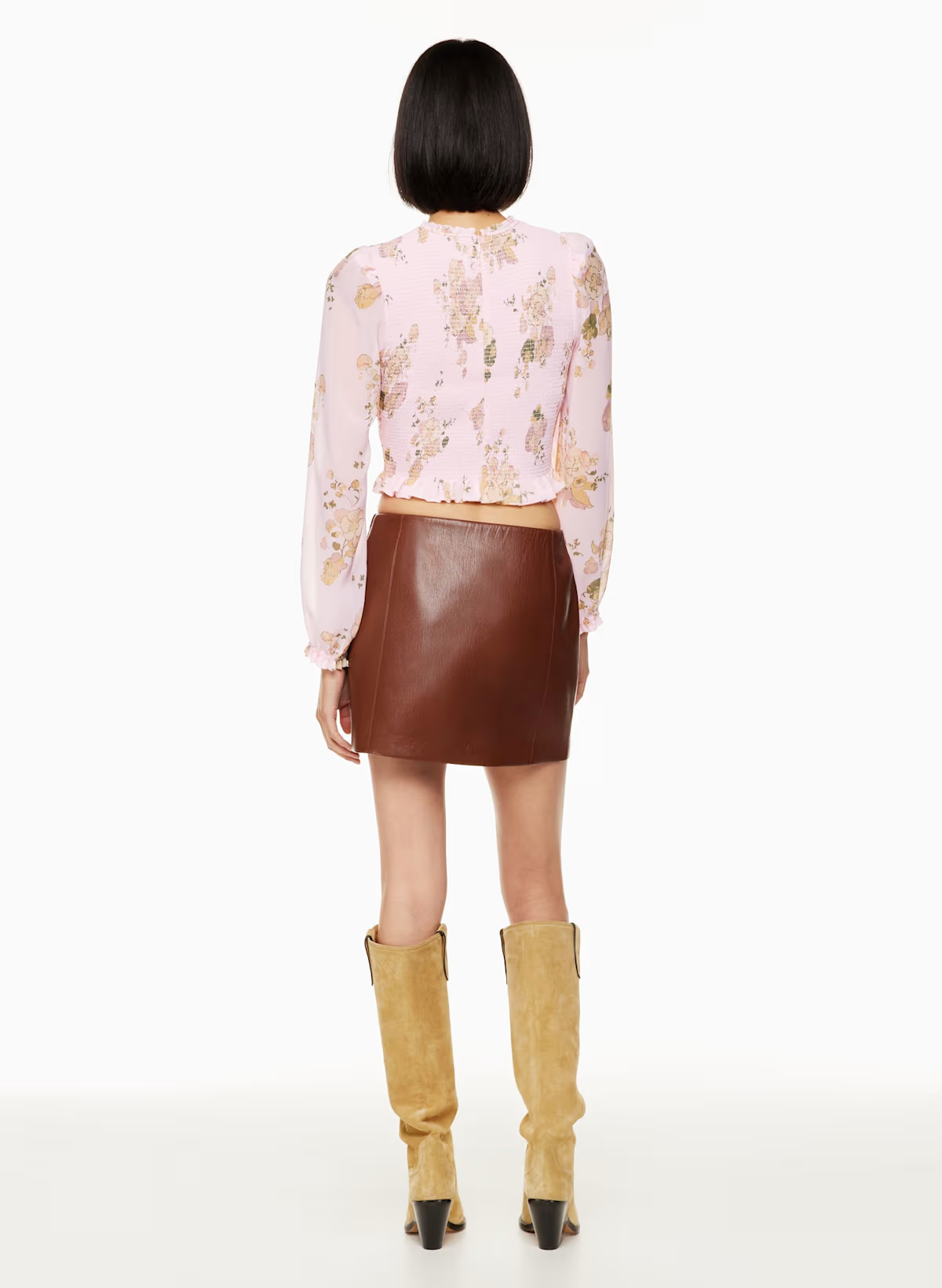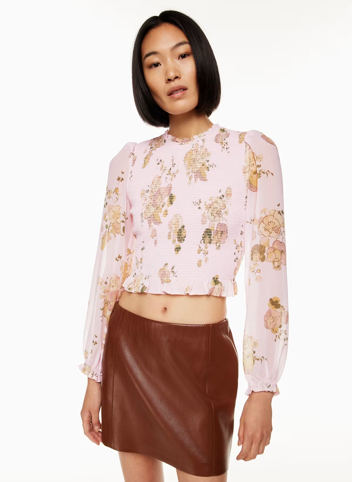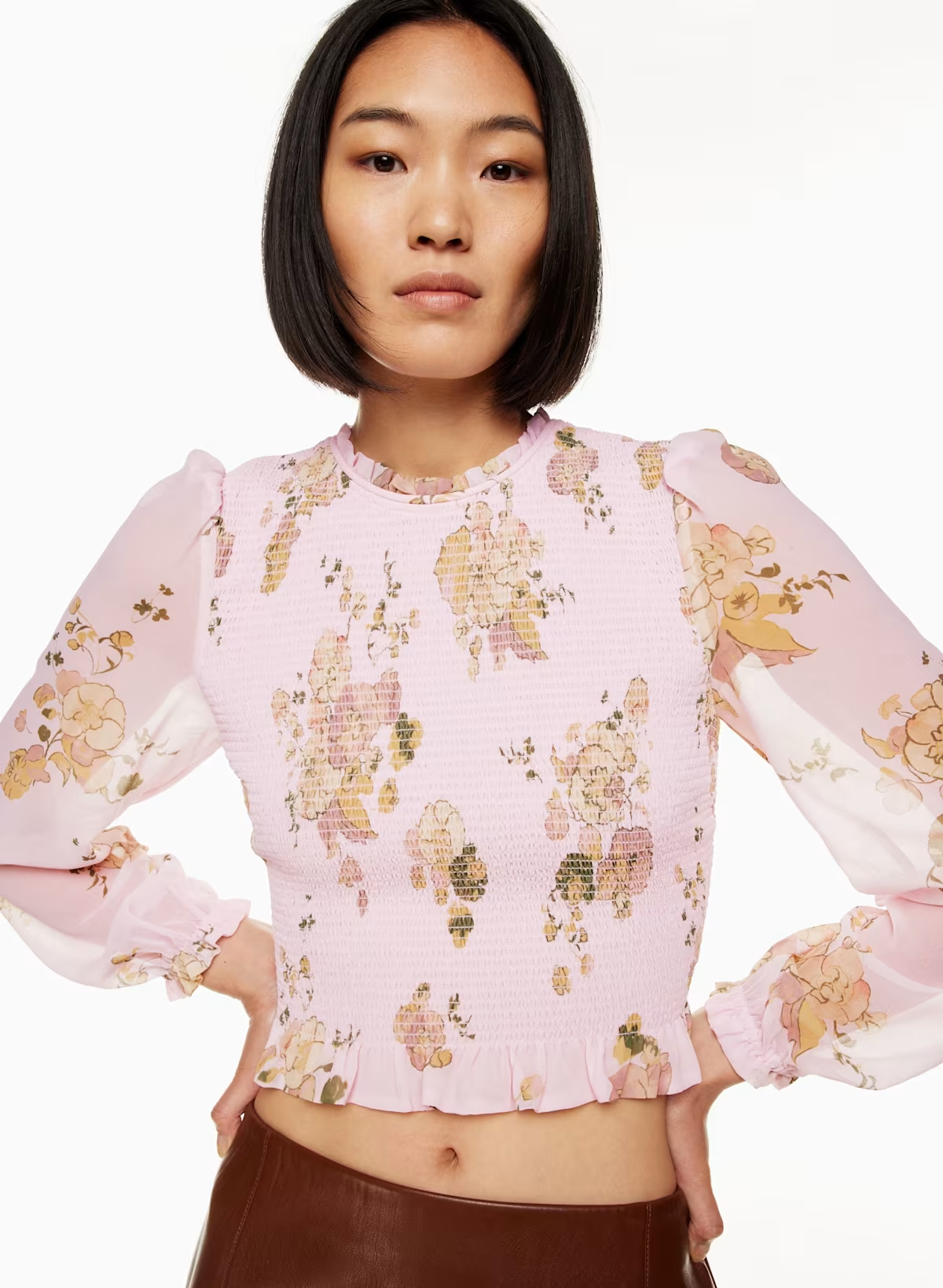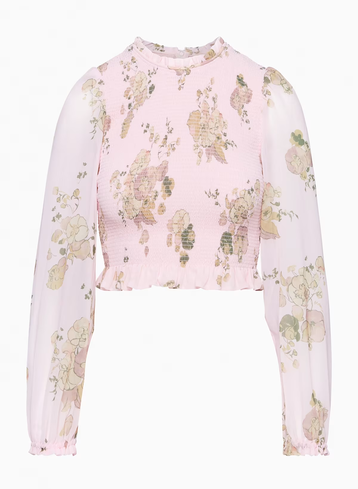 Details: This is a smocked blouse with ruffled edges and voluminous puff sleeves. It's made with Fête Chiffon — lightweight, semi-sheer fabric with an ethereal drape. This version features an exclusive floral print.