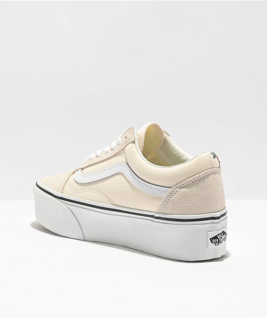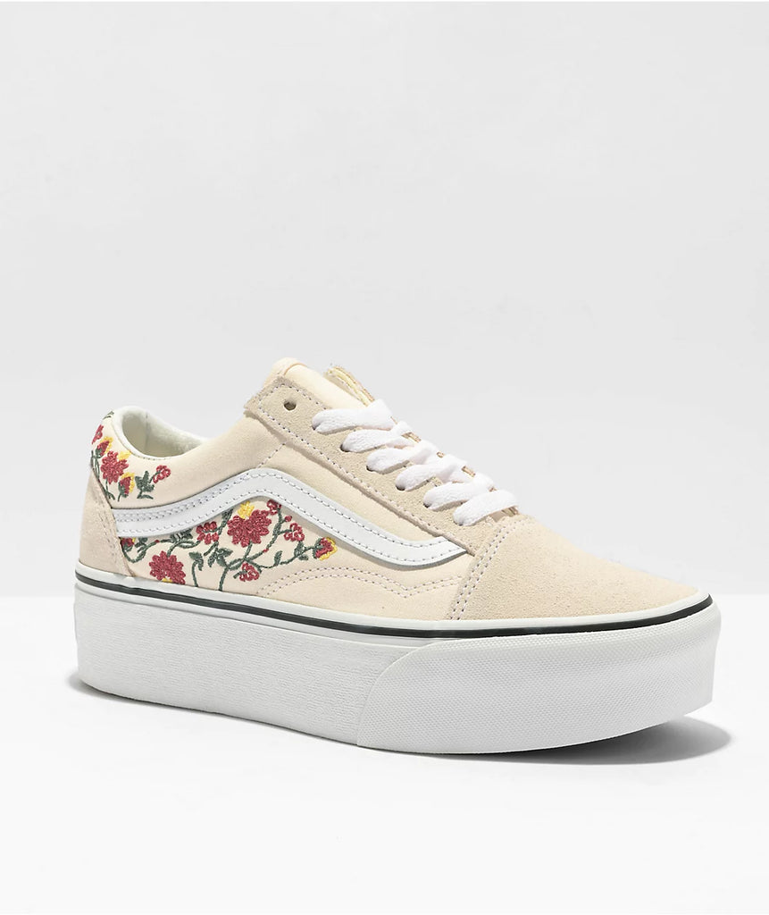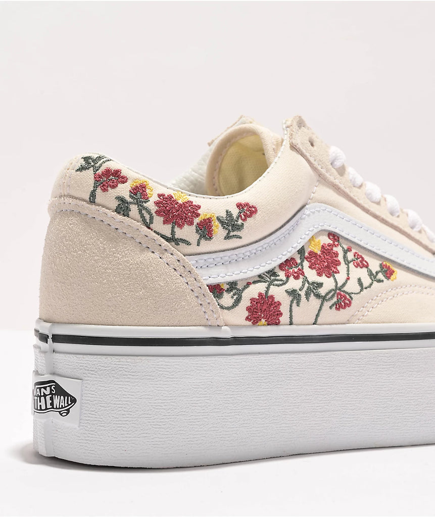 Details: The Floral Embroidery colorway of the Vans Old Skool Stackform shoes feature uppers boasting red and yellow flower detailing along the quarters. With a stylish lifted midsole, the platform silhouette is complete with white leather side stripes along the sides and Vans branding on the tongue and heel.