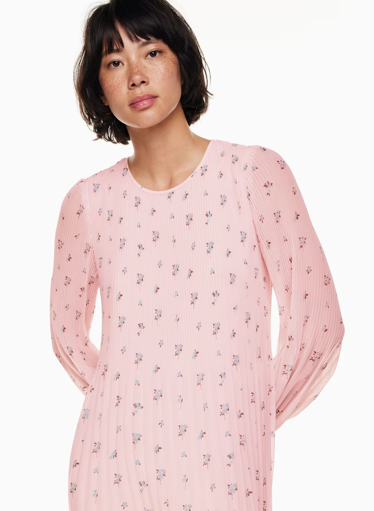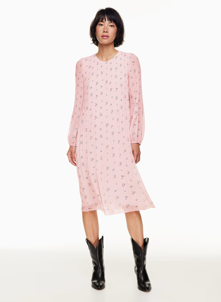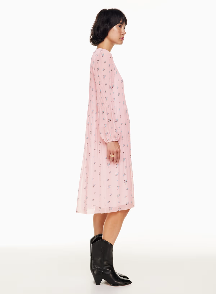 Details: This is a crew-neck midi dress with accordion pleats throughout. It’s made with Fête Chiffon — lightweight, semi-sheer fabric with an ethereal drape. This version comes in an exclusive floral pattern that's exclusive to the brand.