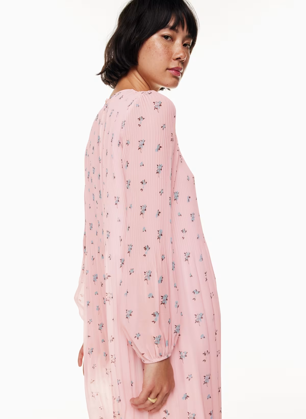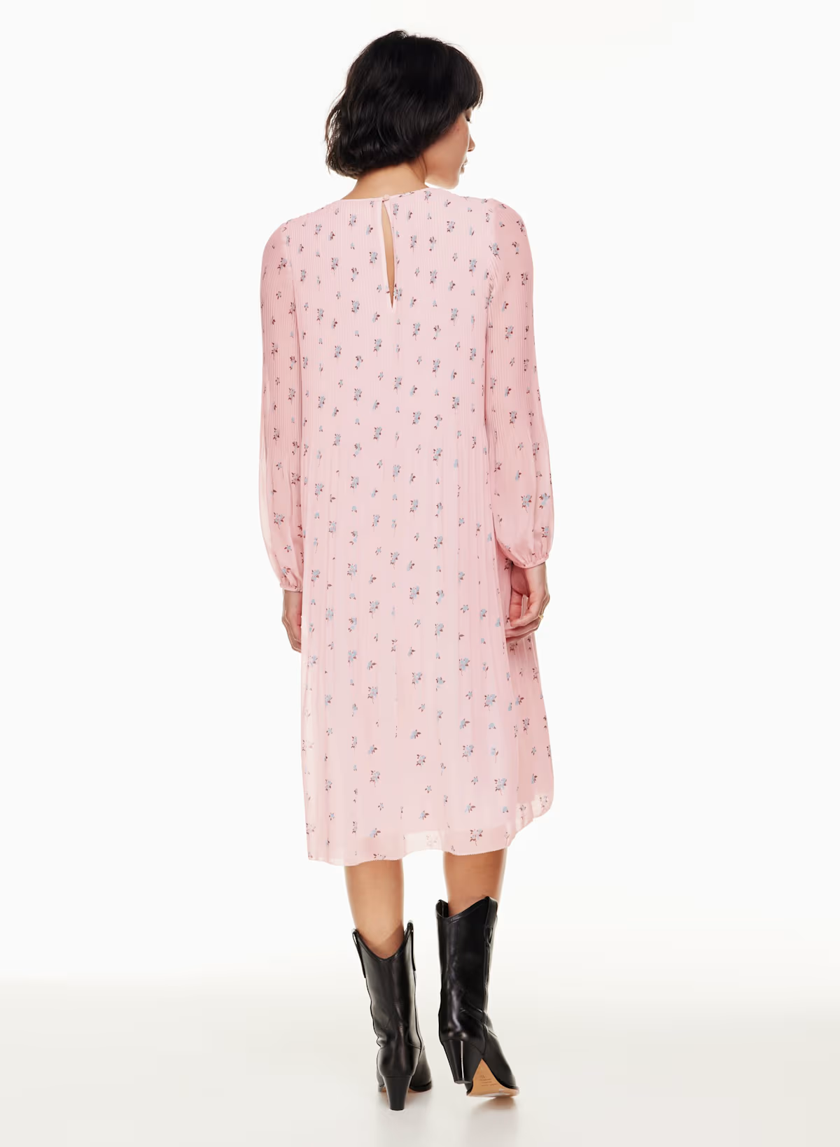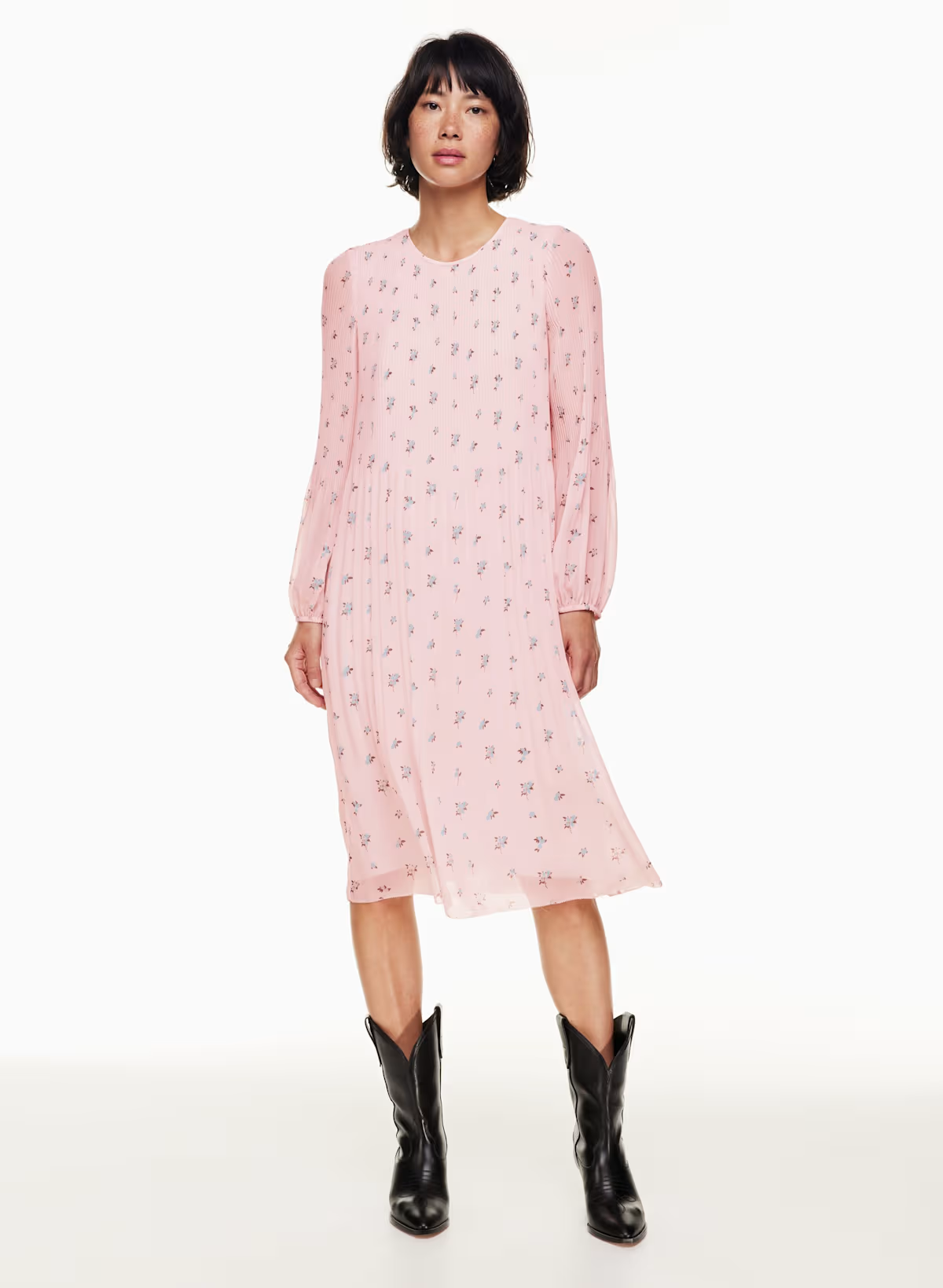 Details: This is a crew-neck midi dress with accordion pleats throughout. It’s made with Fête Chiffon — lightweight, semi-sheer fabric with an ethereal drape. This version comes in an exclusive floral pattern that's exclusive to the brand.