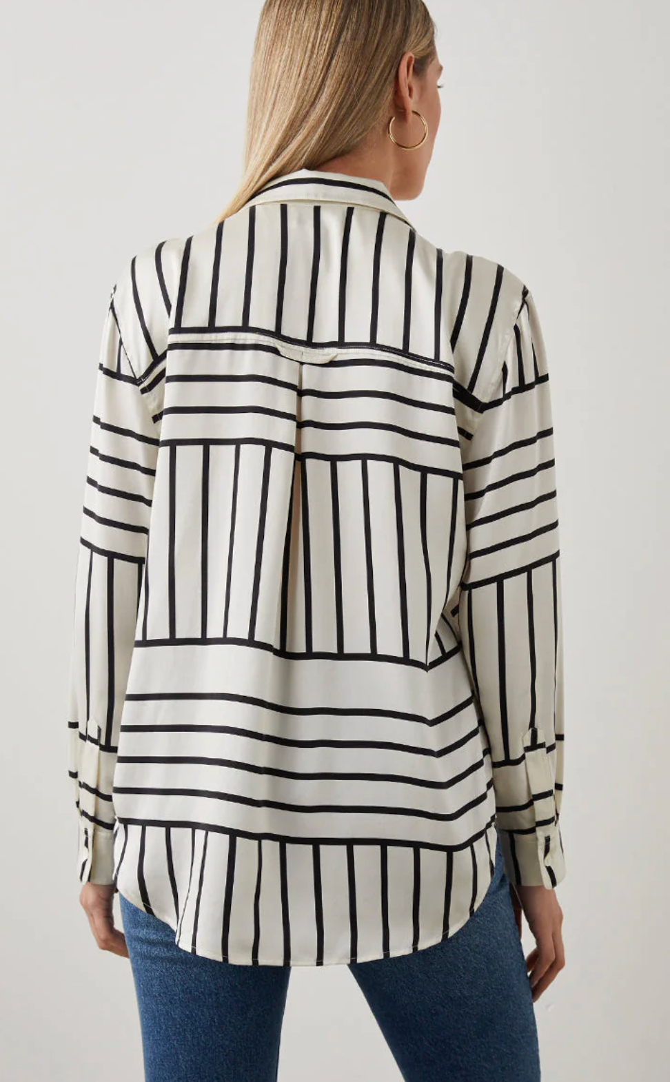 Details: The Mara Shirt puts a modern twist on a wardrobe basic with a unique, patchwork stripe design. An oversized fit makes this black-and-white shirt versatile for layering, and best of all, itโs done in 100% silk that looks as luxe as it feels.