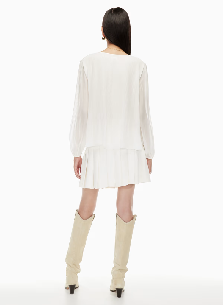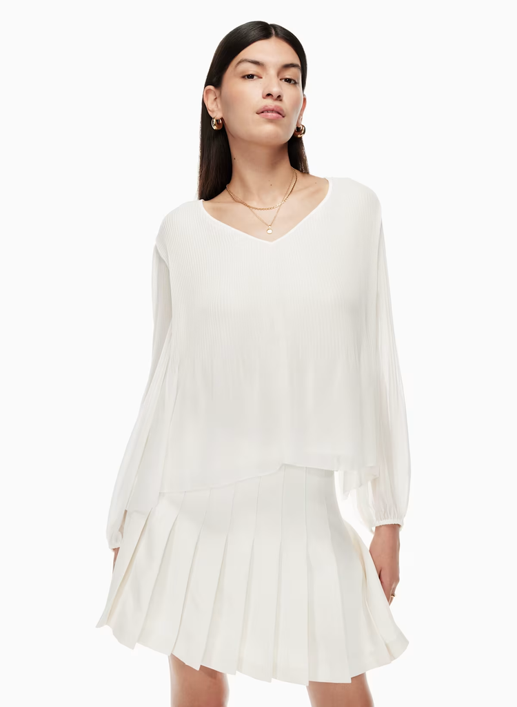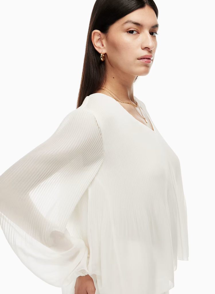 Details: This is a long-sleeve V-neck trapeze blouse with accordion pleats throughout. It’s made from Fête Chiffon — lightweight, semi-sheer fabric with an ethereal drape.