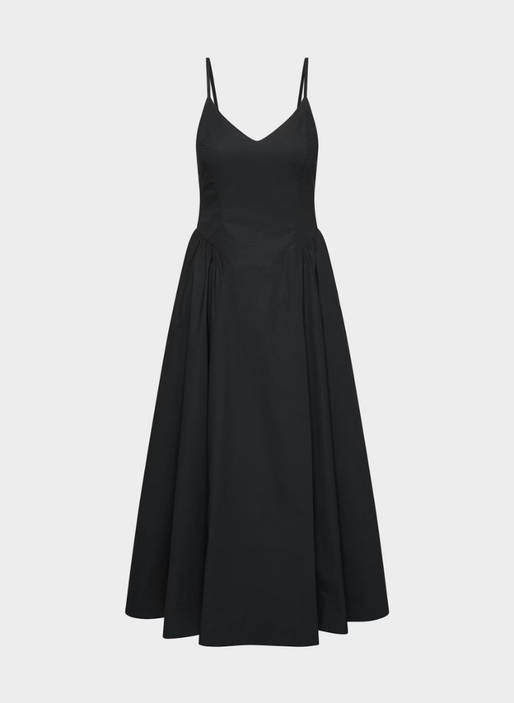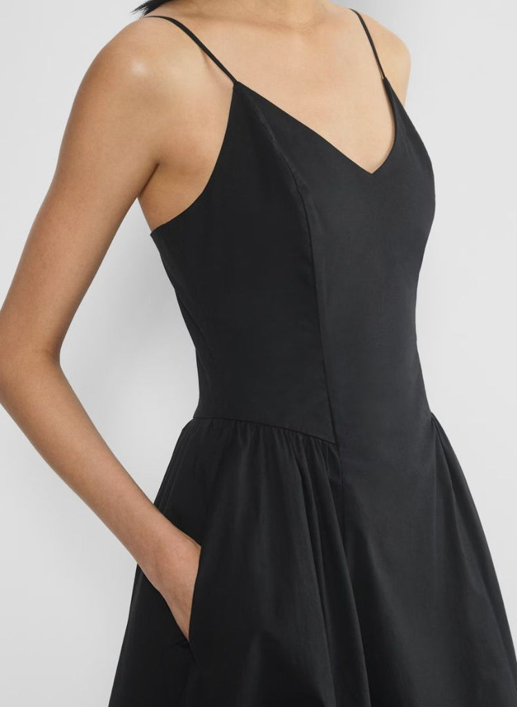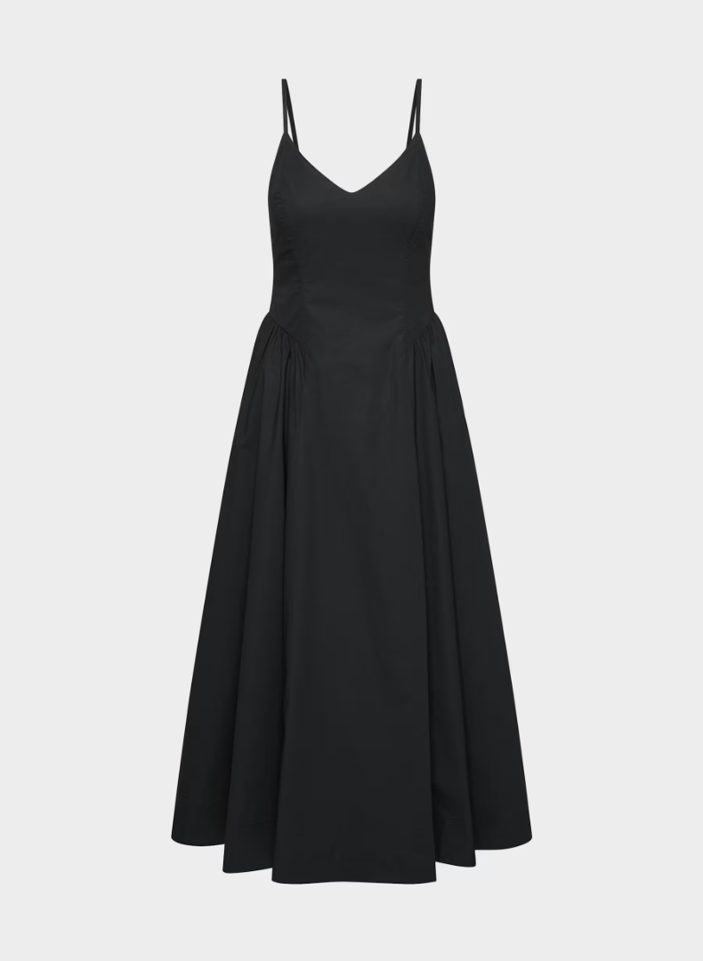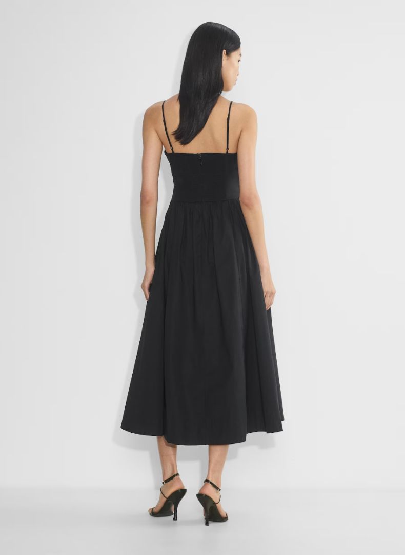 This is a V-neck fit-and-flare dress with a smocked back and adjustable straps. It’s made from lightweight poplin with a smooth, airy feel and a touch of stretch for comfort.