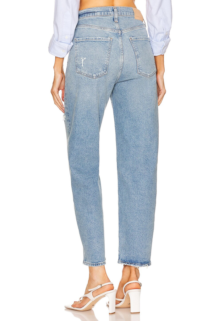 Details: 5-pocket design. Light whiskering and fading detail. Intentionally distressed areas.