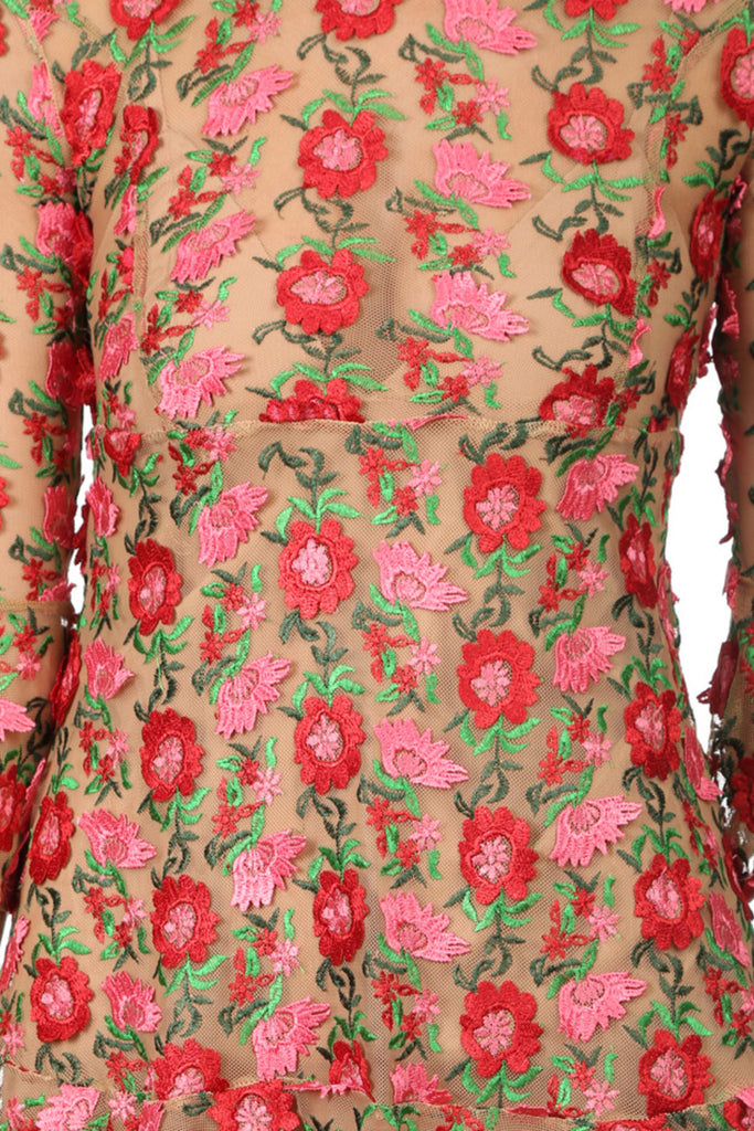 Details: A bed of embroidered roses provide clever coverage to this sheer mesh mini. Elbow length sleeves are finished with a charming ruffle edge to mimic the hem of the ultra shirt skirt. Slip dress included.
