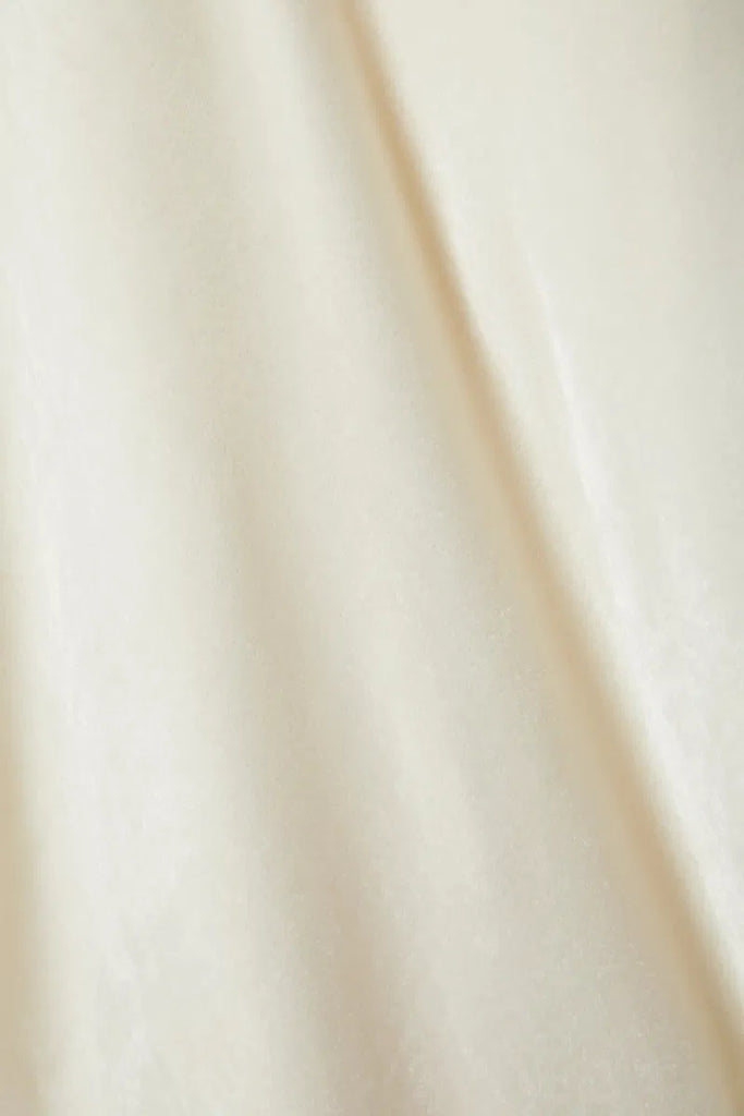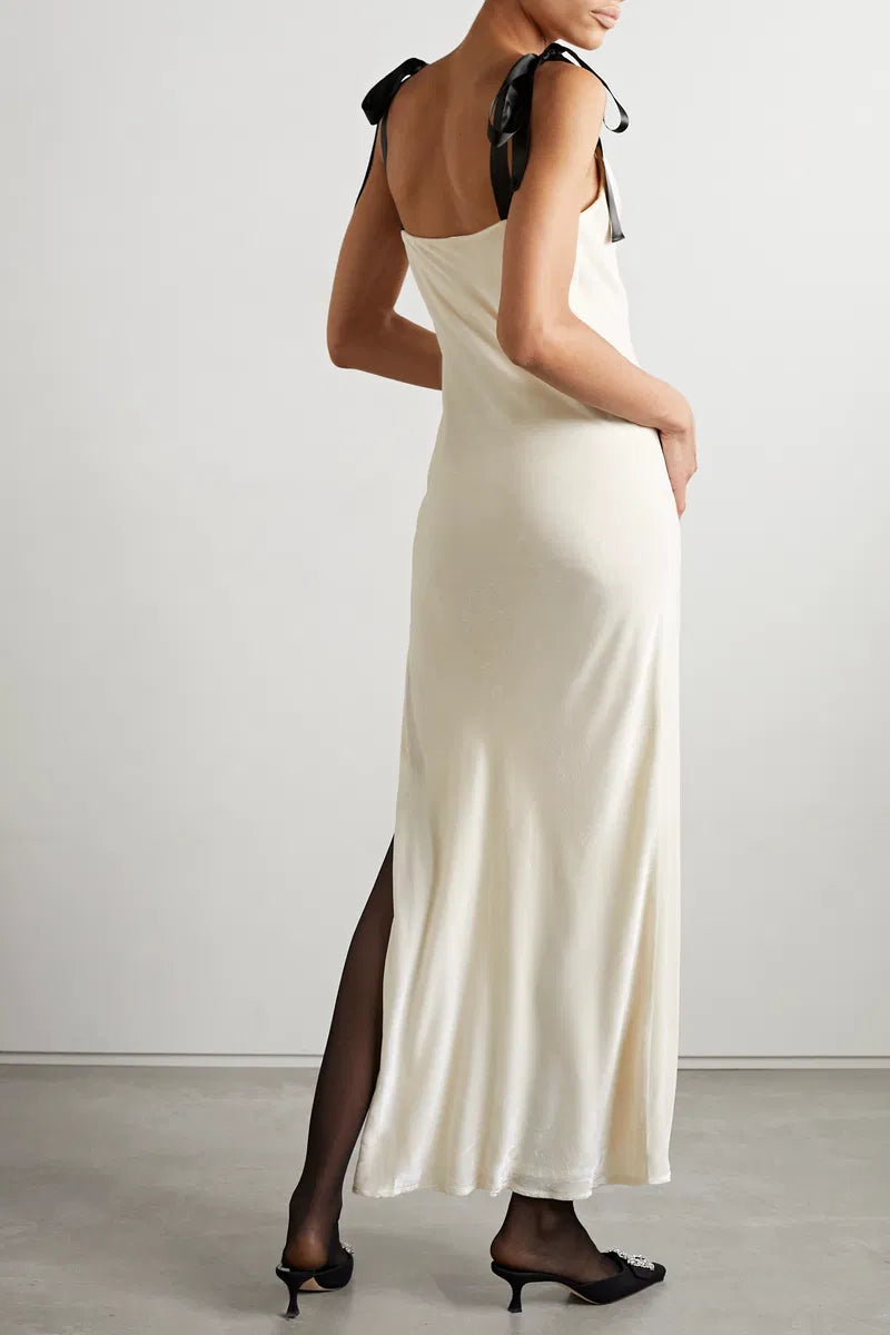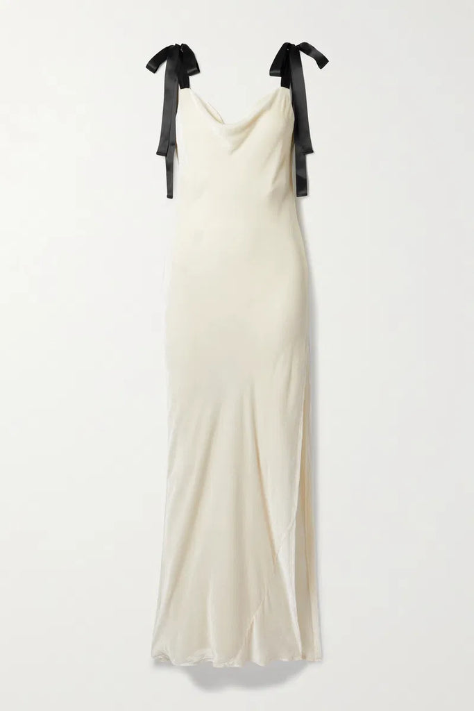 Details: Reformation's 'Nya' maxi dress is designed with adorable satin bows at the shoulders that add a touch of playfulness. Cut from smooth off-white velour, it has an elegantly draped neckline and thigh-high split. Style yours with sparkly jewelry for your next occasion.