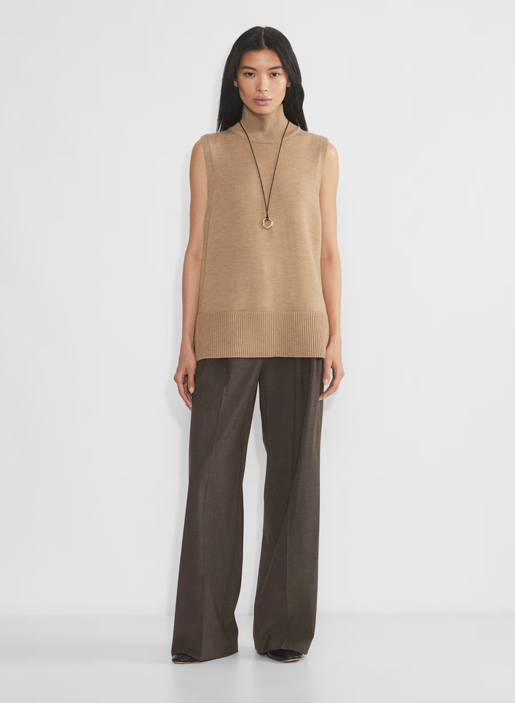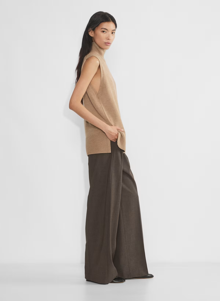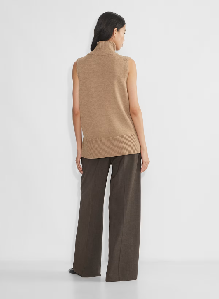 This is a fully fashioned turtleneck sweater vest with ribbed trim. It’s knit with Embrace Merino™ — extra-fine 100% merino wool yarn coveted for its natural warmth and super soft feel. We source ours from a premium Italian mill. It’s constructed with a Jersey stitch for a soft drape and a smooth, flat feel.