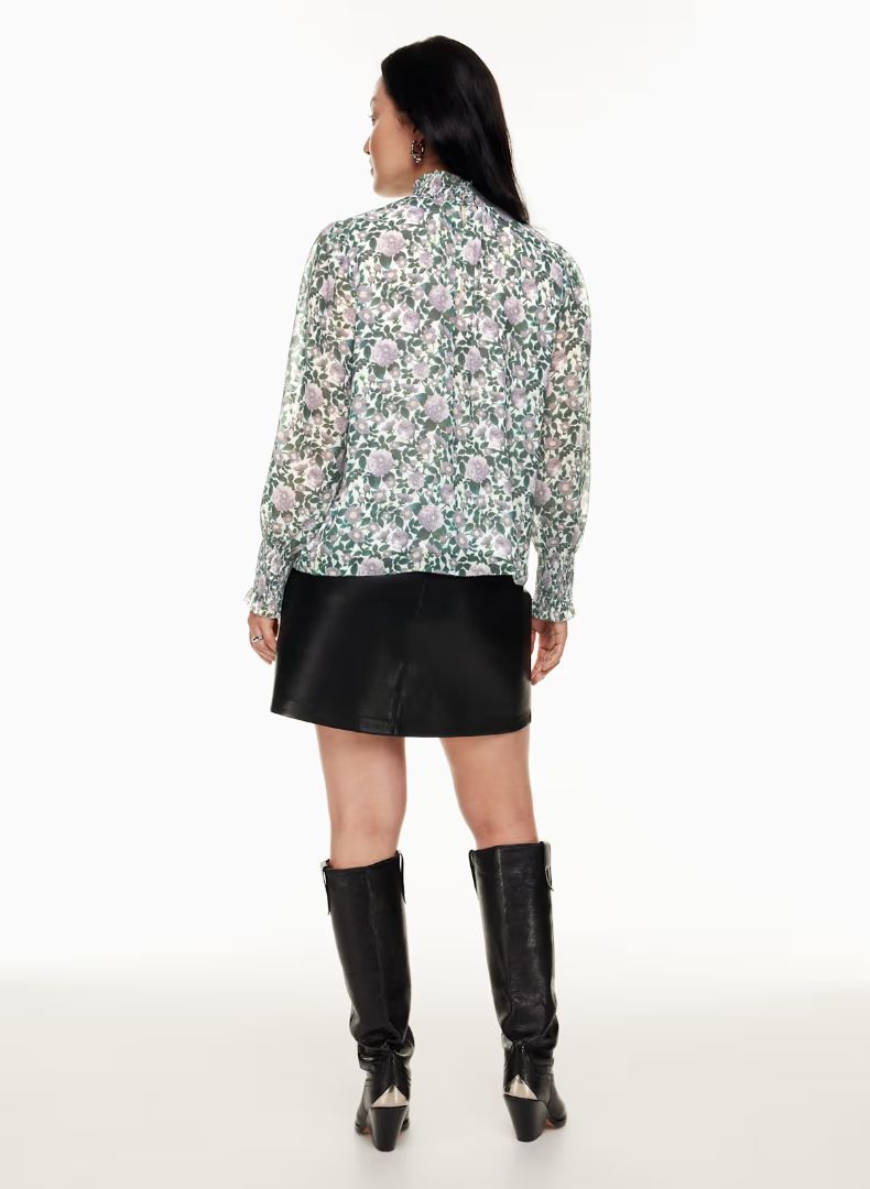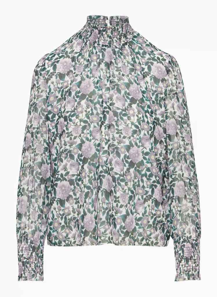 This is a mock-neck blouse with puff sleeves and smocking details. It's made with Fête Chiffon — lightweight, semi-sheer fabric with an ethereal drape.